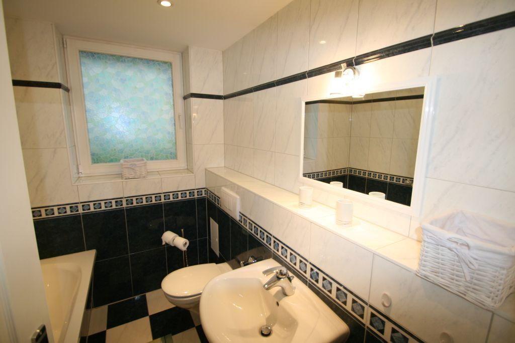 Ein helles und modernes Bad mit Fenster und Badewanne (untere Etage) sowie ein separates Gäste-WC (obere Etage) runden den Gesamteindruck dieser hell und freundlich eingerichteten Ferienwohnung ab.