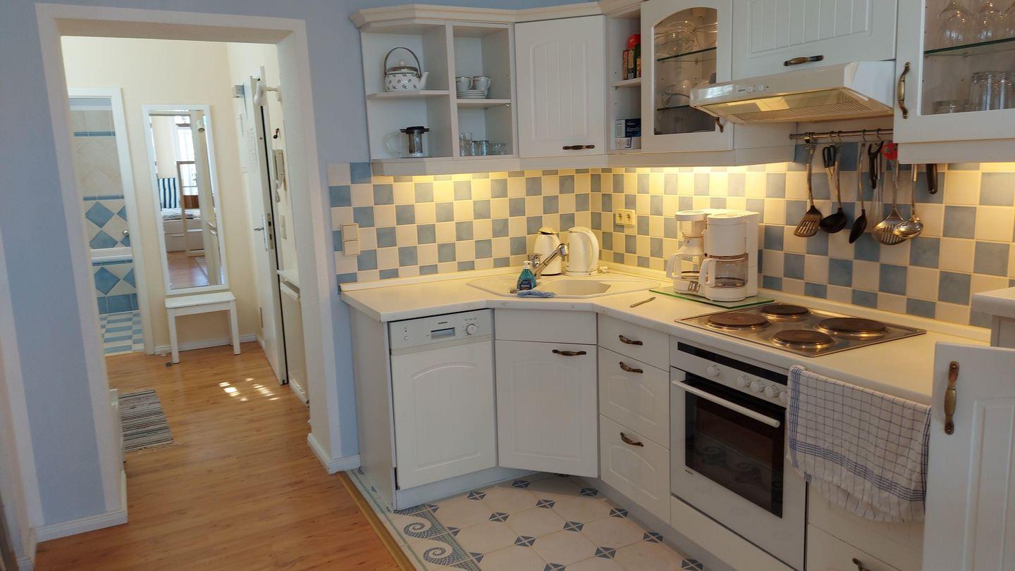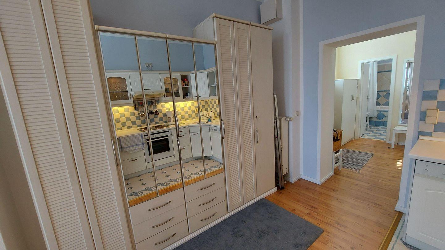 Die moderne Küche mit Geschirrspüler, Kaffeemaschine und Tiefkühlfach lässt keine Wünsche offen. Das Bad mit Badewanne und Waschmaschine bietet zusätzlichen Komfort. Besonders zur Hansesail erleben Sie die maritime Atmosphäre hautnah: Beobachten Sie die stolzen Segler direkt von Ihrem Balkon aus und fühlen Sie sich mittendrin.