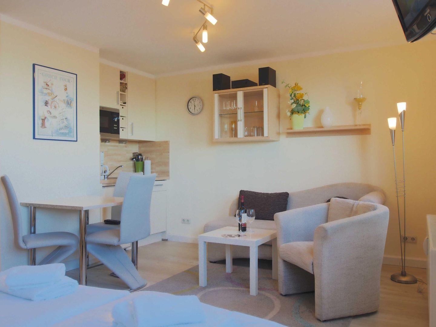 Diese charmante Wohnung im 1. Obergeschoss bietet alles, was Sie für einen entspannten Aufenthalt zu zweit brauchen. Auf 27m² erwartet Sie ein liebevoll eingerichtetes Wohn-Schlafzimmer mit bequemem Sofa, TV und kleinem Esstisch – perfekt zum Entspannen oder für ein gemütliches Frühstück am Morgen.