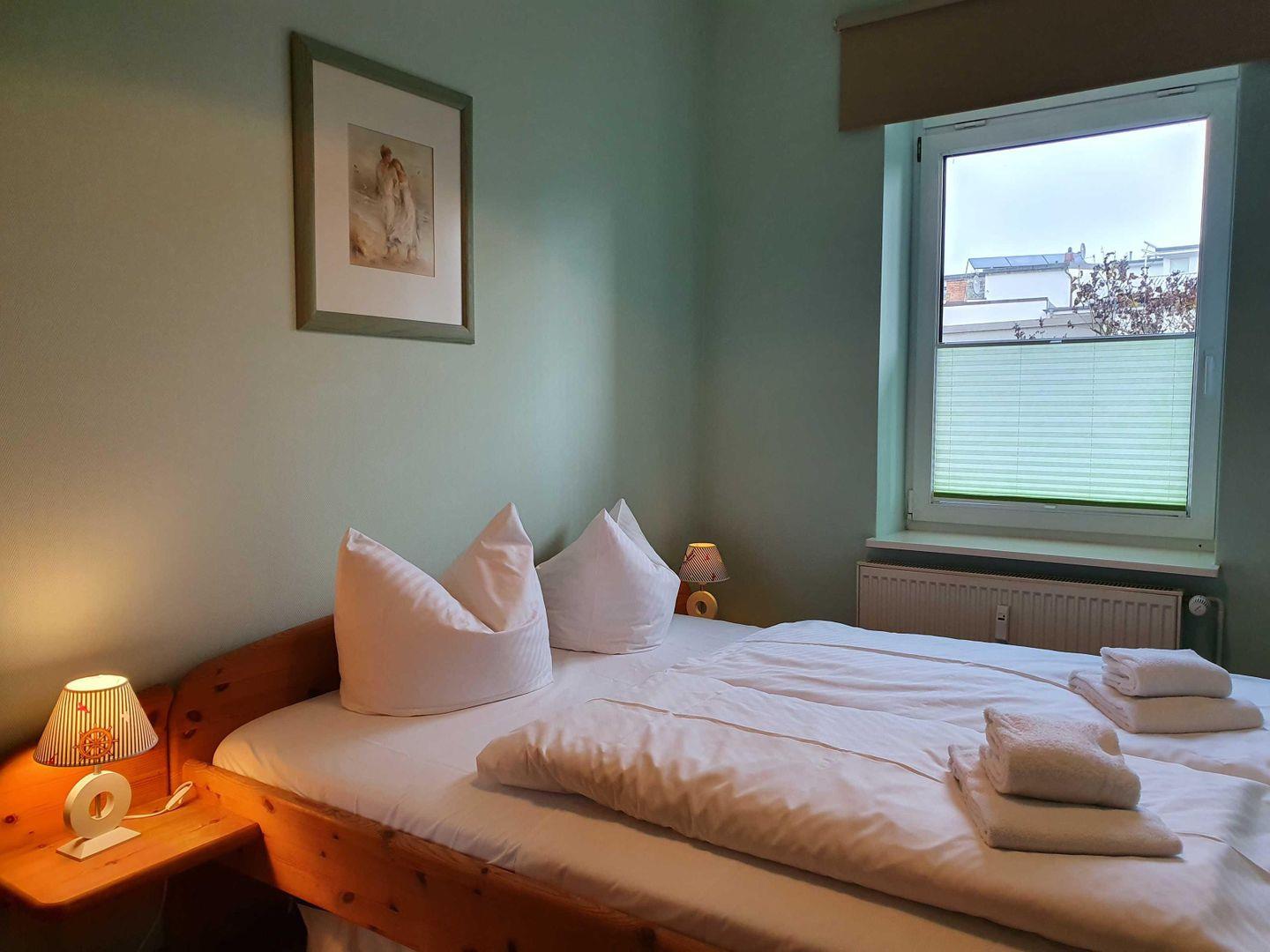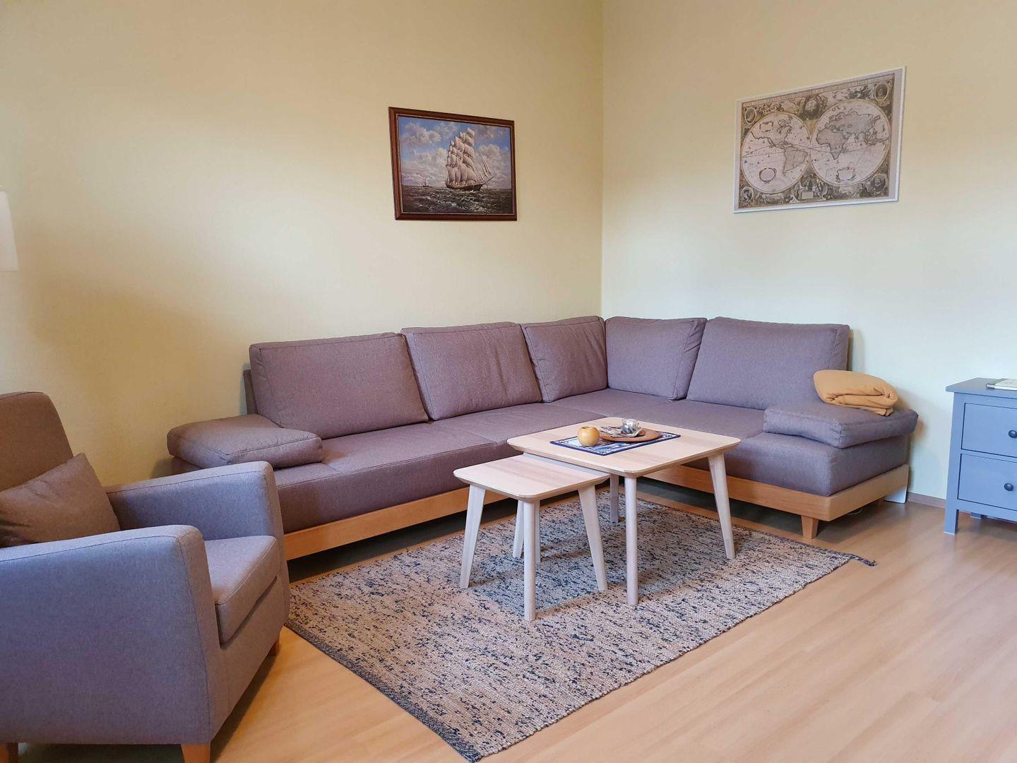 Im gemütlichen Wohnzimmer erwartet Sie ein Flachbild-TV sowie eine bequeme Schlafcouch, die sich perfekt für zusätzliche Gäste eignet. Das Schlafzimmer mit komfortablem Doppelbett lädt zu erholsamen Nächten nach einem Tag am Meer ein.