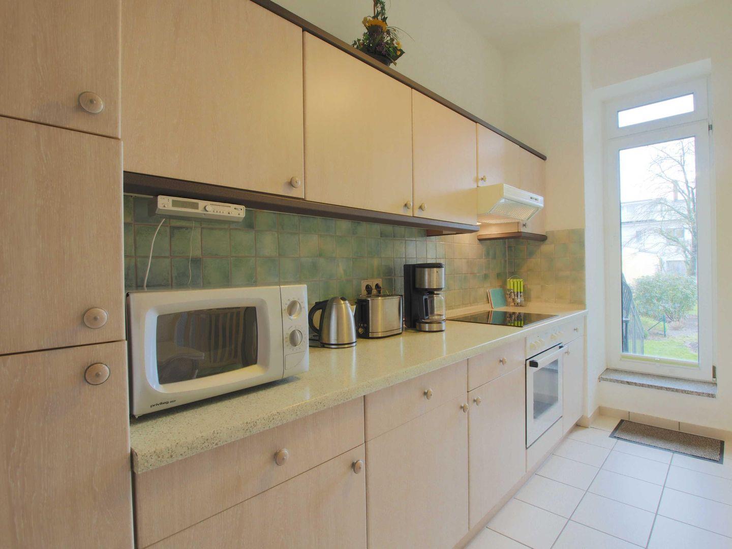 Die gut ausgestattete Küche mit Essecke bietet alles, um gemeinsam zu kochen und den Tag gemütlich zu starten. Von hier aus gelangen Sie direkt auf den Balkon mit Zugang zum Garten – perfekt, um bei einer Tasse Kaffee die frische Seeluft zu genießen.