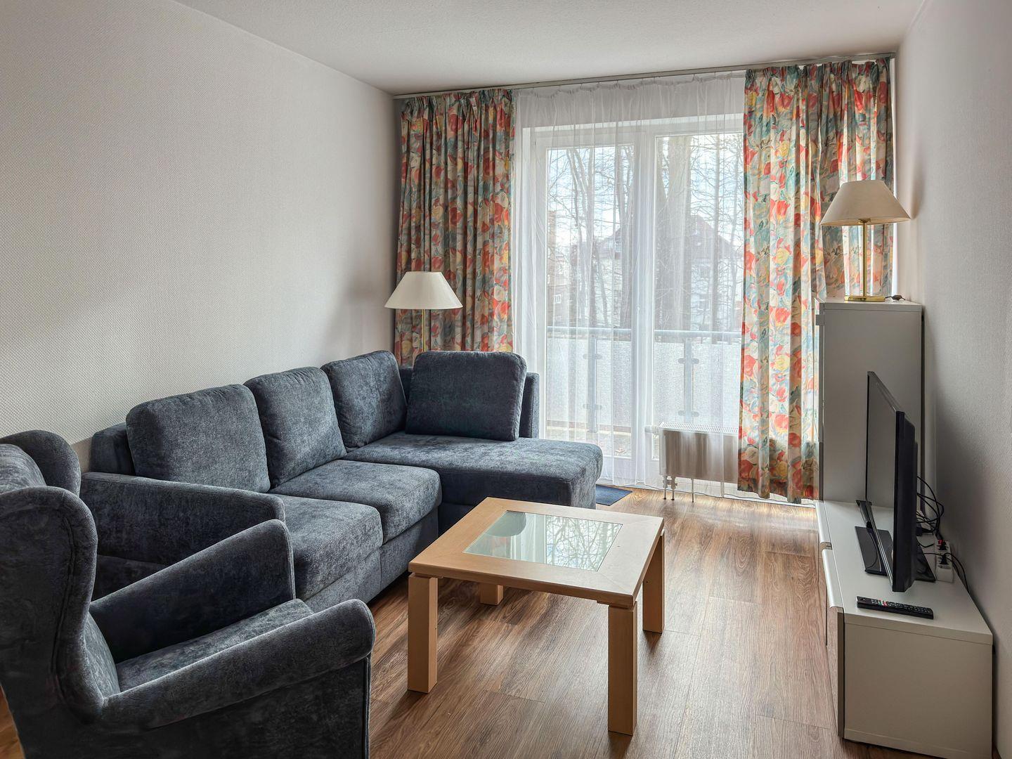 Der offene Wohnbereich bildet das Herzstück der Ferienwohnung und verfügt über eine gemütliche Sofaecke, die auch als Schlafmöglichkeit dient, sowie einen Essplatz. Von hier aus betreten Sie den Balkon mit Gartenblick, der mit Gartenmöbeln ausgestattet ist und zum Entspannen im Freien einlädt.