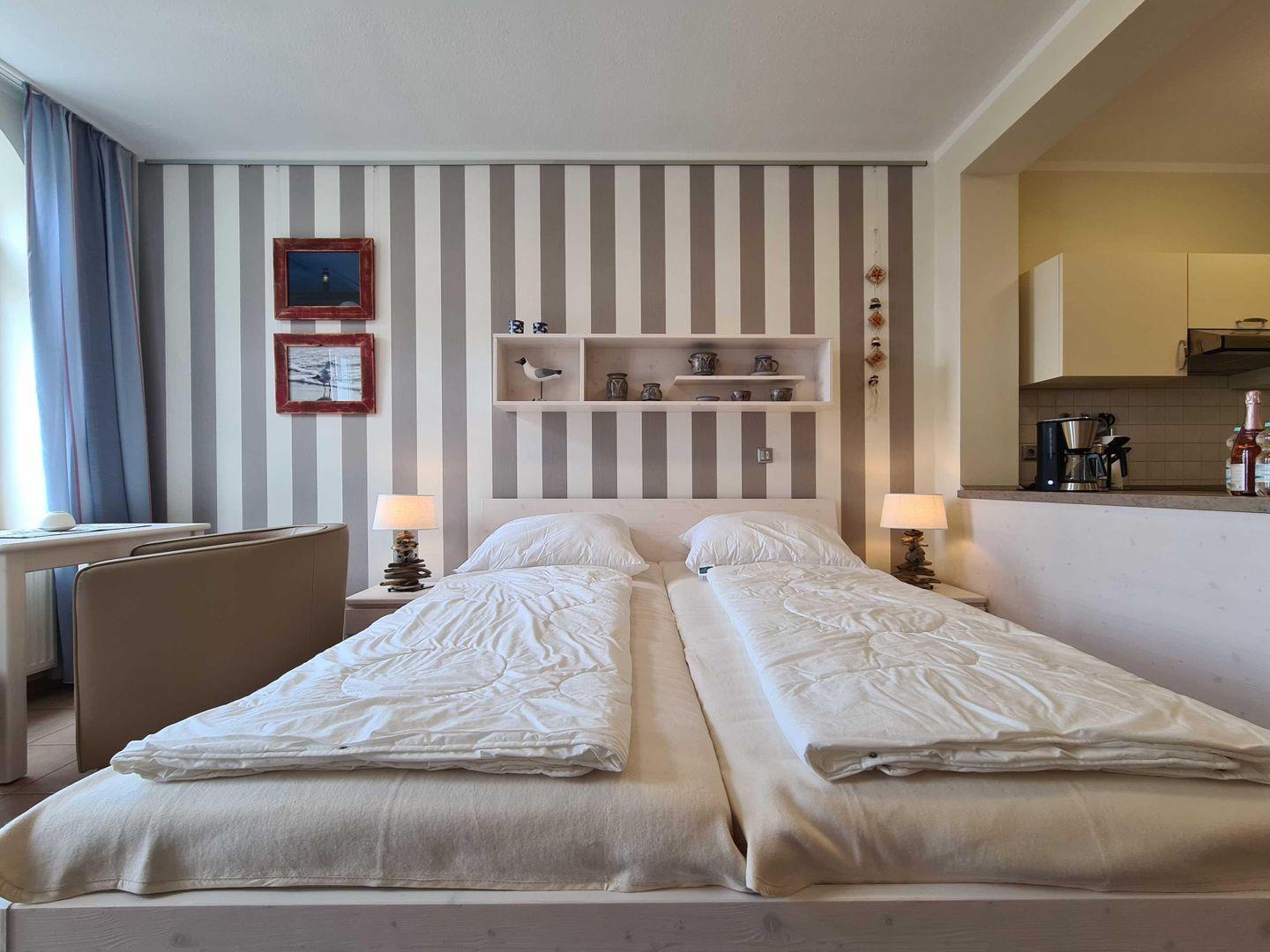 Gemütliche 1-Zimmer-Ferienwohnung (ca. 30 m²) für zwei Personen mit modernem Wohnkomfort. Helles Wohn-/Schlafzimmer mit Doppelbett, Sitzecke, Flachbild-TV und Musikanlage, voll ausgestattete Küchenzeile und Duschbad. Highlight ist die sonnige Balkonterrasse mit herrlichem Blick auf Leuchtturm und Dünen – perfekt zum Entspannen und Genießen!
