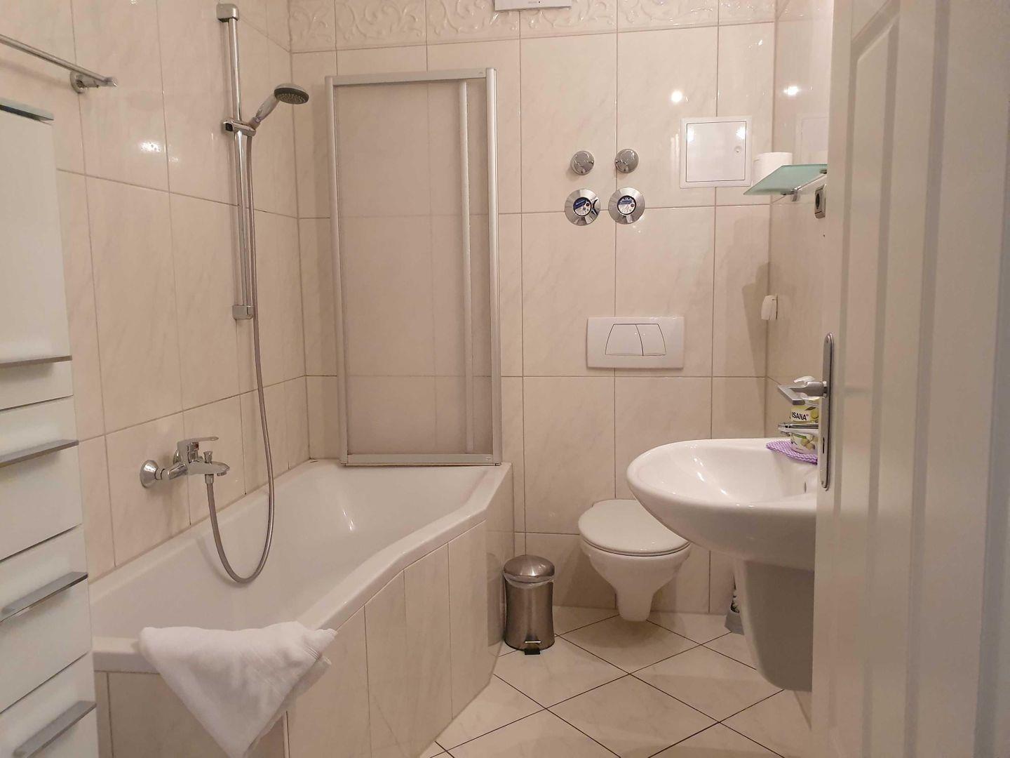 Das Badezimmer verfügt über eine Badewanne mit integrierter Dusche sowie über Waschbecken, WC, Handtücher, Spiegel und warmes Wasser. Ein Staubsauger sorgt für die einfache Reinigung während Ihres Aufenthalts. Zentralheizung und Rauchmelder garantieren zusätzliche Sicherheit und Wohlbefinden in jeder Jahreszeit. S