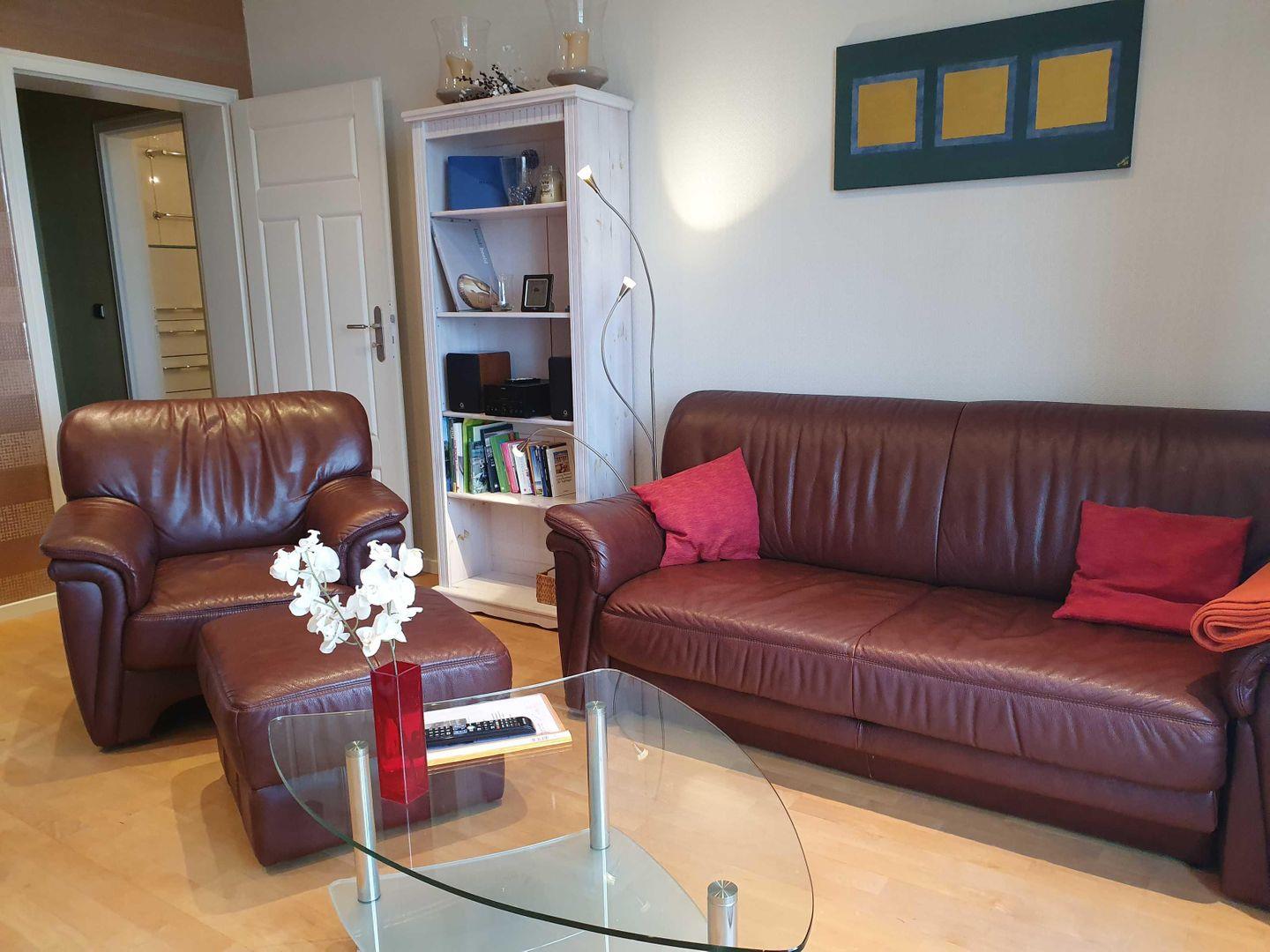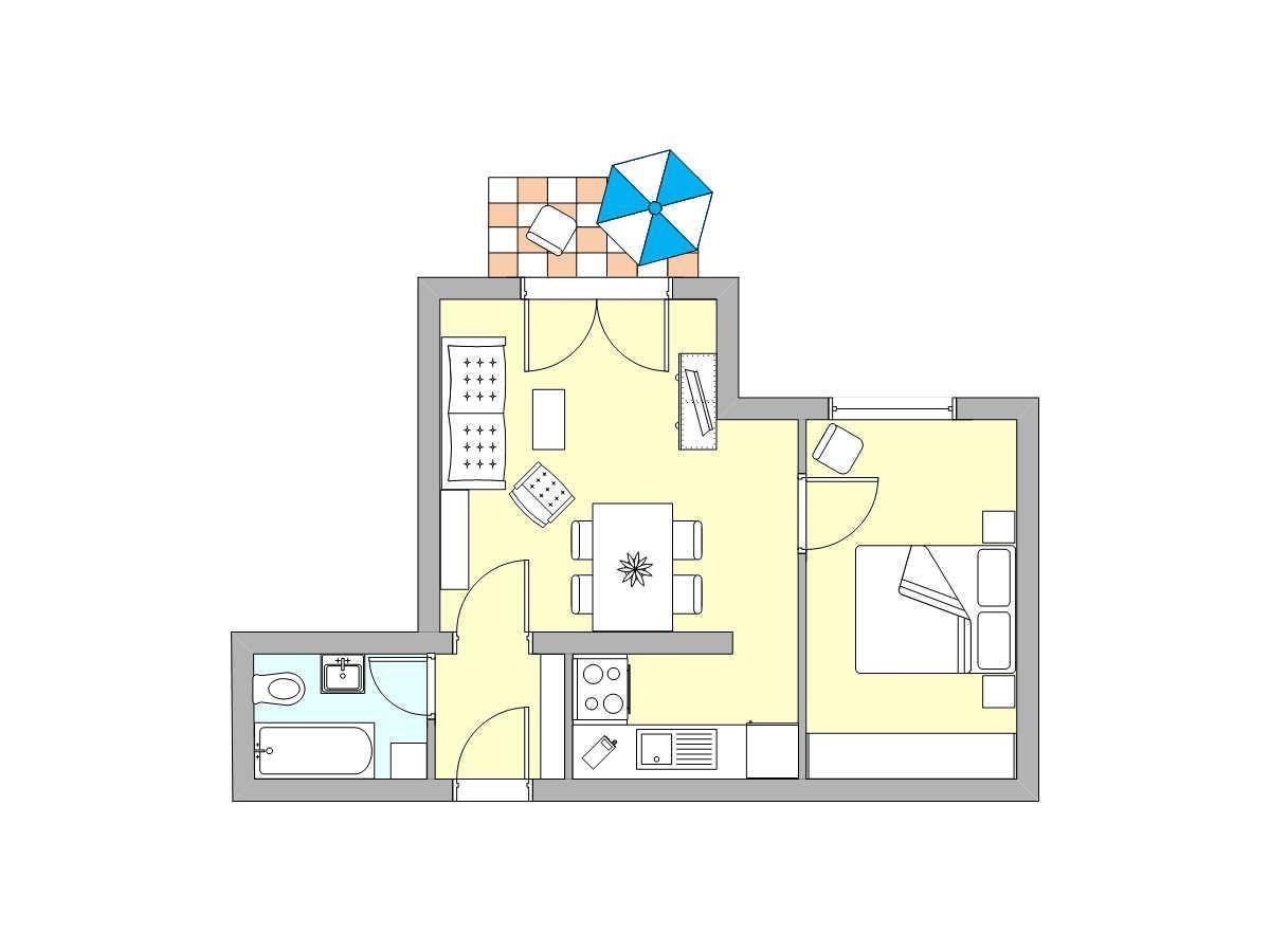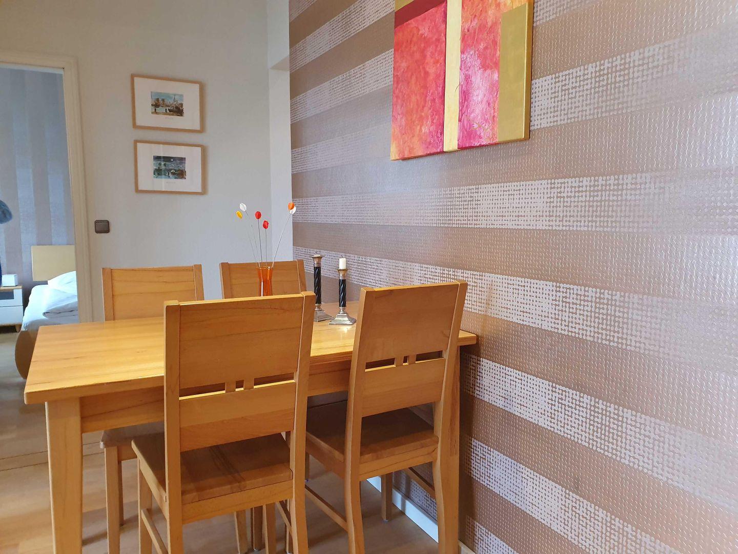 Die Ferienwohnung ist für bis zu vier Personen geeignet und verfügt über ein separates Schlafzimmer, ein Wohnzimmer sowie einen gut durchdachten Wohn- und Essbereich mit Esstisch und Sofa. Im Schlafzimmer finden Sie Erholung und ausreichend Stauraum, alle Fenster sind mit Sichtschutz versehen, sodass Sie Ihre Privatsphäre jederzeit wahren.
