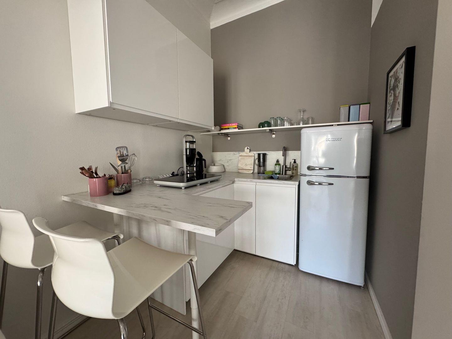 Fewo Anastasia bietet auf 50 m² den perfekten Rückzugsort für 2 Personen: ein gemütliches Schlafzimmer, ein heller Wintergarten mit Essbereich sowie eine praktische Kochnische mit Tresen und zwei Barhockern. Das Badezimmer mit Dusche ist über den Hausflur erreichbar. Die Hochparterre-Lage sorgt für Ruhe und Komfort – ideal für eine entspannte Auszeit in Warnemünde.