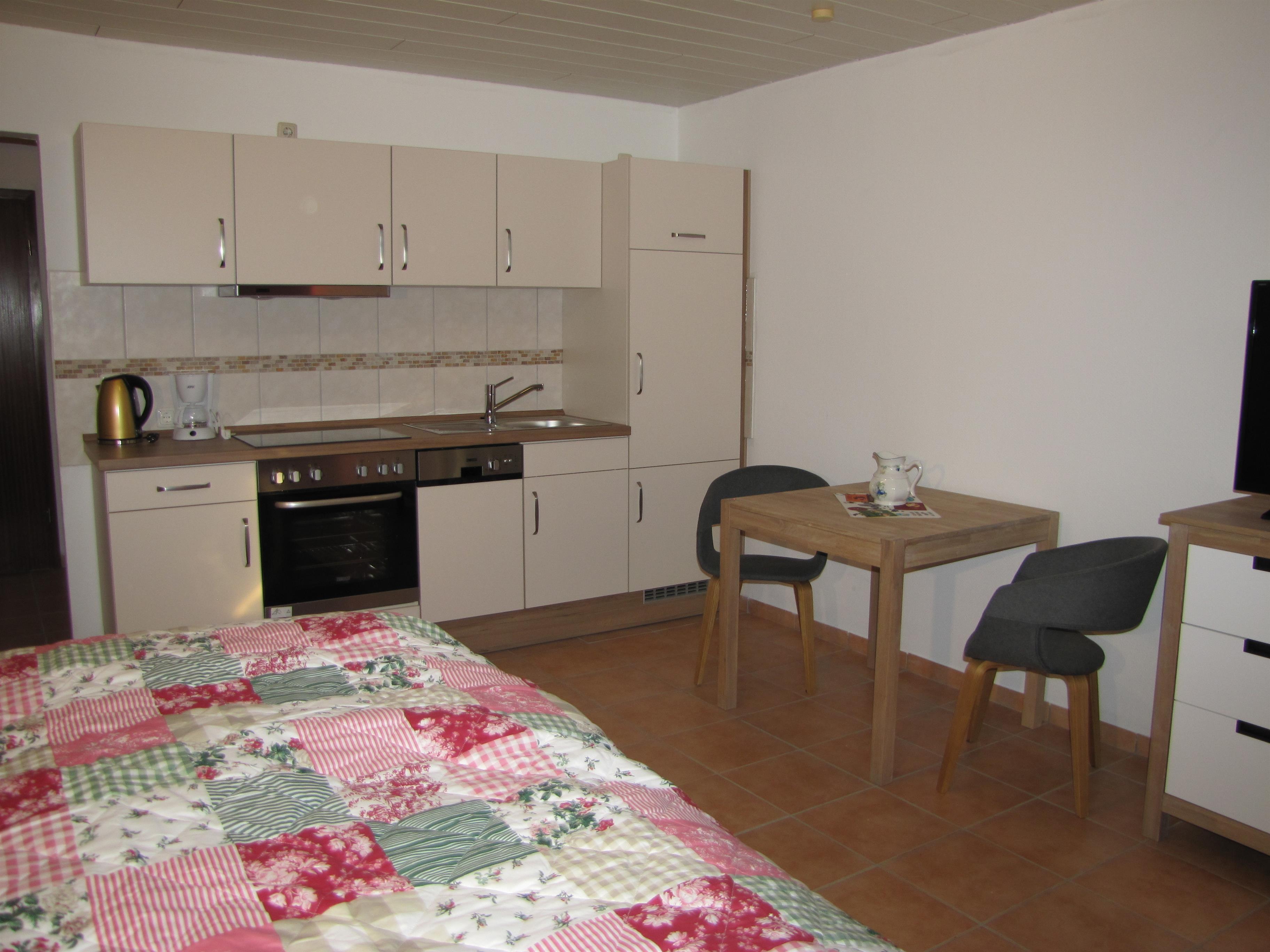 Im Raum befindet sich eine Einbauküche mit Geschirrspüler, Kühlschrank, Cerankochfeld, Backofen, Wasserkocher und Kaffeemaschine sowie ein 40 Zoll LED Fernseher.
