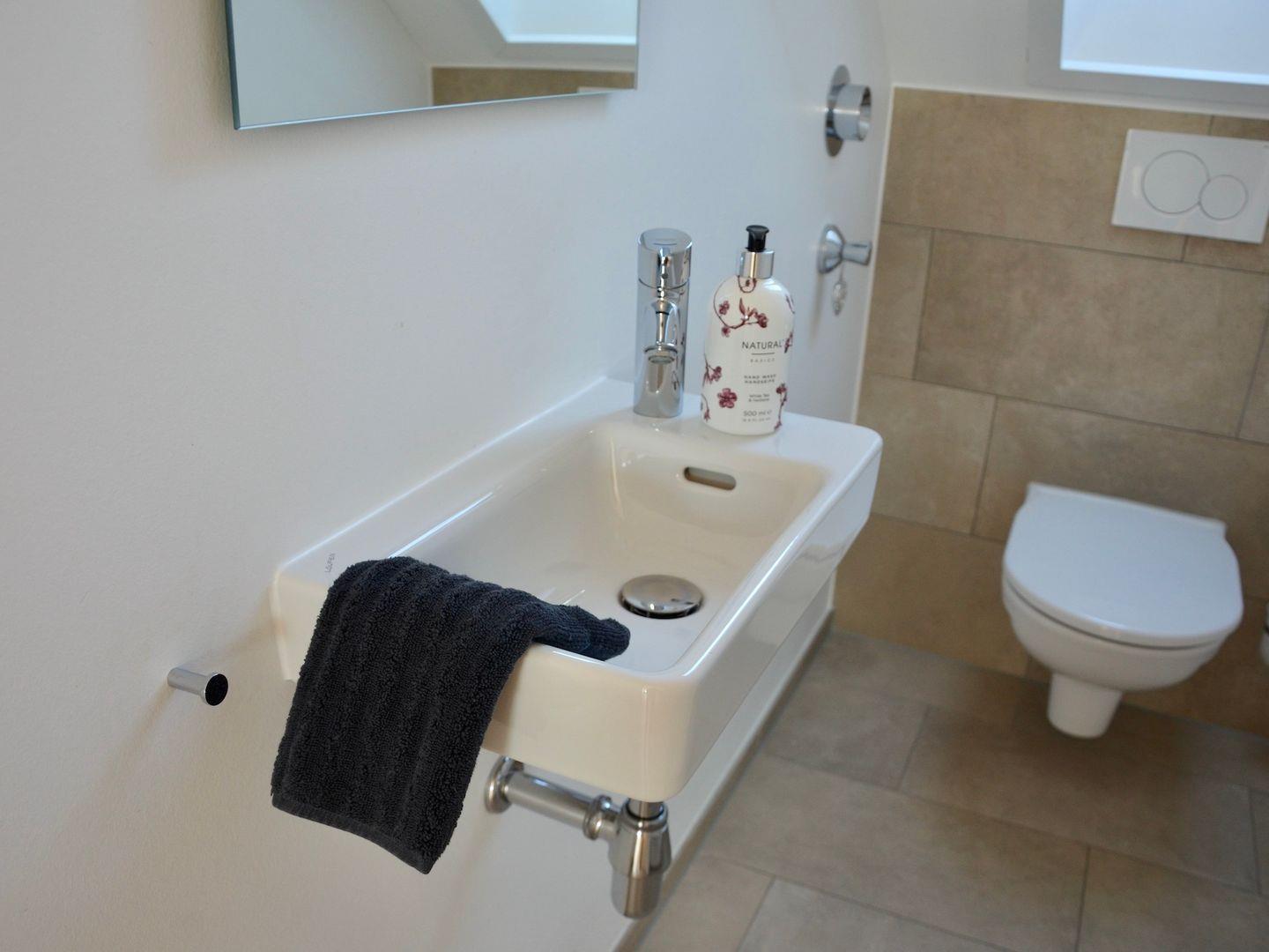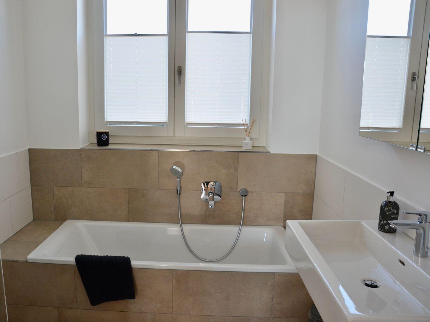 Neben dem geräumigen Bad mit Badewanne, Wellnessdusche und Waschtrockner gibt es ein separates WC. Auf dem Südbalkon findet sich eine hochwertige Teakholz Sitzgruppe mit Esstisch und 2 Hochlehner einen Deckchair mit Beistelltisch.