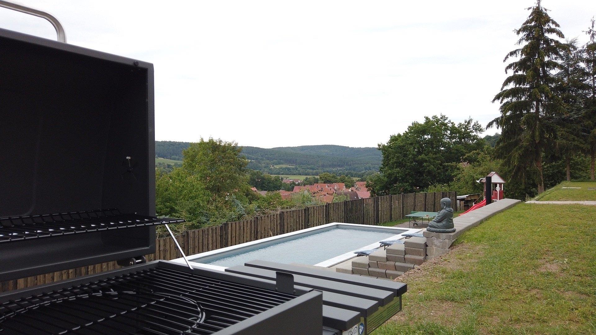 Zwischen den Ferienhäusern, finden Sie die Panorama-Sauna mit Ruhebereich, sowie den 8 Meter langen beheizten Pool mit Gegenstromanlage (Mai bis Okt.). Hier kann man, wie im Meer, endlos schwimmen und hat dabei einen herrlichen Blick über das Werratal. Ebenfalls für den sportlichen Ausgleich, stehen eine Tischtennisplatte, eine Dartscheibe, ein Boule-Spiel und für die kleinen Kinder ein Spielhaus bereit. Die Außenanlagen sind für beide Ferienhäuser nutzbar.