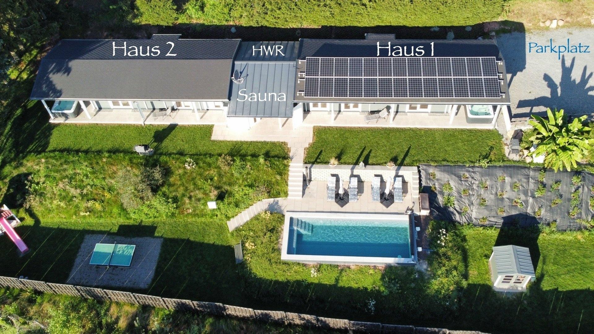 * Die Benutzung der Außenanlagen (Pool, Sauna, Tischtennisplatte und Spielhäuschen) ist zur gemeinsamen Nutzung und auf eigene Gefahr.