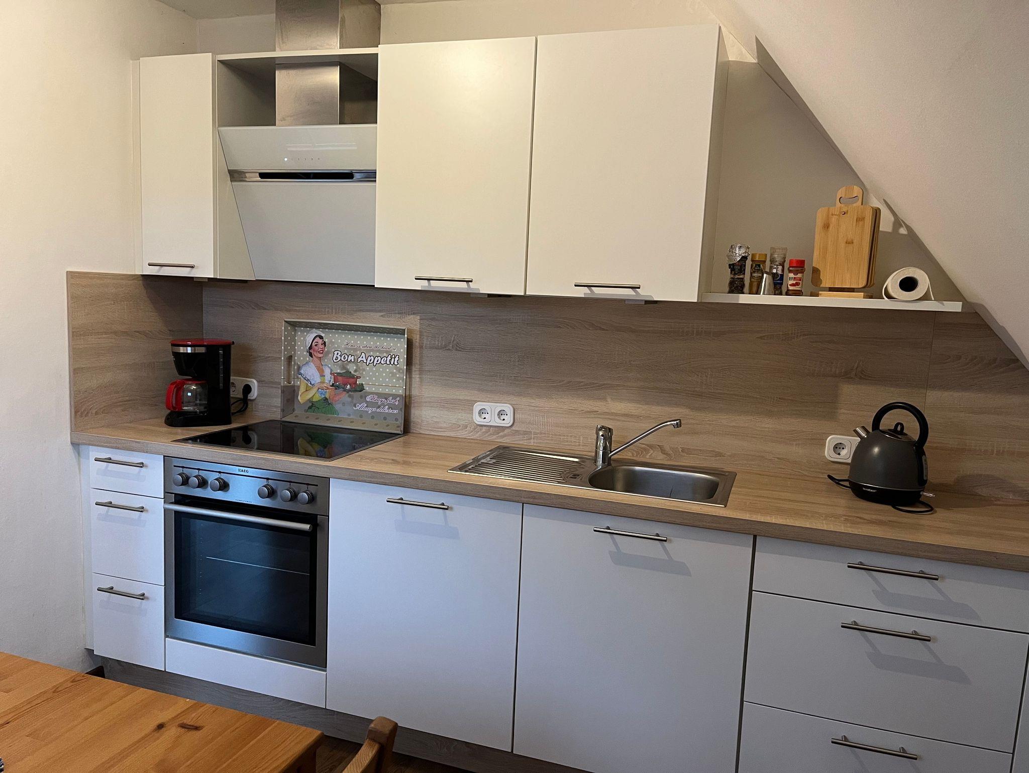 Unsere gemütliche Oberwohnung bietet Platz für bis zu 4 Personen. Über einen kleinen Eingangsbereich mit Garderobe und Spiegel geht es nach oben. Die Wohnung verfügt über 2 Schlafzimmer, Bad mit begehbarer Dusche sowie einen offenen Wohnbereich mit Küche. Die Dachterrasse lädt zum Sonnen und frühstücken ein. Im Garten bietet sich bestimmt ein schattiges Plätzchen zum Entspannen, spielen und grillen. Fahrräder können in einem abschließbaren Schuppen untergestellt werden. Eine Möglichkeit zum Laden von E-Bikeakkus ist vorhanden.
