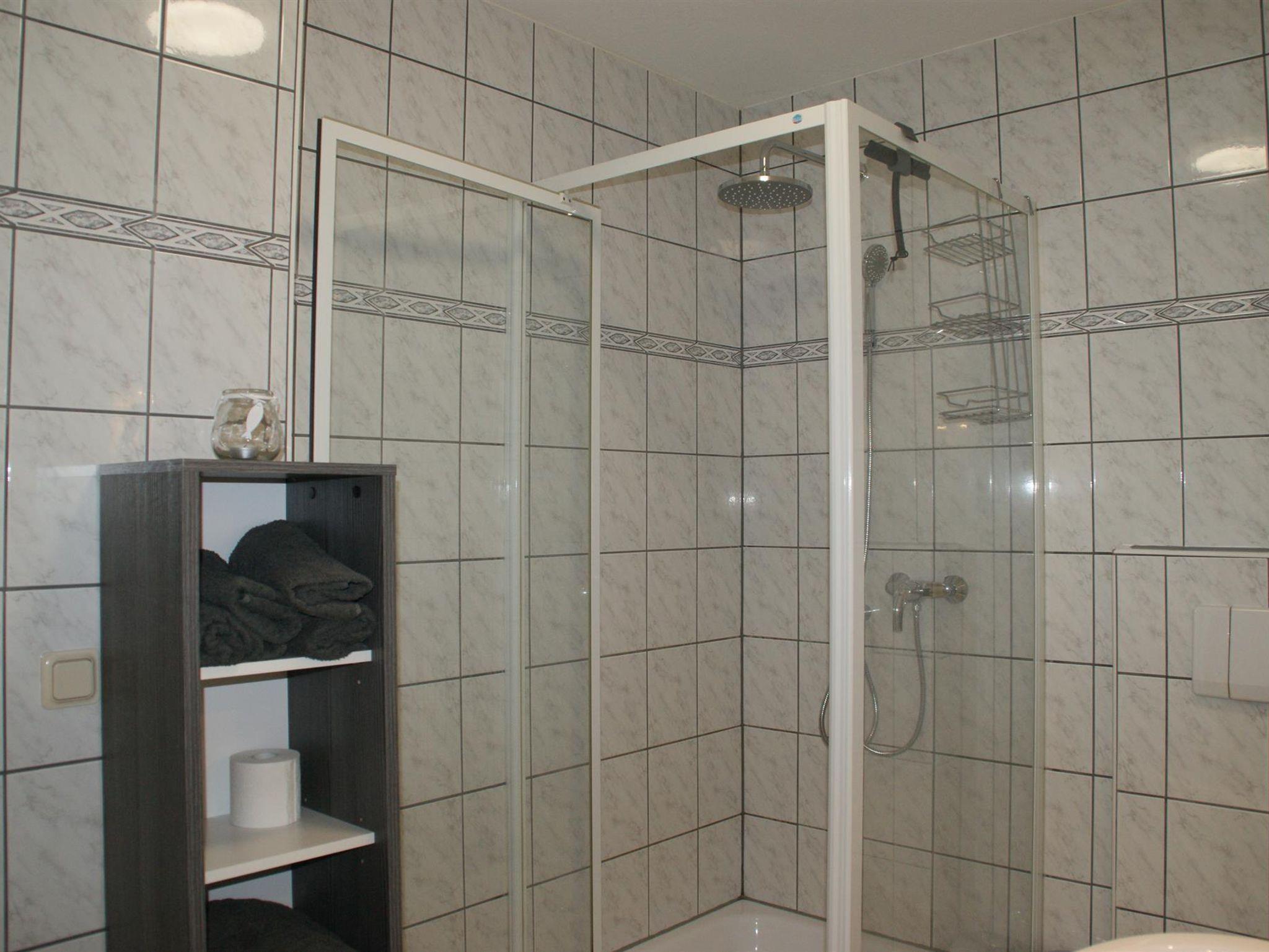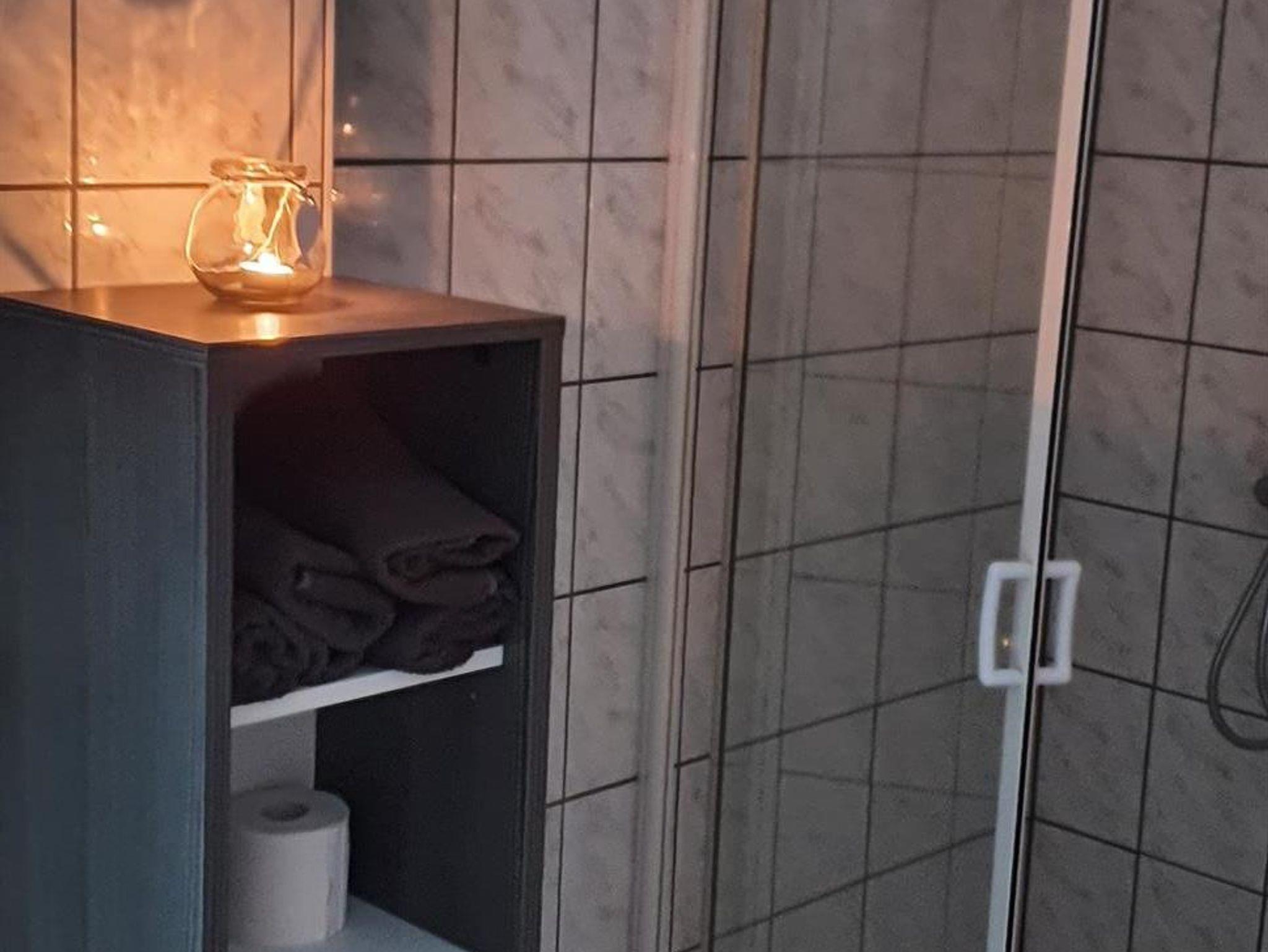 Das Badezimmer ist ebenfalls hell gestaltet und mit Dusche und WC ausgestattet.