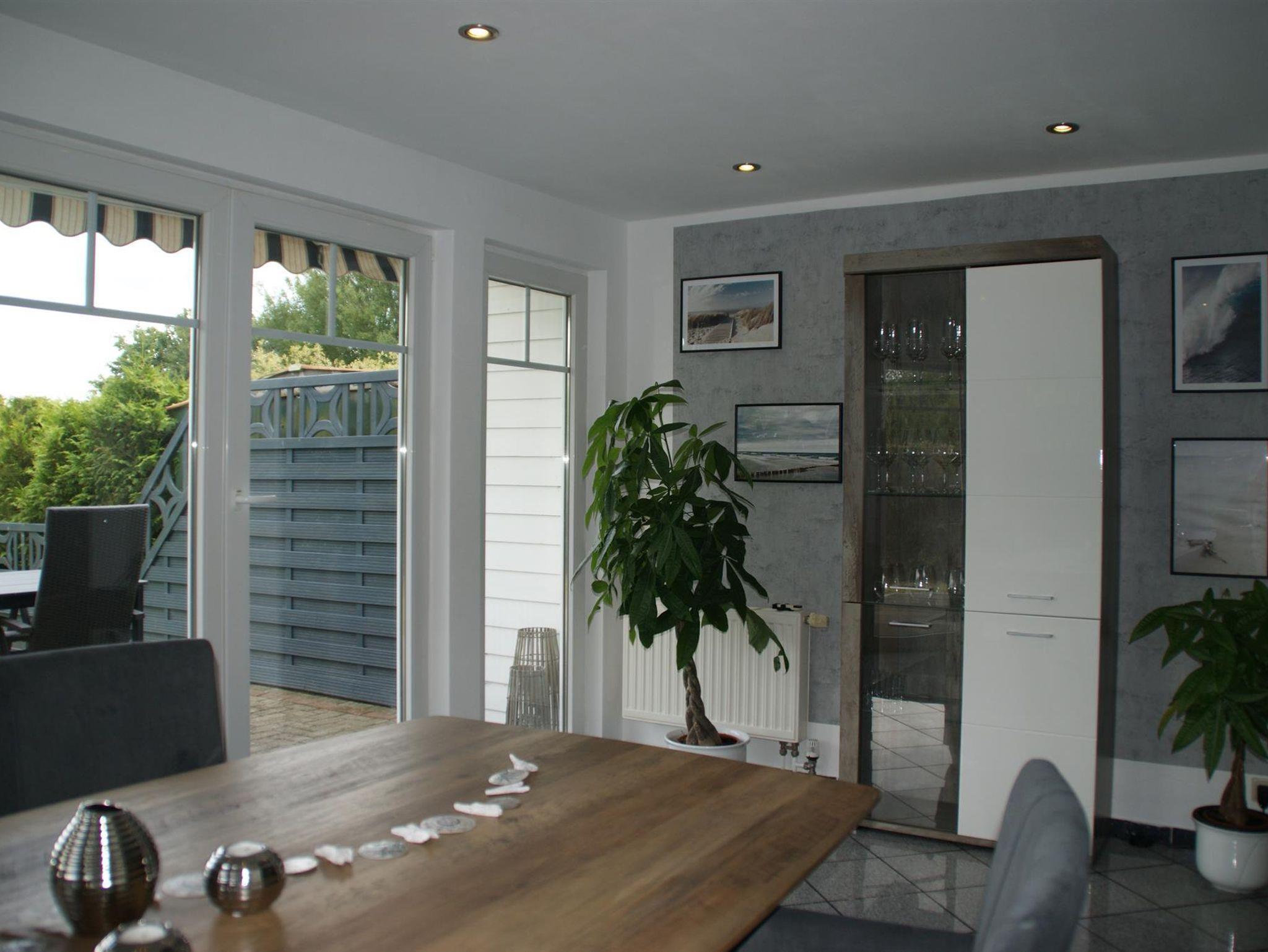 Im hellen und freundlichen Wohnzimmer haben Sie einen unverbauten Blick auf den Garten und in die Landschaft von Angeln. Die angenzende Küche ist voll ausgestattete mit Kühlschrank, Gefrierschrank, Kaffeemaschine und vielem Mehr.