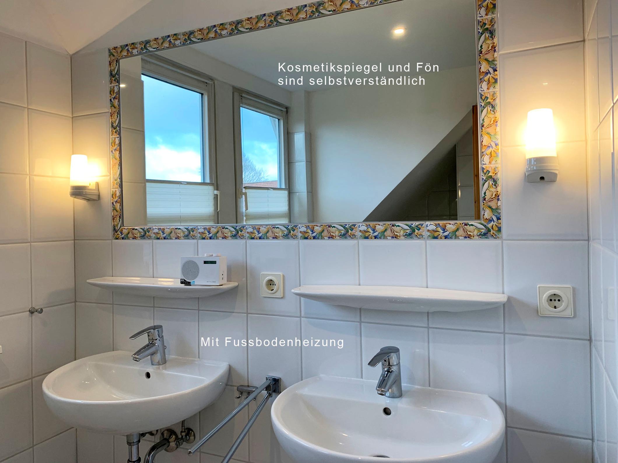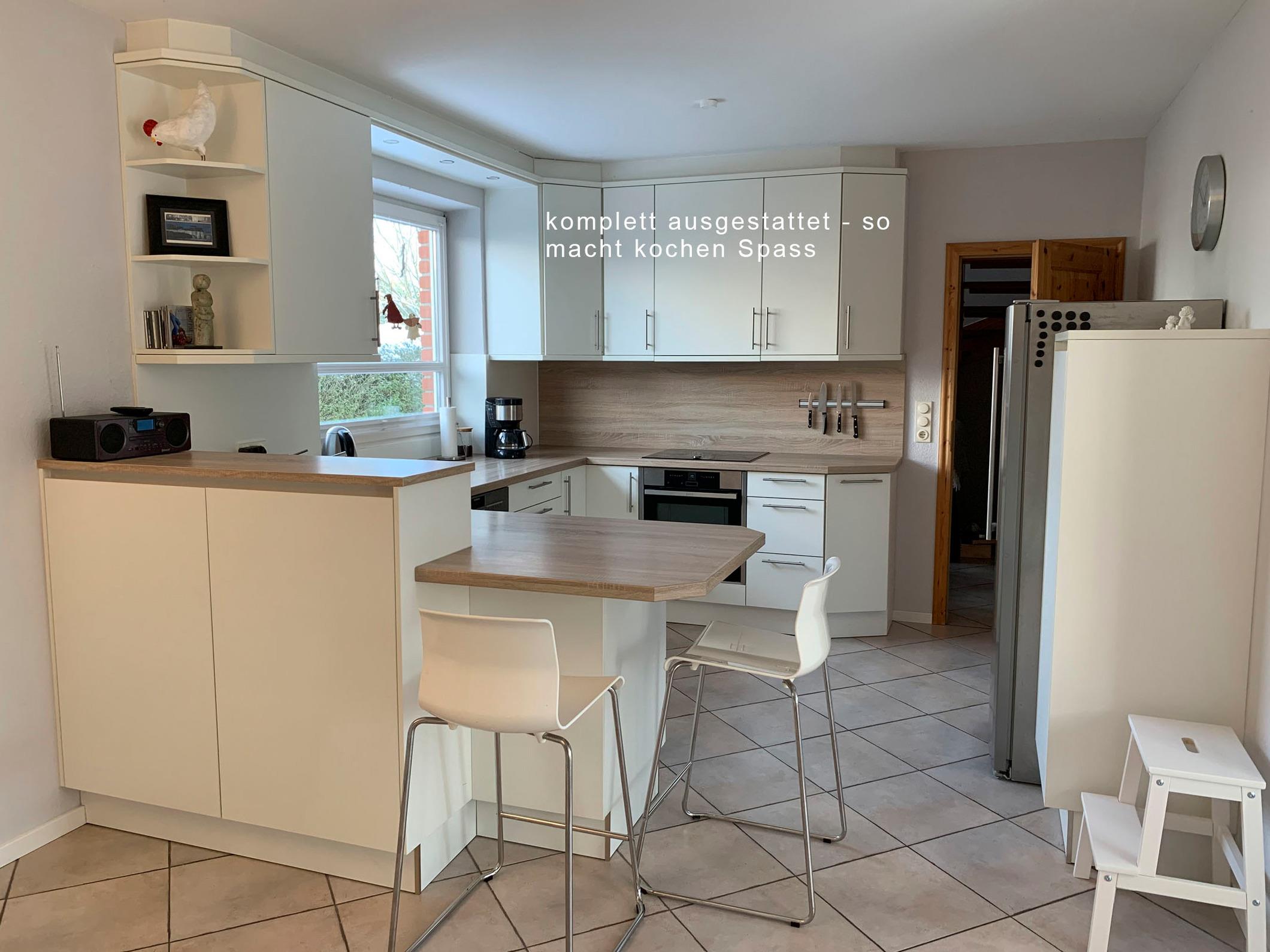 Das Wohnzimmer mit Kaminofen und Leseerker bietet zu Ihrer Unterhaltung Kabel-TV, DVD/CD Player, Radio und einen großen Flachbild-Fernseher (43"); hier können Sie mit Ihrem eigenen Zugang Amazon Prime, Netflix und Mediatheken nutzen. Der Raum ist zum gemütlichen Essplatz mit extra großem Esstisch offen gestaltet. Die voll ausgestattete Küche mit Geschirrspüler, Kühlschrank, separatem Gefrierschrank im Keller, Induktionsherd, Backofen und diversen Kleingeräten lässt kaum Wünsche offen. In allen Schlafräumen befinden sich bequeme Betten; 2. TV 28" und MusicStation (2.2-FM Radio mit CD, USB, Bluetooth und integriertem Radiowecker) im Schlafzimmer 2, Fliegennetze in den Schlafzimmern 1 und 3. Ein geräumiges Vollbad ist ebenso vorhanden wie ein getrenntes Gäste-WC. WLAN, je eine kleine Auswahl DVD´s und CD´s, diverse Bücher und Spiele runden die Ausstattung ab. Überall gibt es viel Stauraum und Ablageflächen für Ihre persönlichen Dinge.