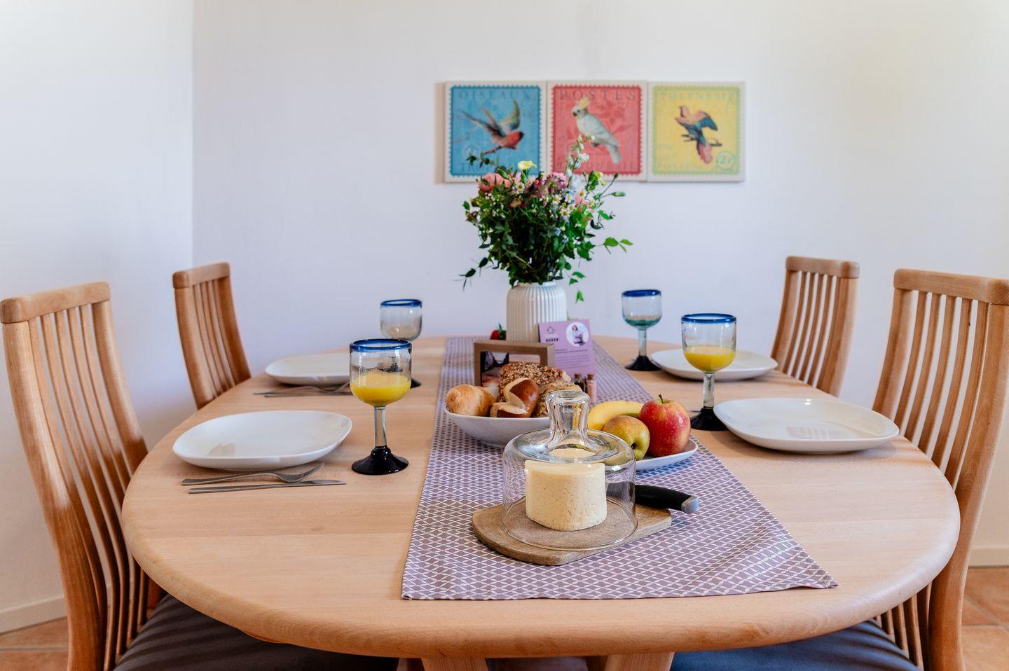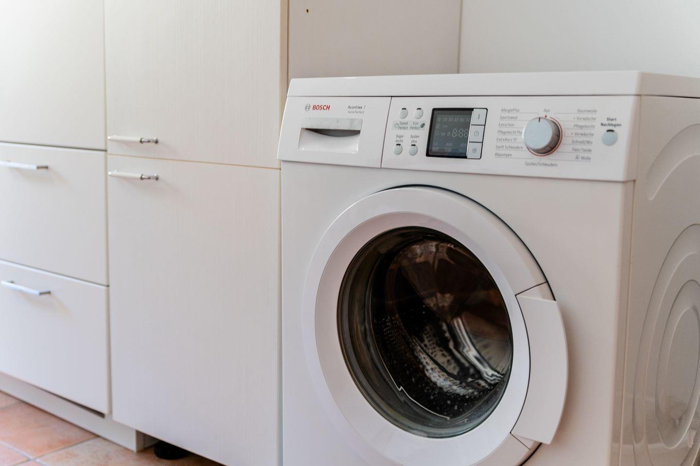 Ein Essbereich für bis zu 5 Personen und eine Waschmaschine, rundet die Küche ab.