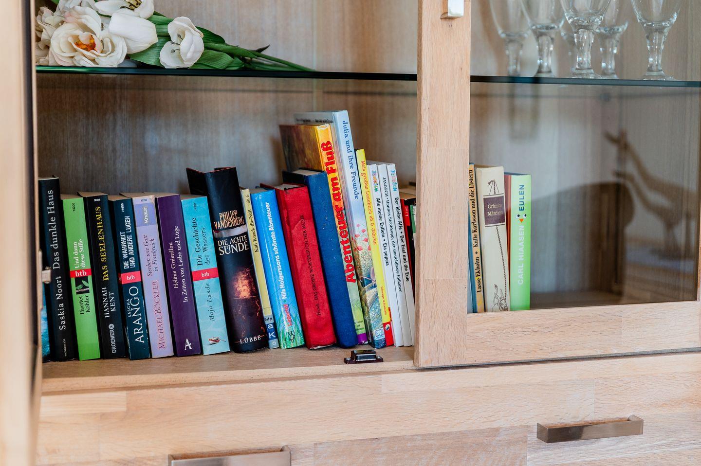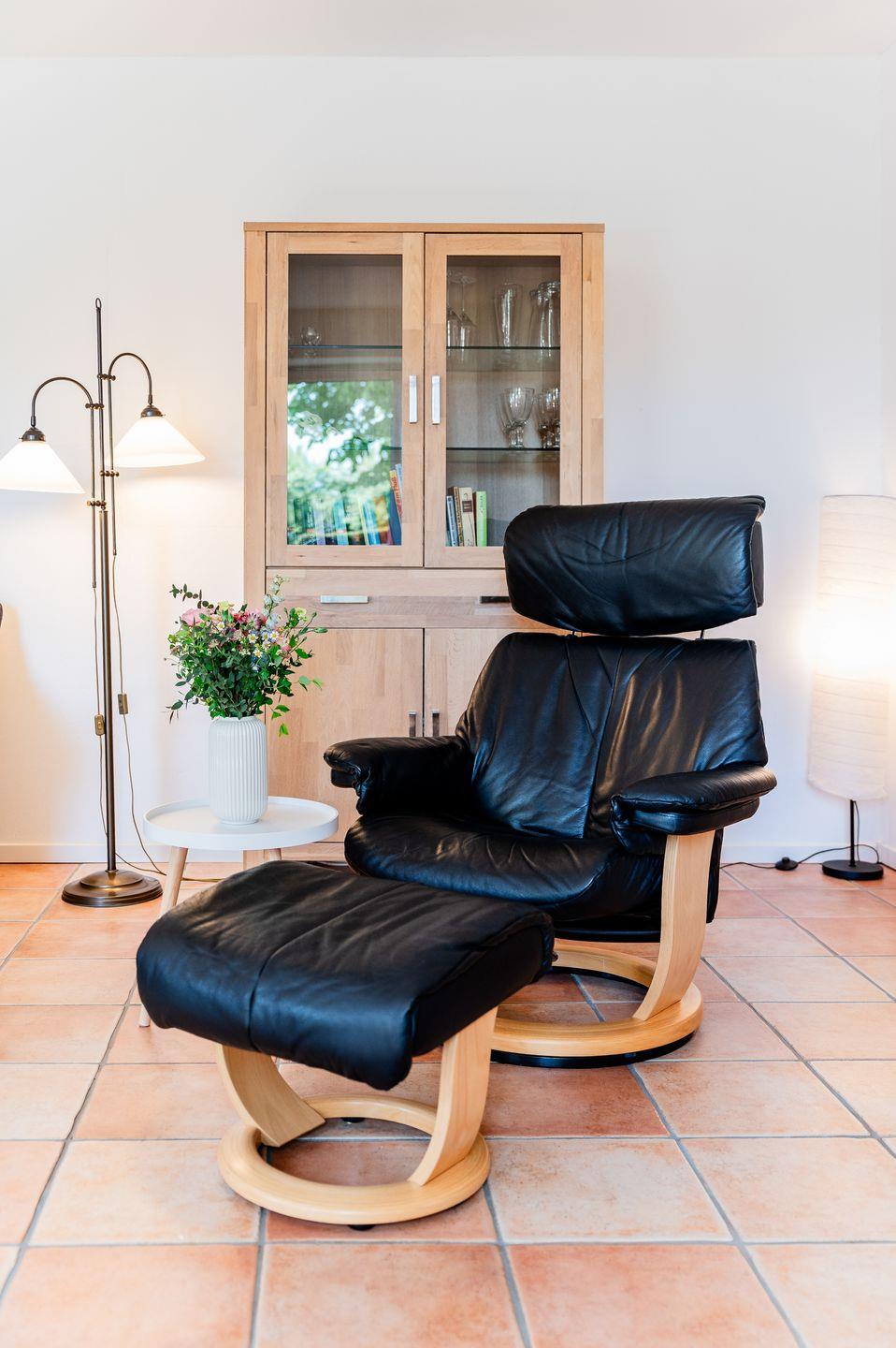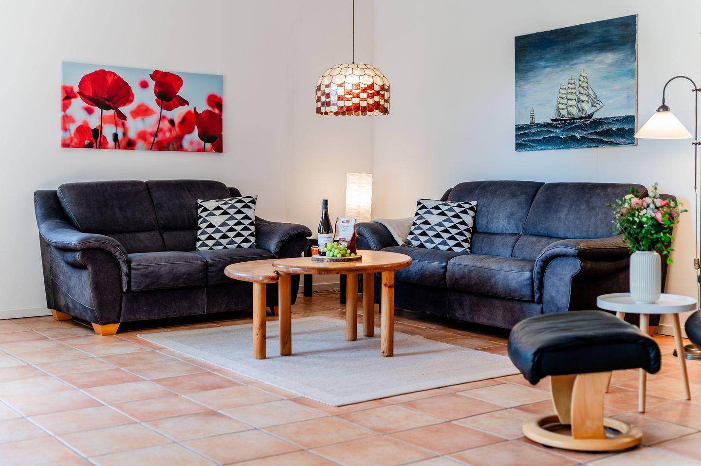 Der gemütliche Wohnbereich lädt zu entspannenden Abenden ein. Hier finden Sie eine gemütliche Couch, einen großen Sessel , einen Fernseher, Spiele und Bücher.