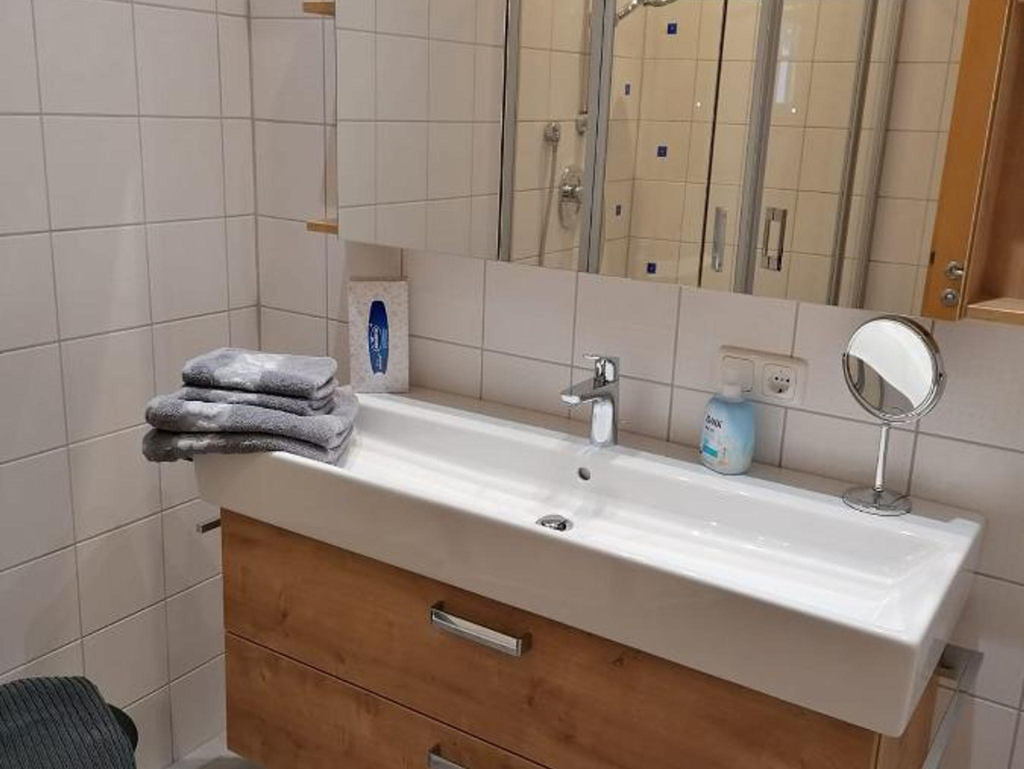Geschirr. Im großzügigen Wohnzimmer befindet sich eine Couch und TV. Im Badezimmer finden Sie Dusche, Waschbecken und Fön. Das