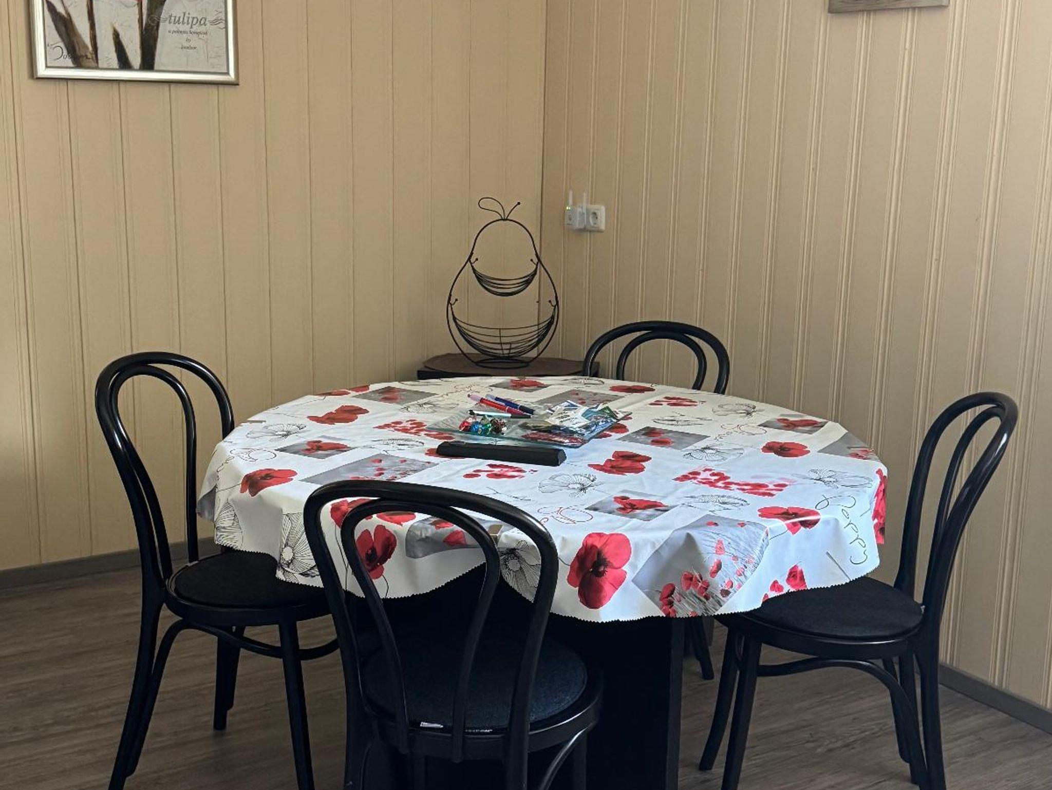 Die Ferienwohnung bietet auf 75 Quadratmetern Platz für bis zu 5 Personen. Sie verfügt über einen eigenen Eingang und liegt im Erdgeschoss. Die Wohnküche mit SAT-TV, WLAN, Couch sowie einer Essecke und einer Küchenzeile ausgestattet. Die Küchenzeile ist mit reichlich Geschirr, Spülmaschine, Kühlschrank, Mikrowelle, Wasserkocher, Toaster und Kaffeemaschine ausgestattet. Geschirrtücher und Spülmittel vorhanden.