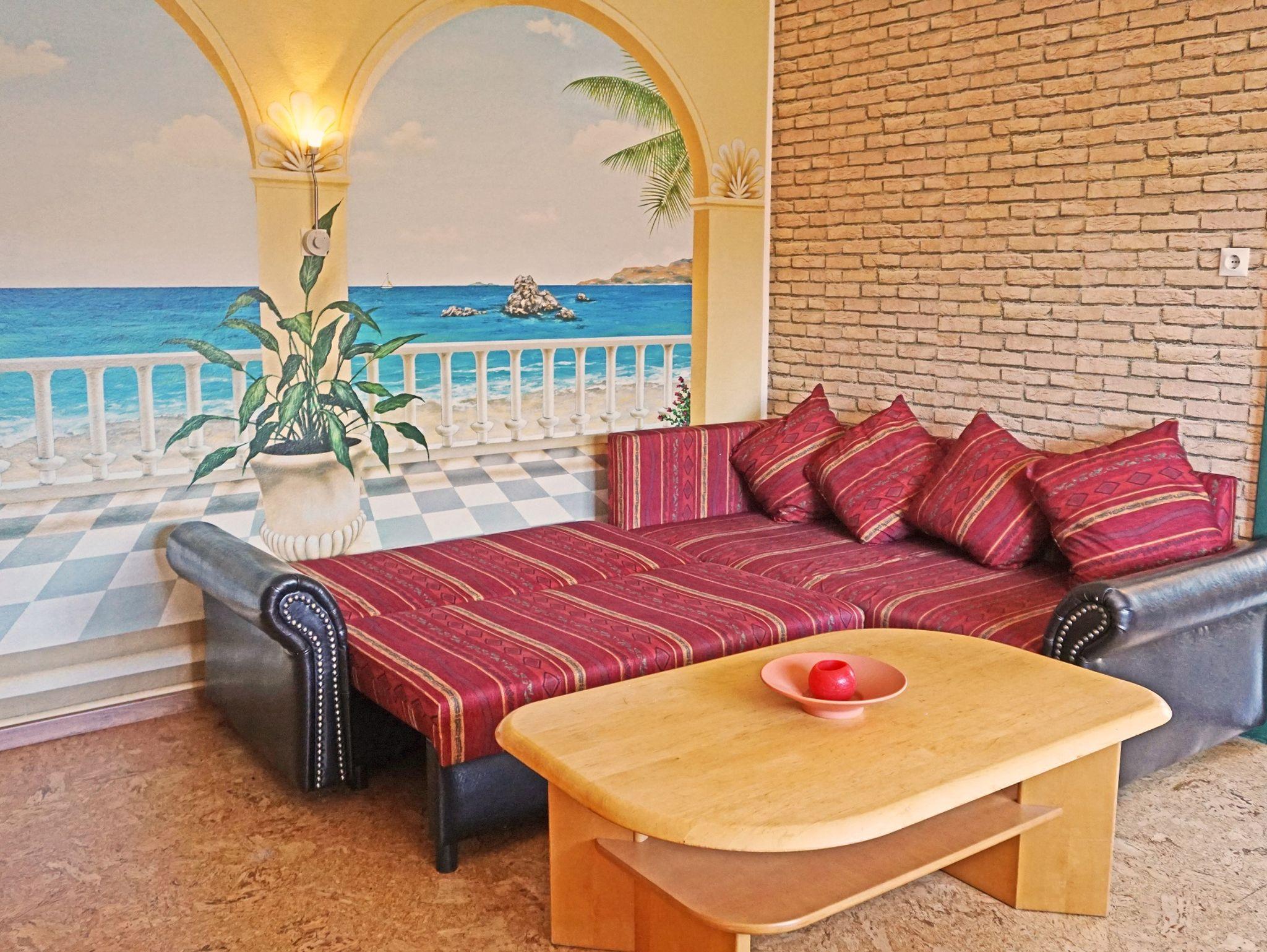 Im Wohnzimmer kann das Sofa zur Schlafcouch mit wenigen Handgriffen umgewandelt werden.
