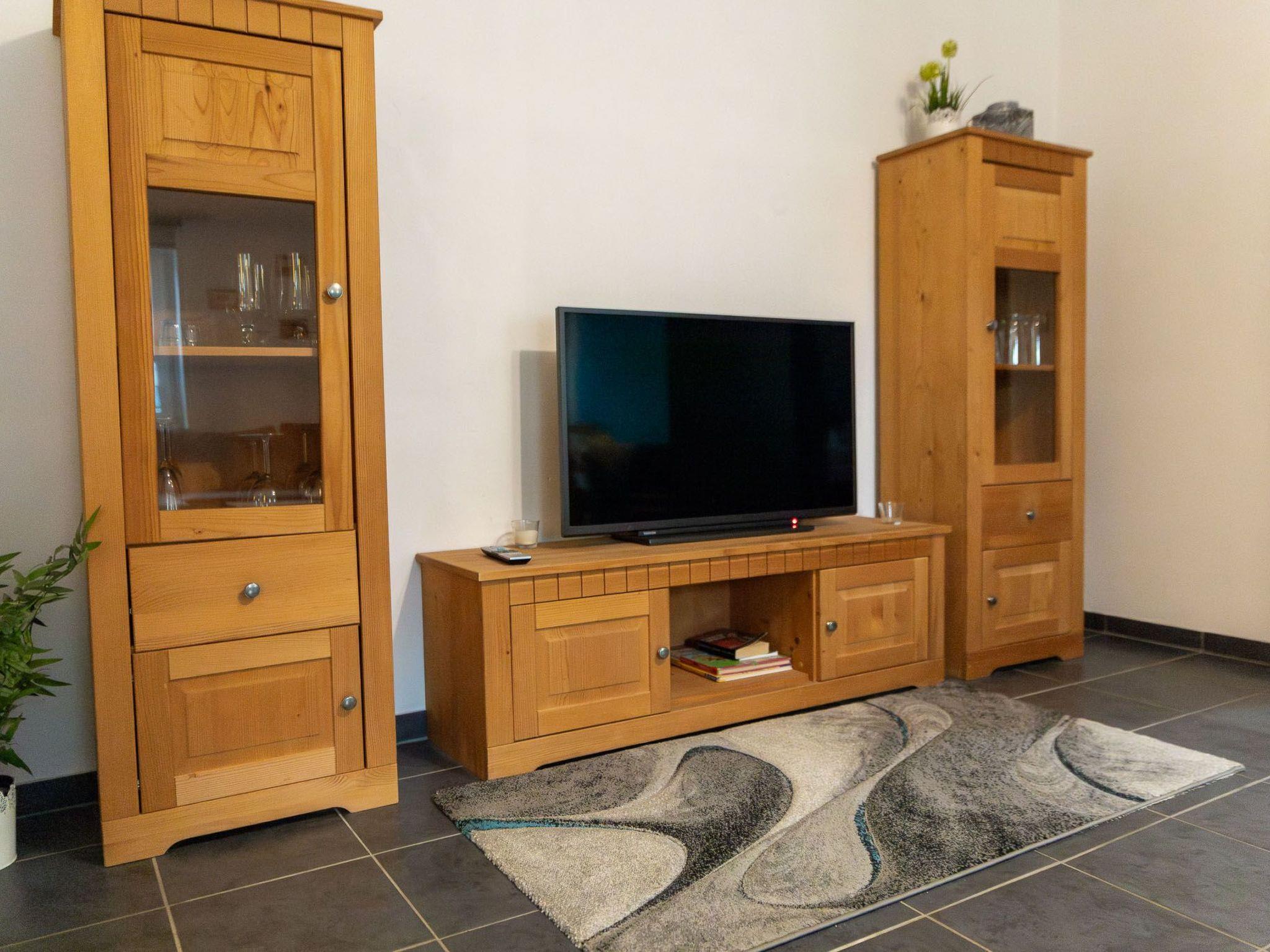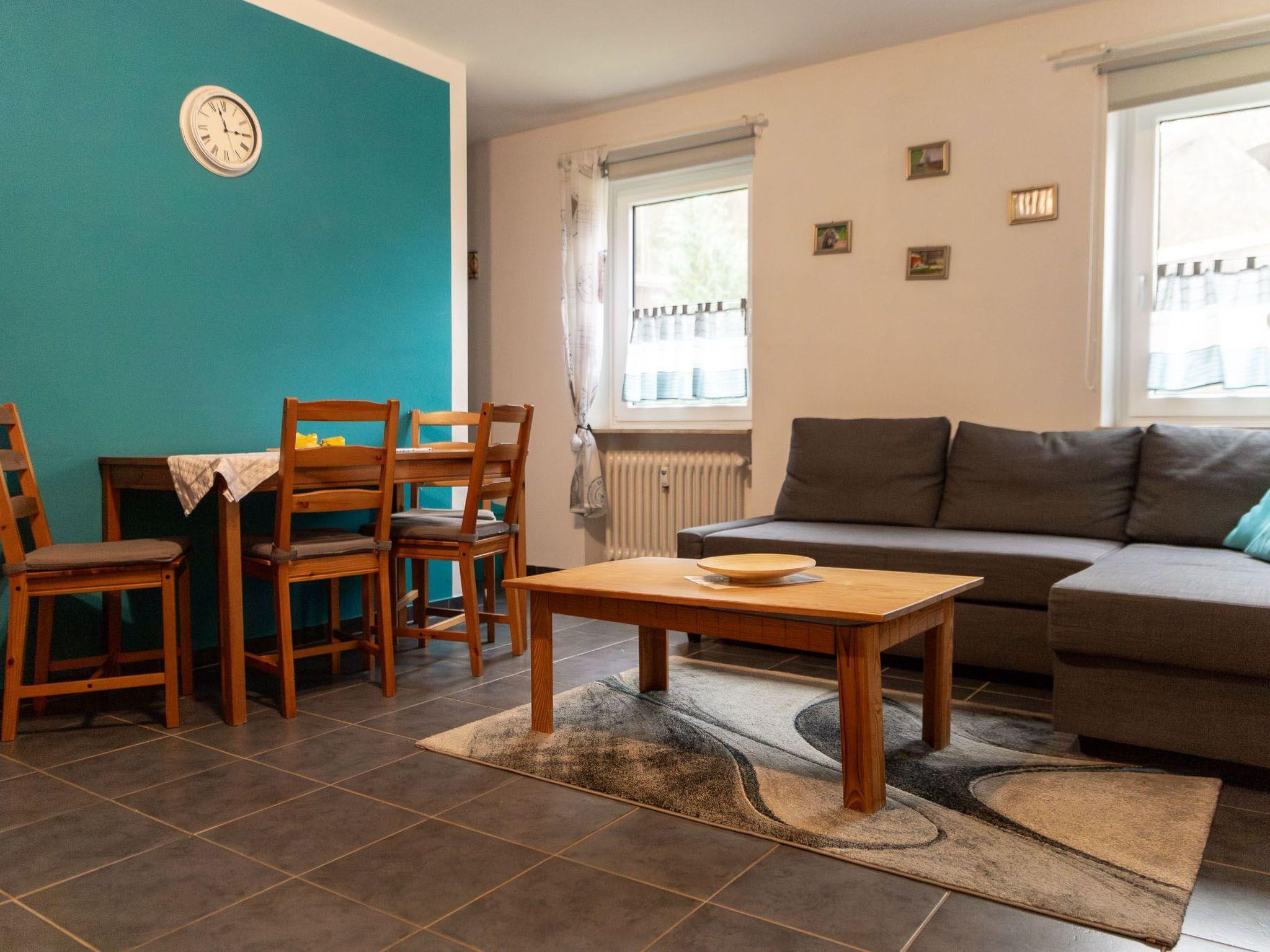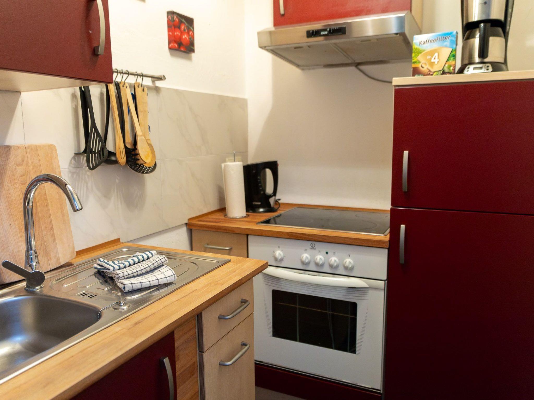 The 40m² apartment can accommodate four people. It consists of a well-equipped built-in kitchen with a stove, oven, coffee machine, toaster, kettle and fridge, as well as a living and dining room with a sofa bed (140 x 200cm). The bedroom has a box spring bed (140 x 200cm), a bedside table with a light and an old rustic wardrobe with a mirror on the door. The daylight bathroom is fitted with a shower and WC. The large living and dining room with a comfortable sofa invites you to relax after a day trip. Up to four people can sit at the dining table for meals together. There is a little built-in kitchen with a four-zone ceramic hob and oven, a built-in fridge with a freezer compartment, a coffee machine, toaster, kettle and everything you need for cooking.