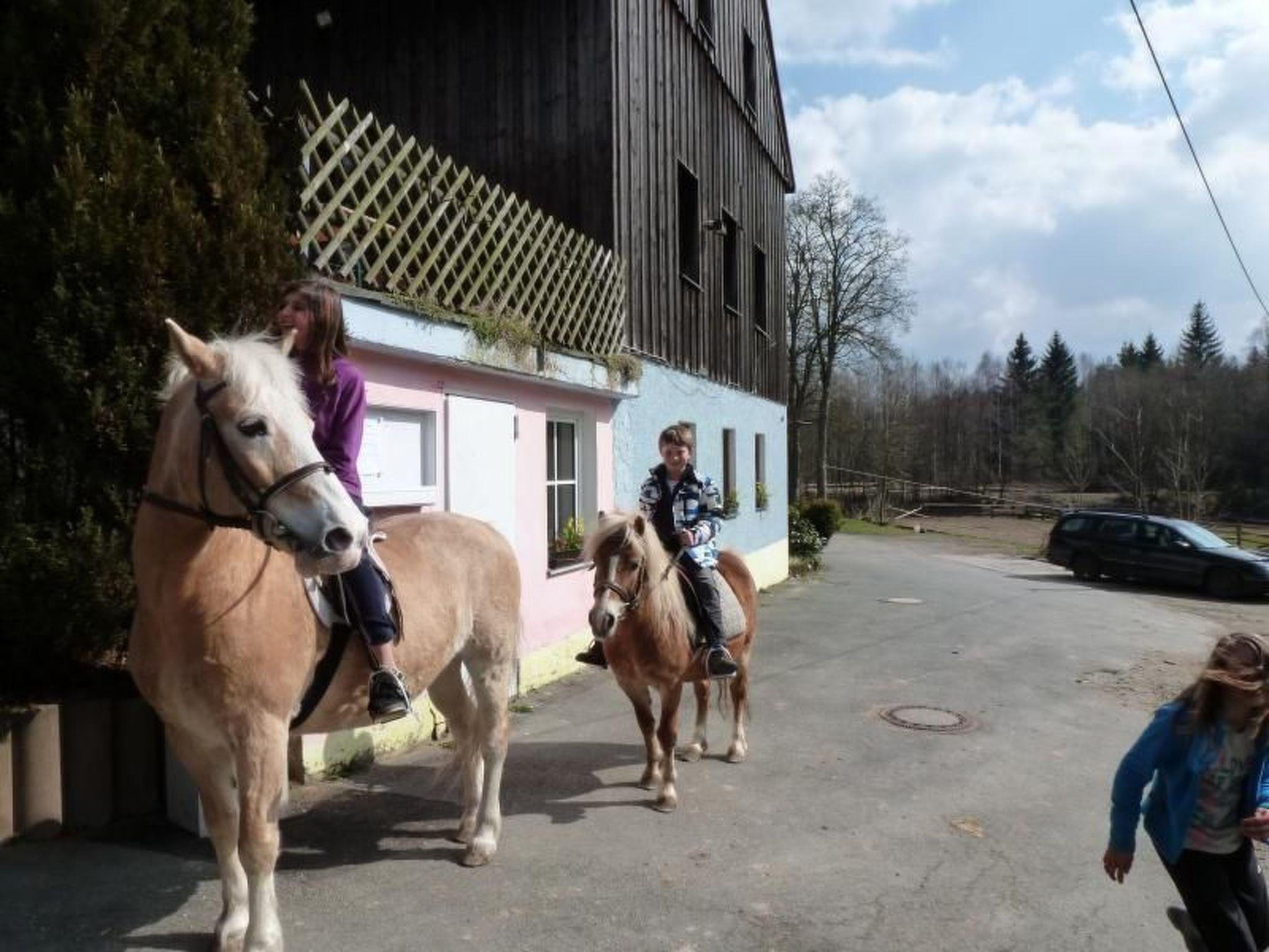 The holiday apartment is in the front part of the riding farm, on the first floor over the entrance. On the south-facing balcony you can enjoy the sun from morning to evening, as well as the view towards the edge of the forest, the riding arena and the pasture.