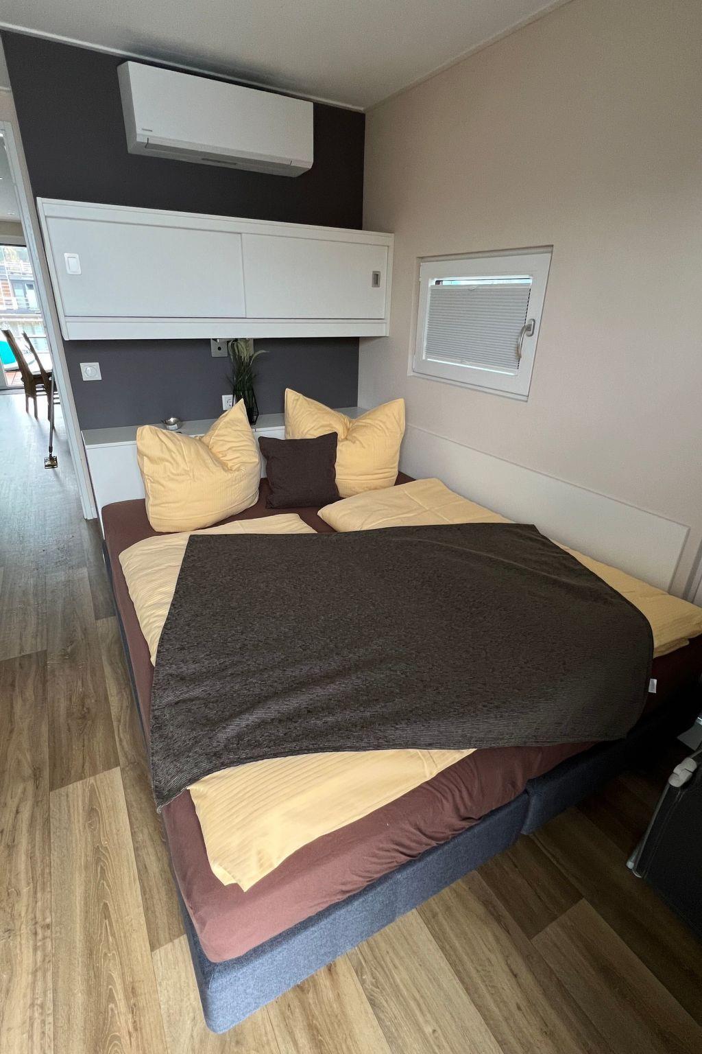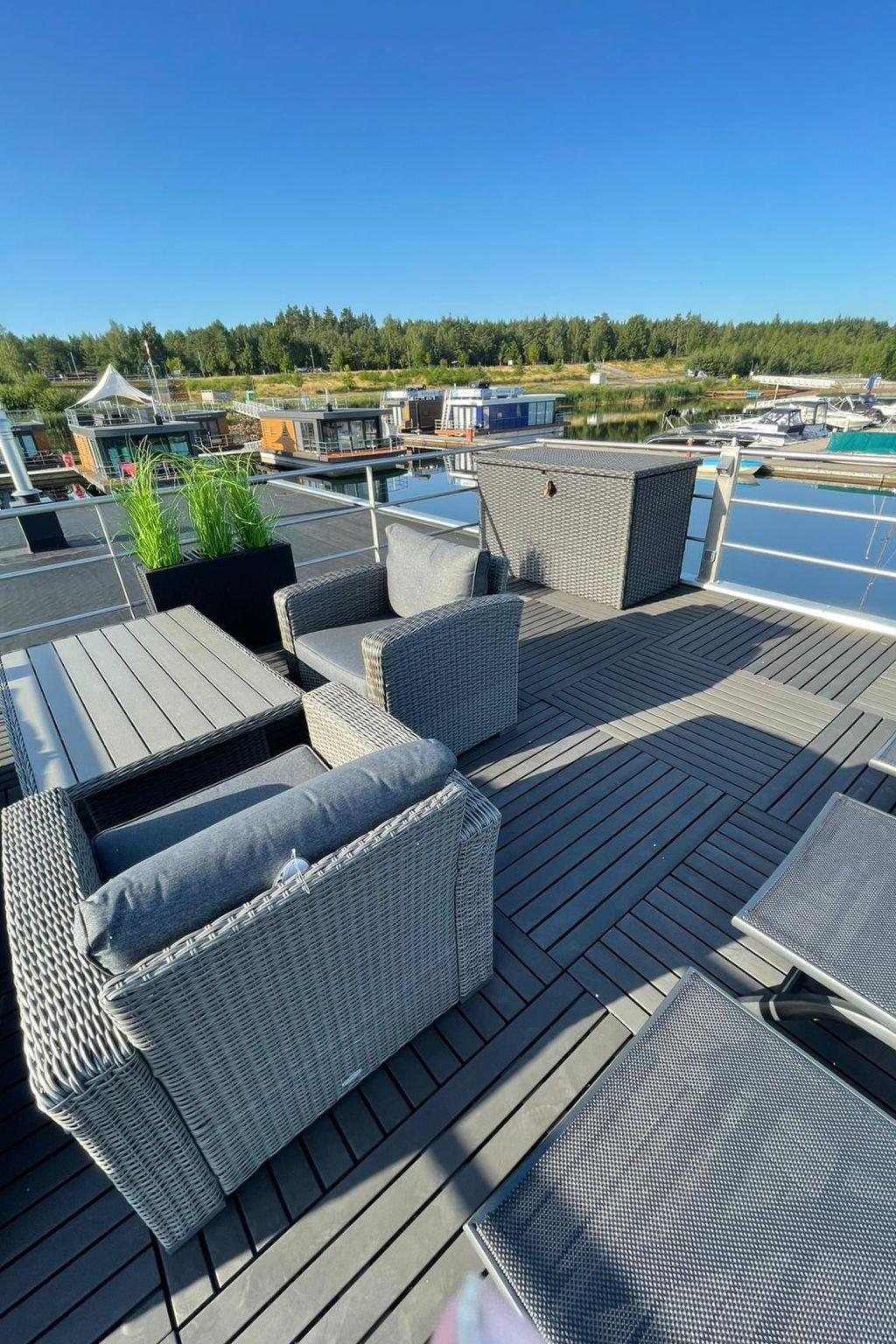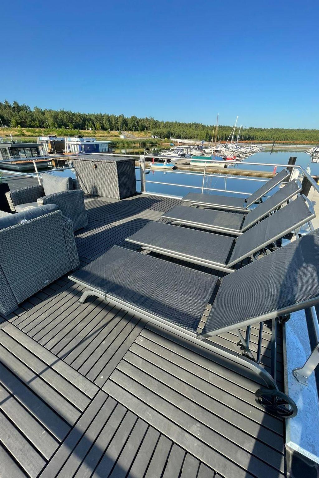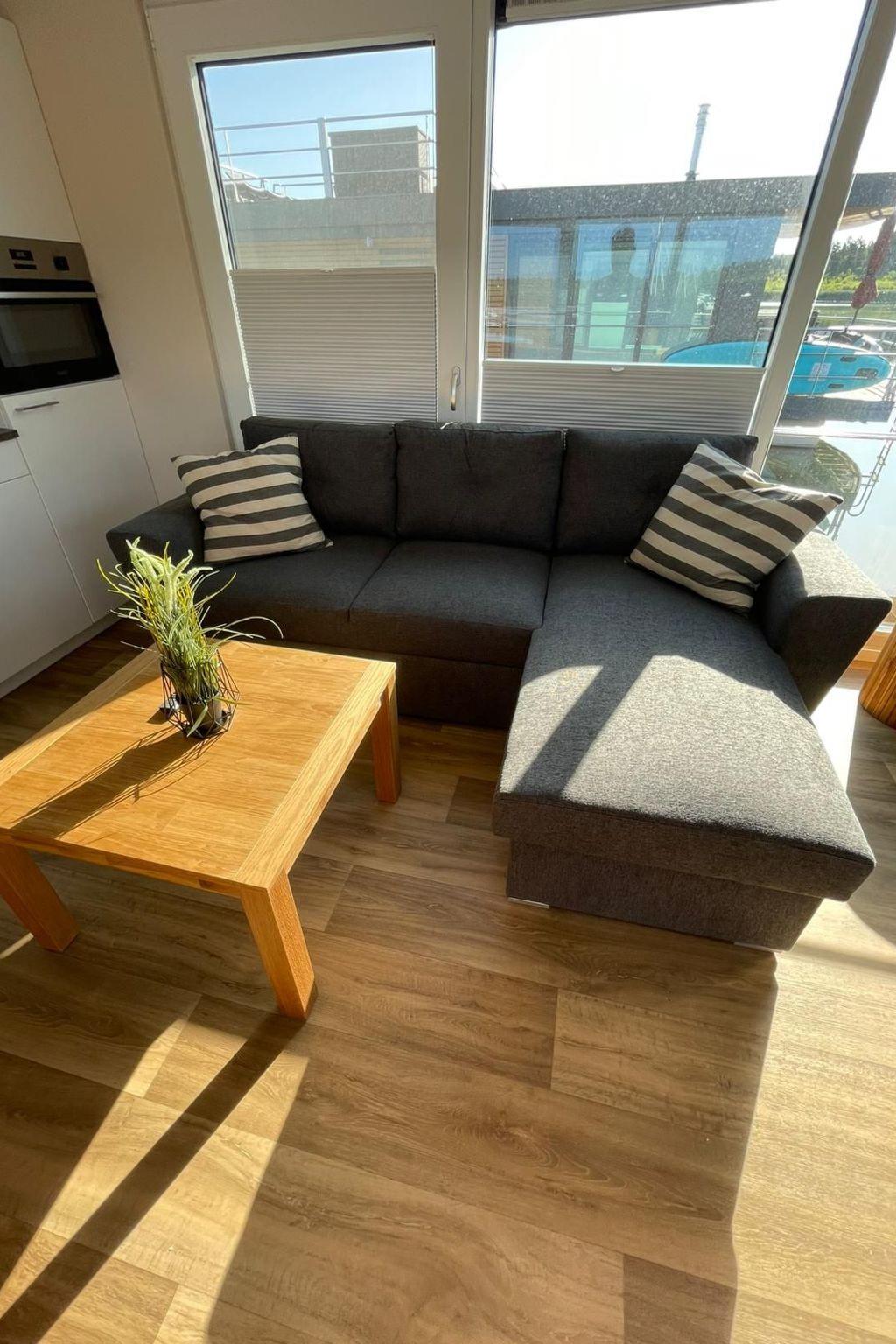Dive away from everyday life and into your dream home on the water! The moored houseboat "Vroni" offers everything you need for a relaxing holiday with its high-quality living space and two sun terraces. Thanks to the breathtaking view, nothing stands in the way of relaxation and recreation.the house has two bedrooms, each with a comfortable double bed (1.60 m x 2.00 m). The bathroom is equipped with a shower, washbasin, mirror, hairdryer and a separate WC. The living and dining area is a stylishly furnished room. The fully equipped eat-in kitchen includes a fridge with freezer compartment, dishwasher, ceramic hob, microwave, coffee machine, toaster, kettle, crockery, cutlery and much more.from the living and dining area you can access the terrace and enjoy your meals in the lounge area or simply relax.a car park is available for you free of charge. You can drive close to the jetty for loading and unloading. Bed linen, towels and a cosy sofa blanket are included.