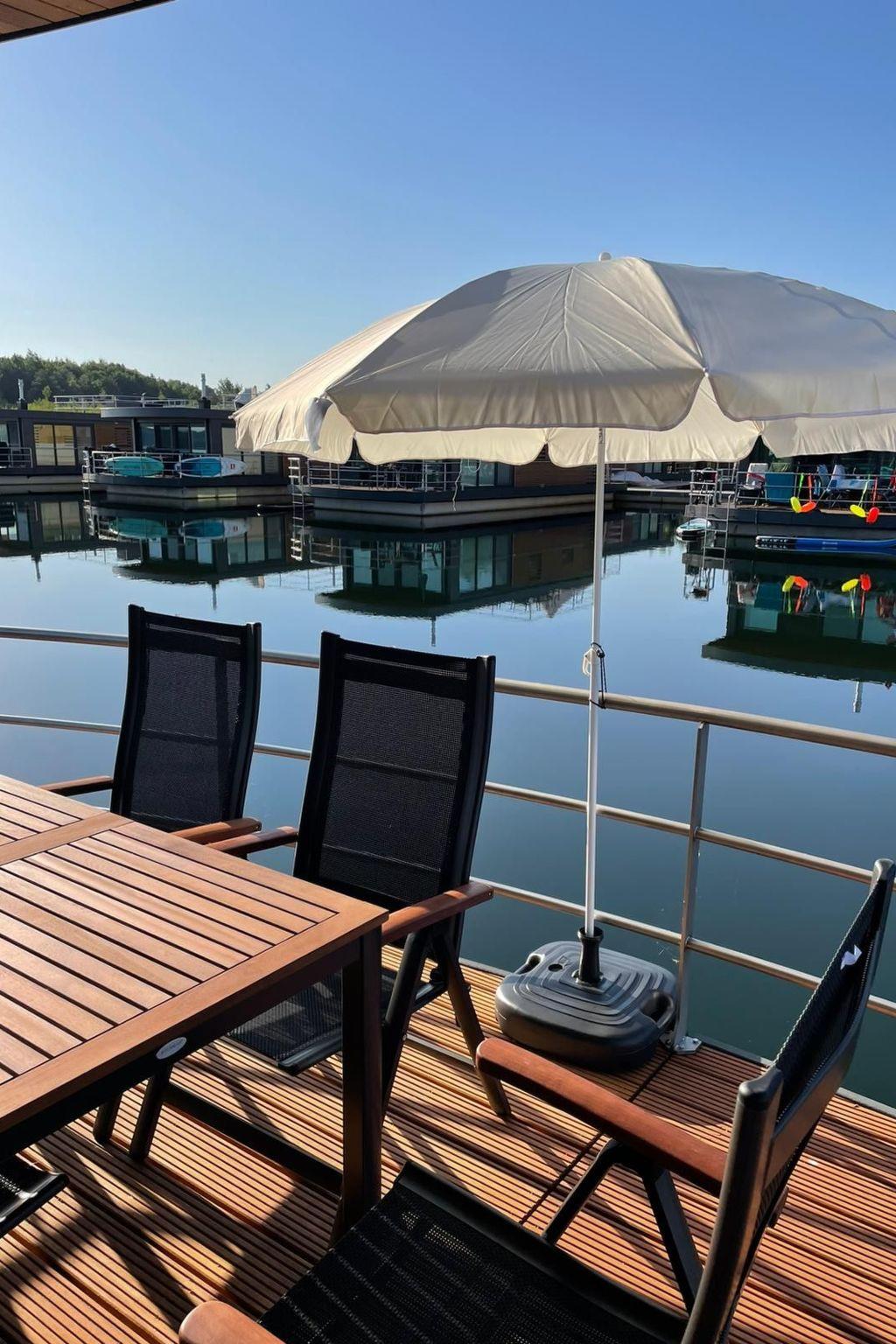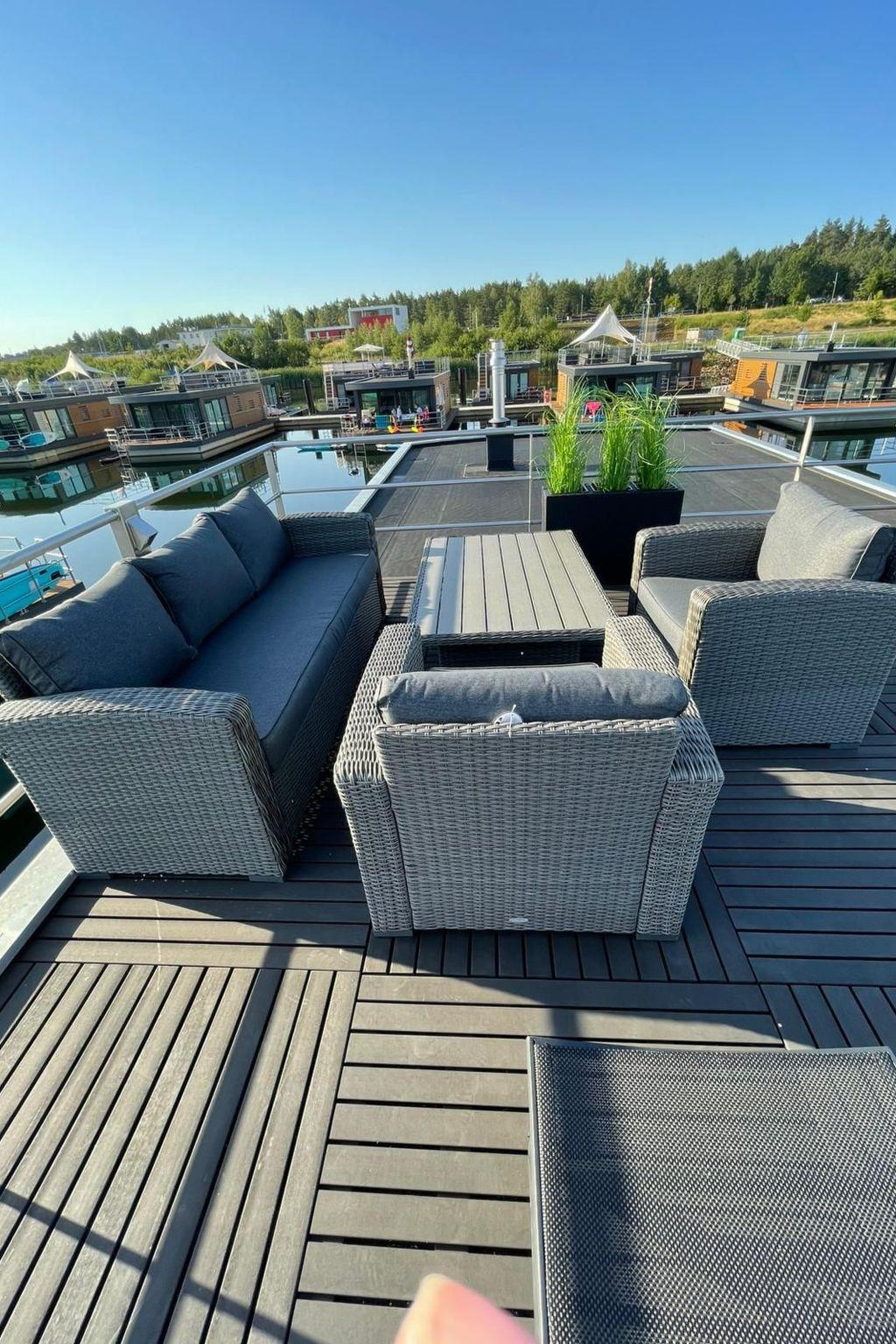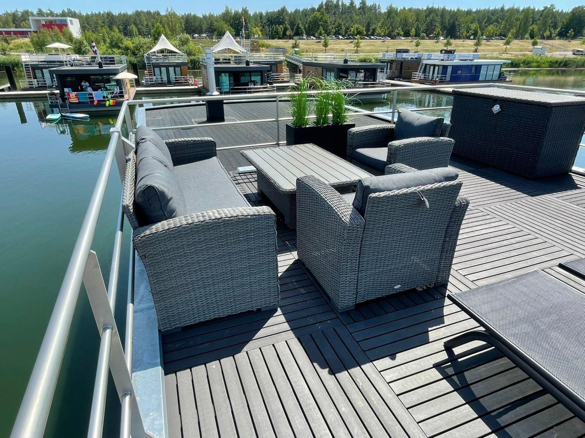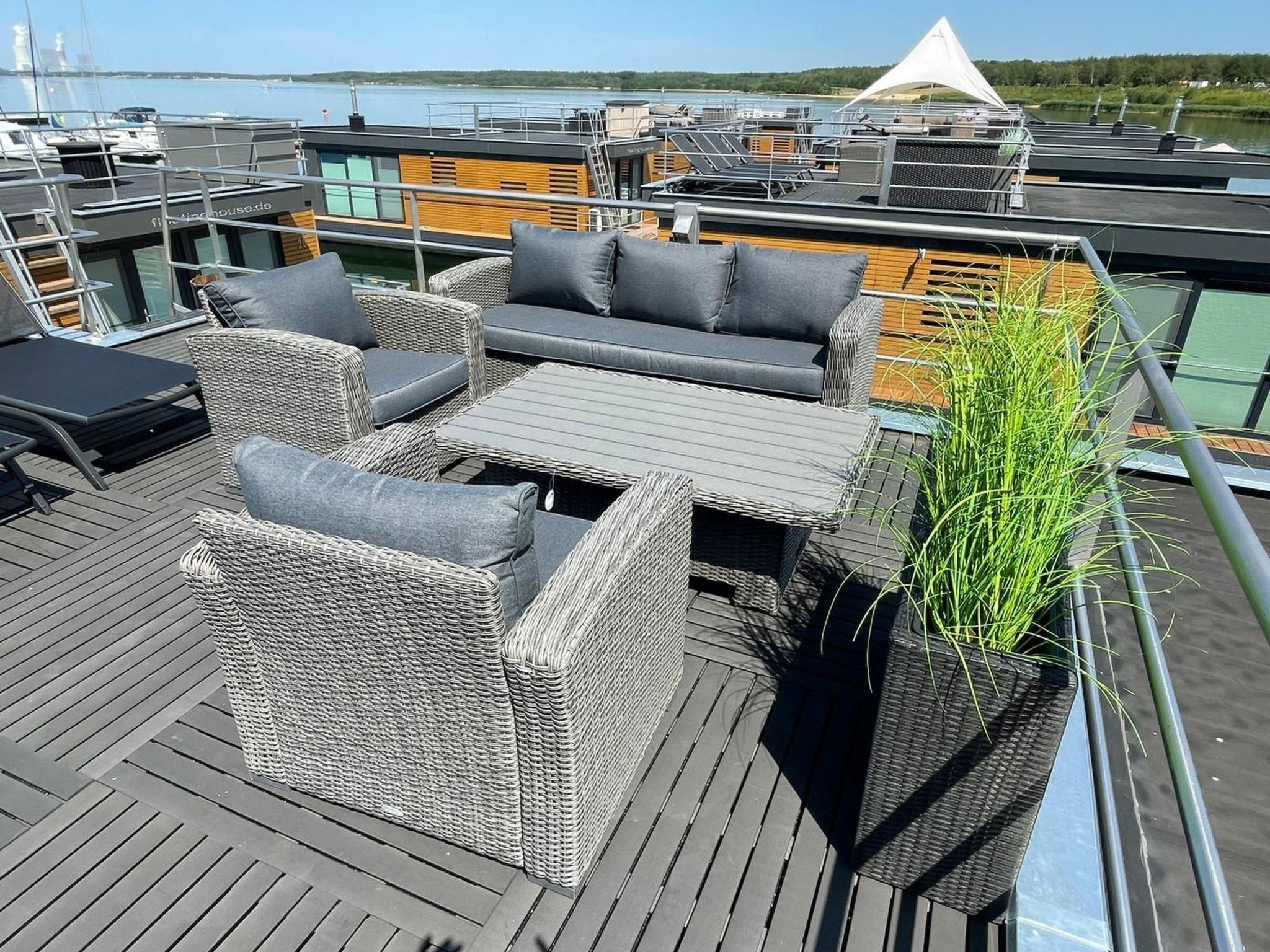 Dive away from everyday life and into your dream home on the water! The moored houseboat "Vroni" offers everything you need for a relaxing holiday with its high-quality living space and two sun terraces. Thanks to the breathtaking view, nothing stands in the way of relaxation and recreation.the house has two bedrooms, each with a comfortable double bed (1.60 m x 2.00 m). The bathroom is equipped with a shower, washbasin, mirror, hairdryer and a separate WC. The living and dining area is a stylishly furnished room. The fully equipped eat-in kitchen includes a fridge with freezer compartment, dishwasher, ceramic hob, microwave, coffee machine, toaster, kettle, crockery, cutlery and much more.from the living and dining area you can access the terrace and enjoy your meals in the lounge area or simply relax.a car park is available for you free of charge. You can drive close to the jetty for loading and unloading. Bed linen, towels and a cosy sofa blanket are included.