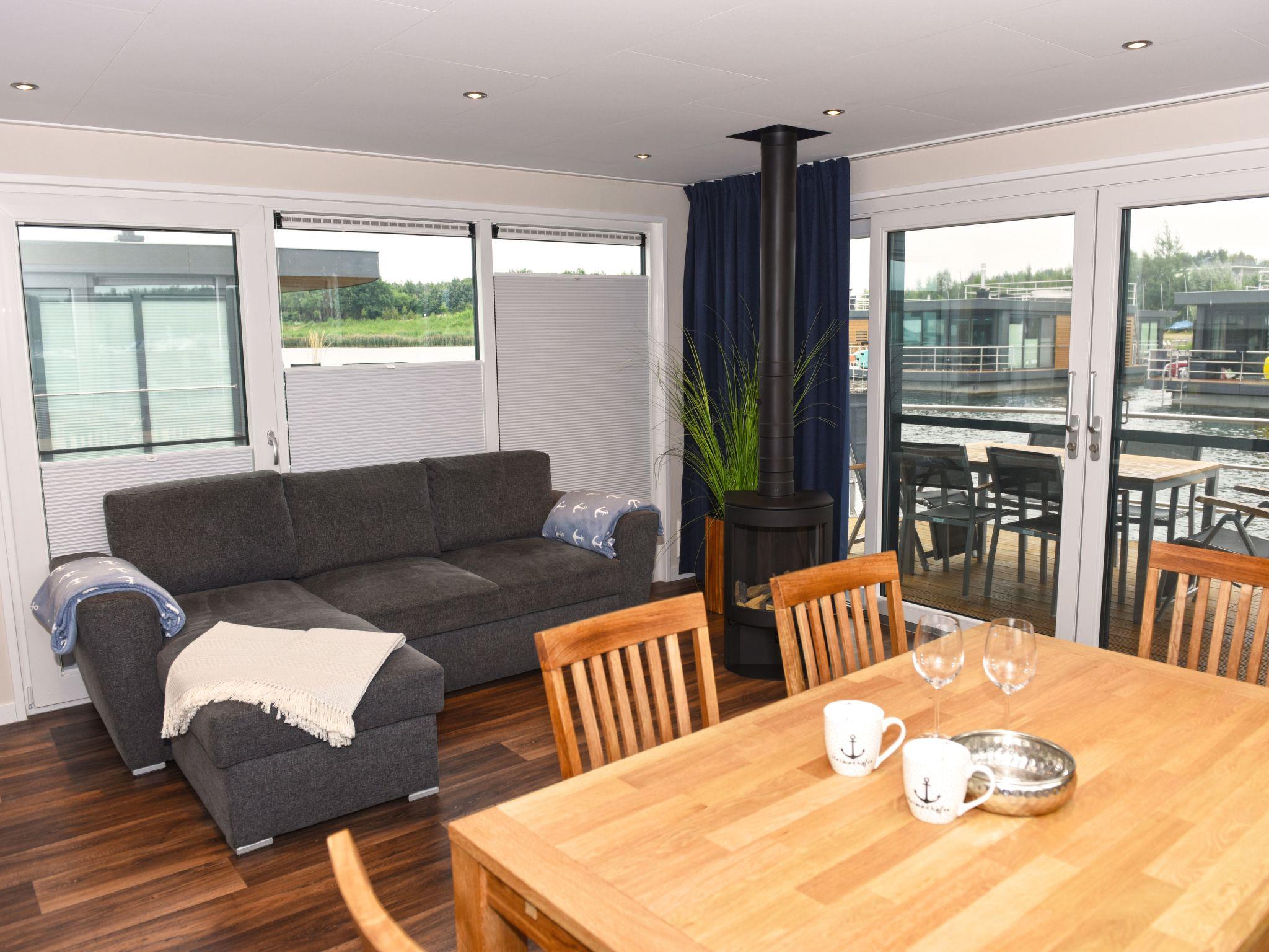 Dive away from everyday life and into your dream home on the water! The moored houseboat "Dolce Vita" offers everything you need for a relaxing holiday with its high-quality living space and two sun terraces. Thanks to the breathtaking view, nothing stands in the way of relaxation and recreation.the house has two bedrooms, each with a comfortable double bed (1.60 m x 2.00 m). The bathroom is equipped with a shower, washbasin, mirror, hairdryer and a separate WC. The living and dining area is a stylishly furnished room. The fully equipped eat-in kitchen includes a fridge with freezer compartment, dishwasher, ceramic hob, microwave, coffee machine, toaster, kettle, crockery, cutlery and much more.from the living and dining area you can access the terrace and enjoy your meals in the lounge area or simply relax.a car park is available for you free of charge. You can drive close to the jetty for loading and unloading. Bed linen, towels and a cosy sofa blanket are included.