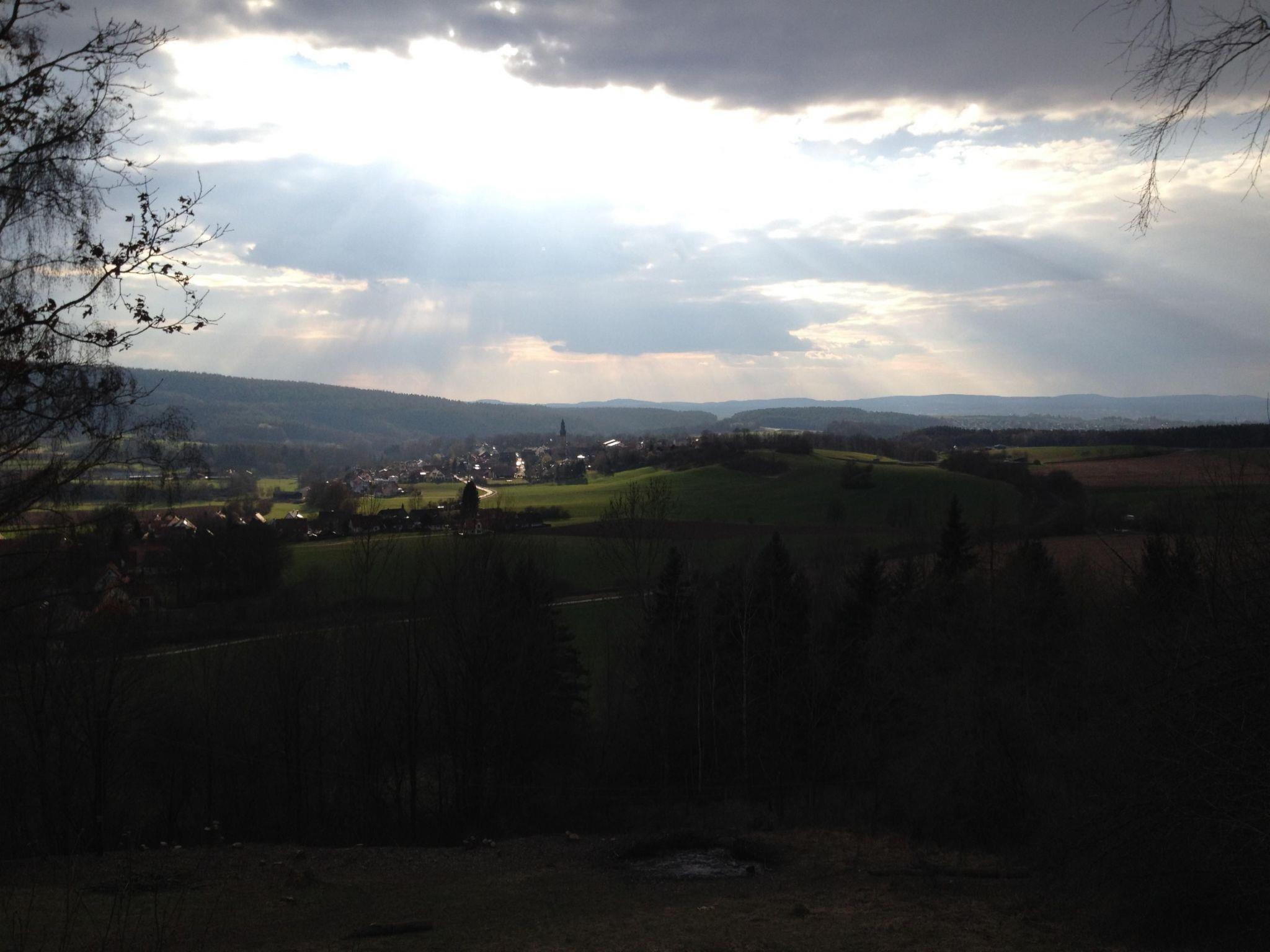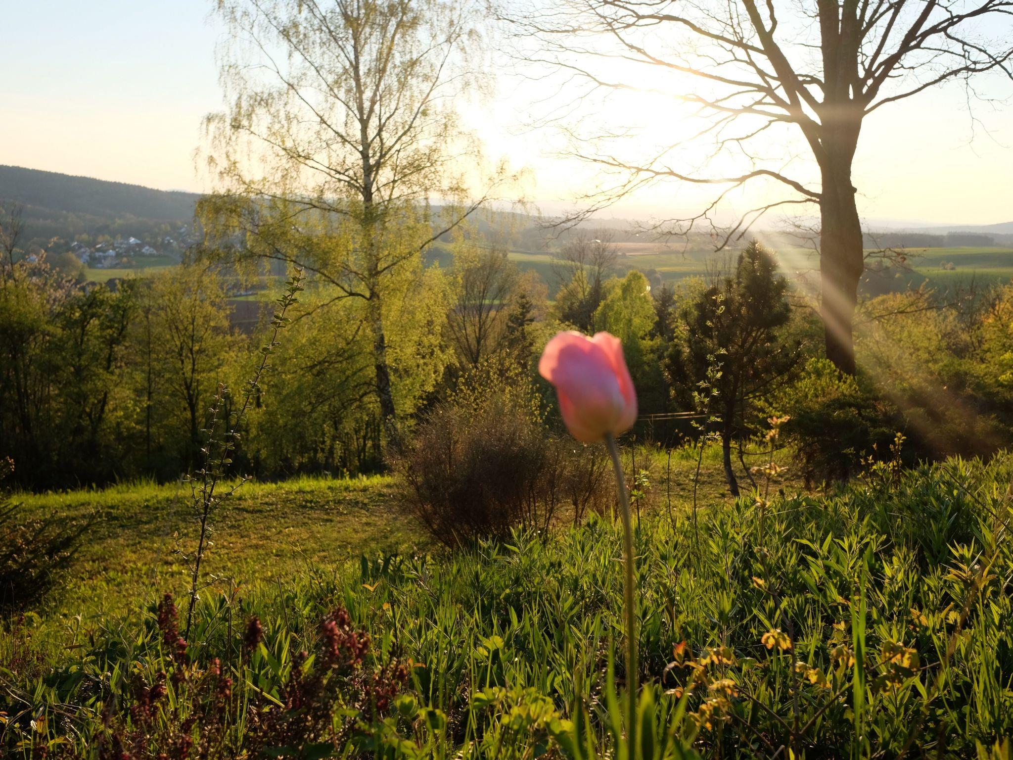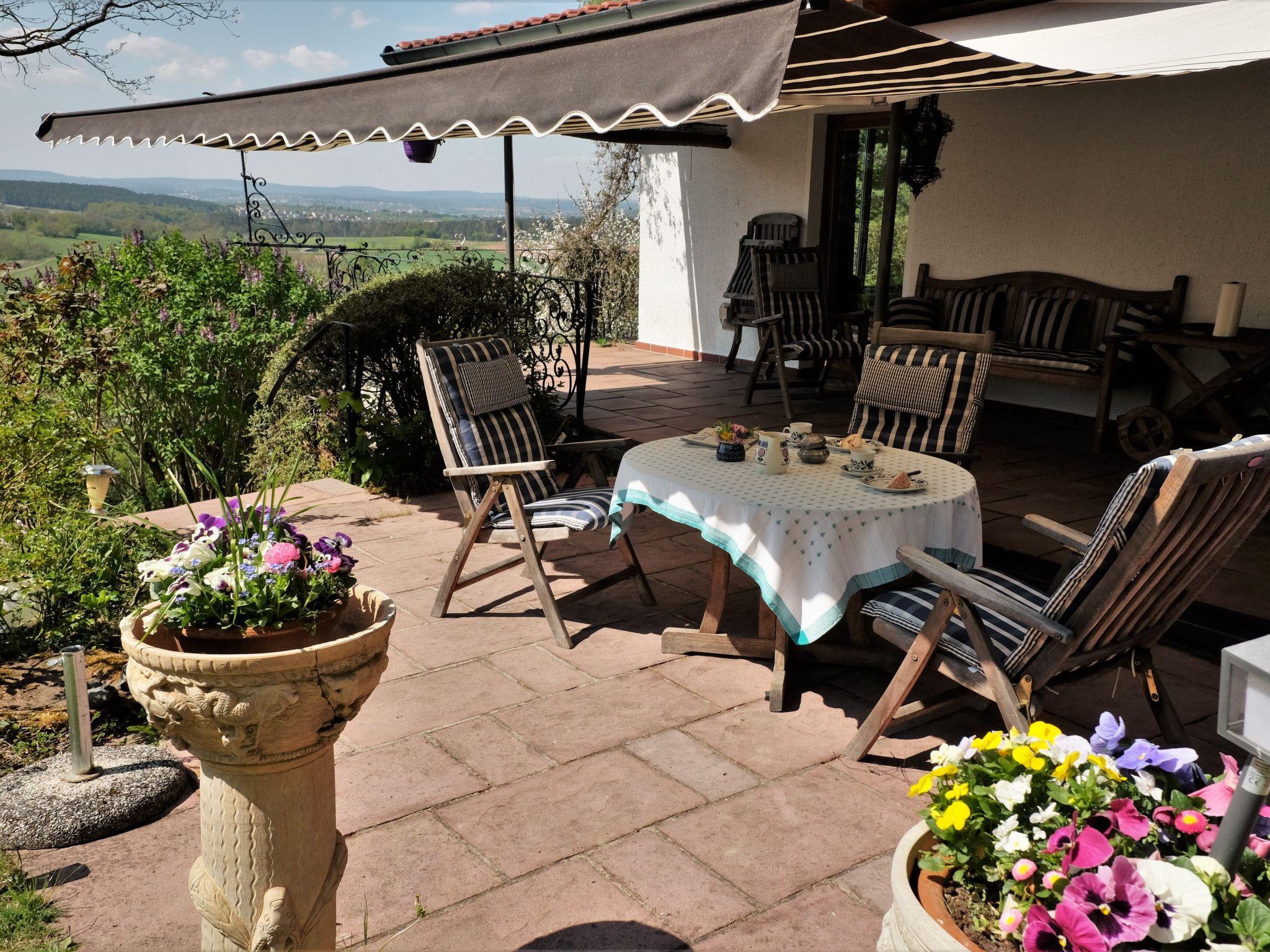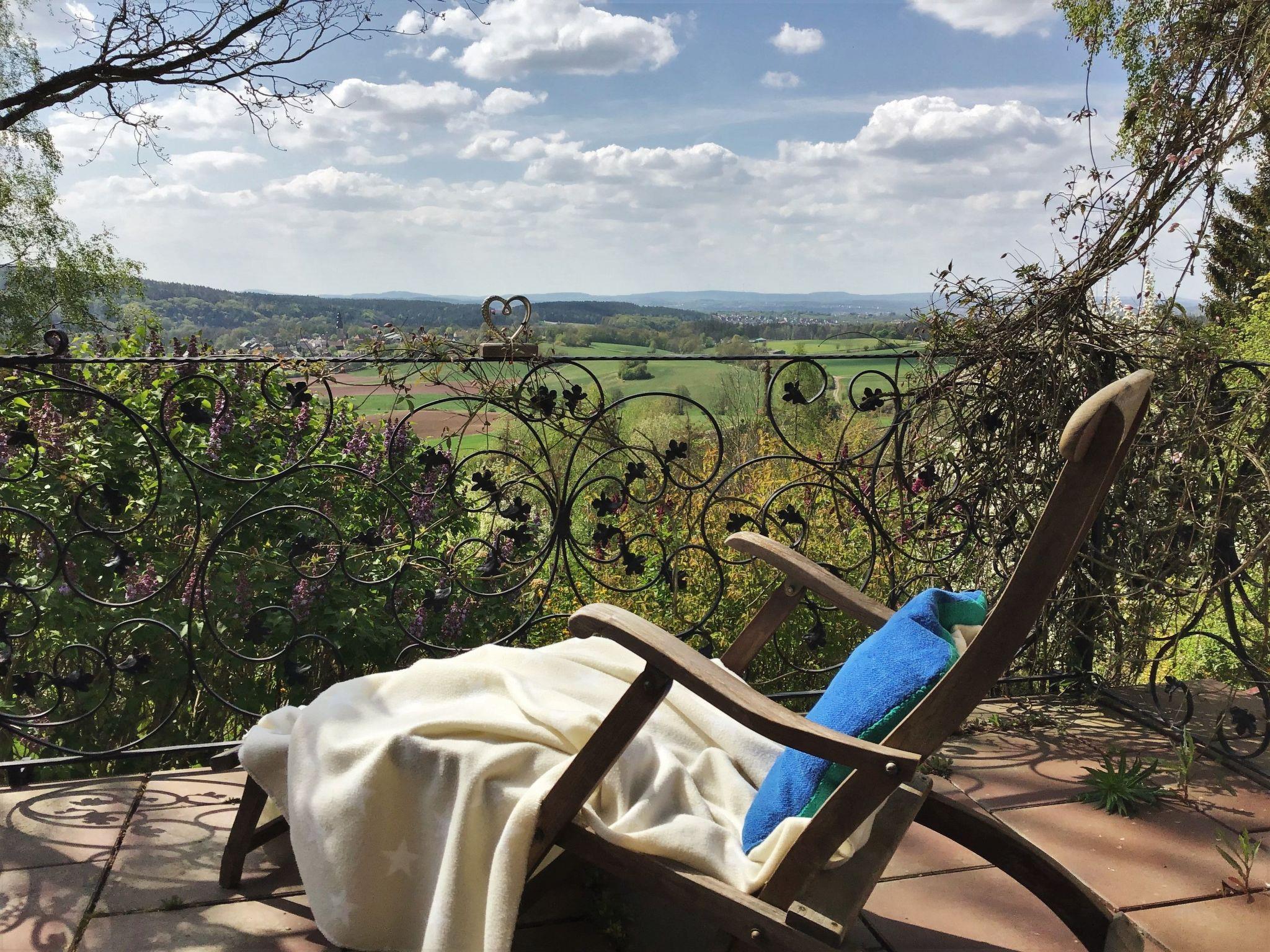 When you open the front door you step into a cosy hallway. A glass door leads into the living room, so already from here you can see the fabulous view through the big panoramic window as far as Bayreuth and Franconian Switzerland. The very homely living room has a cosy sitting corner, a rustic dining corner, a desk and a fireplace stove, a new LCD TV, a radio, two telephones, a CD player and Internet access. The latter are good for entertainment if it happens to be raining. The TV, CD player and seating are all brand new. A big sliding wooden door leads from the living room into the bedroom with a double bed 140cm wide. By opening this sliding door you can turn the two separate rooms into one big living and sleeping room. The romantic little bathroom with a toilet, washbasin and bath with a shower is very inviting. Next to the bedroom and bathroom there is a smaller room with a big cupboard wall and another bed (100 x 200cm). The pretty kitchen with blue-painted wooden cupboards is equipped with a dishwasher, gas stove, fridge (no freezer compartment), microwave and cookware, a Nespresso machine, coffee machine and toaster. There is not oven. The kitchen and the living room open onto the roofed terrace with very beautiful seating and electric lighting. There is a heater for cooler evenings.