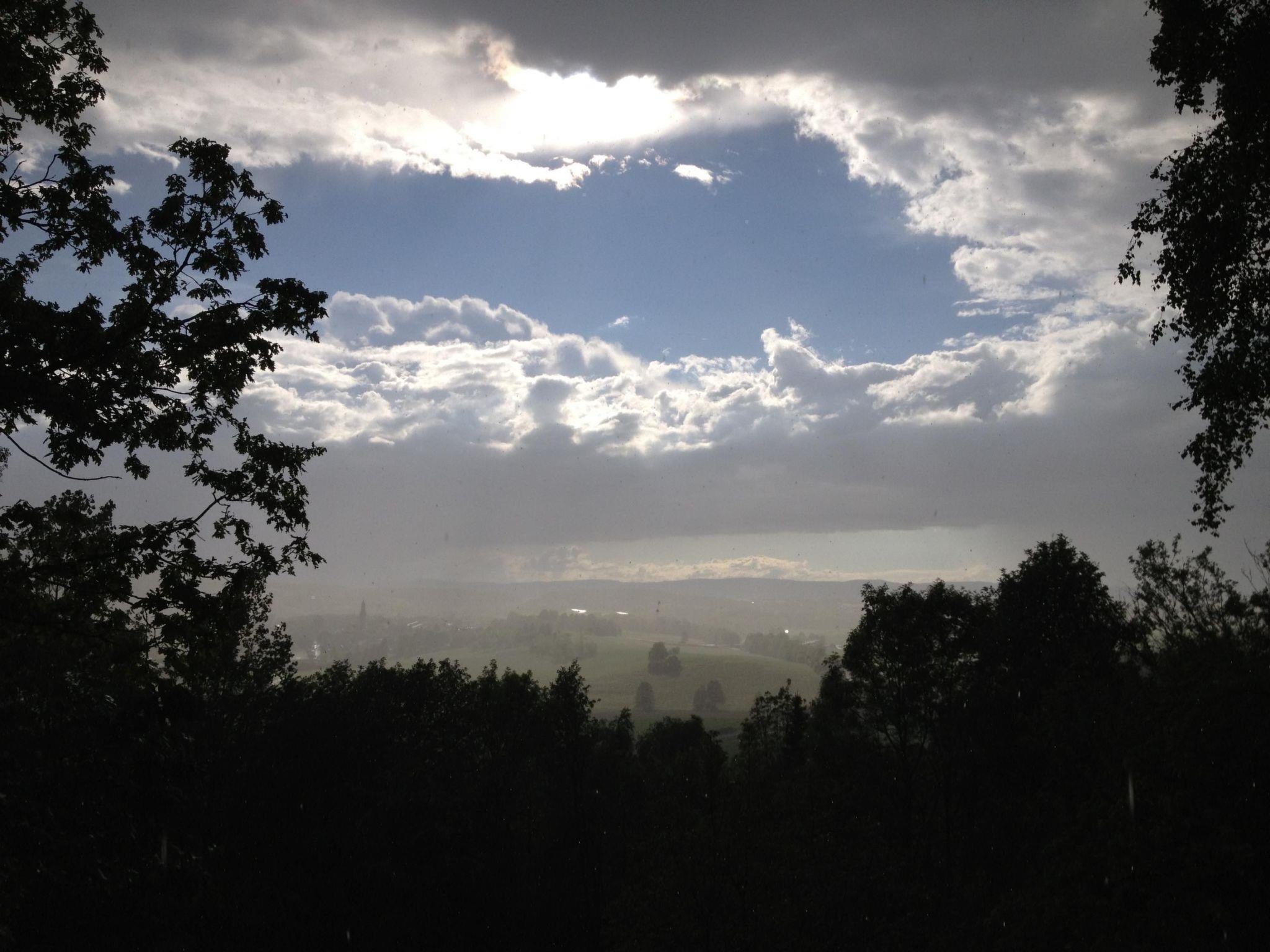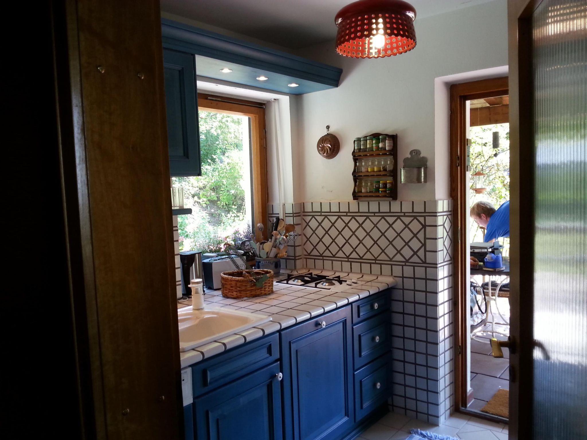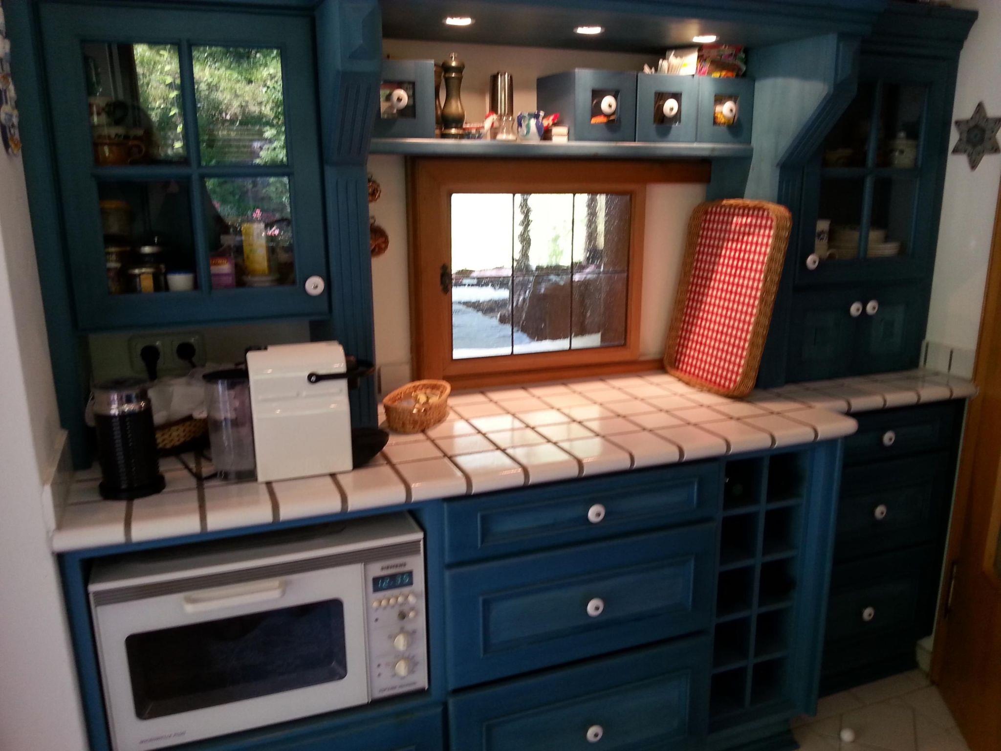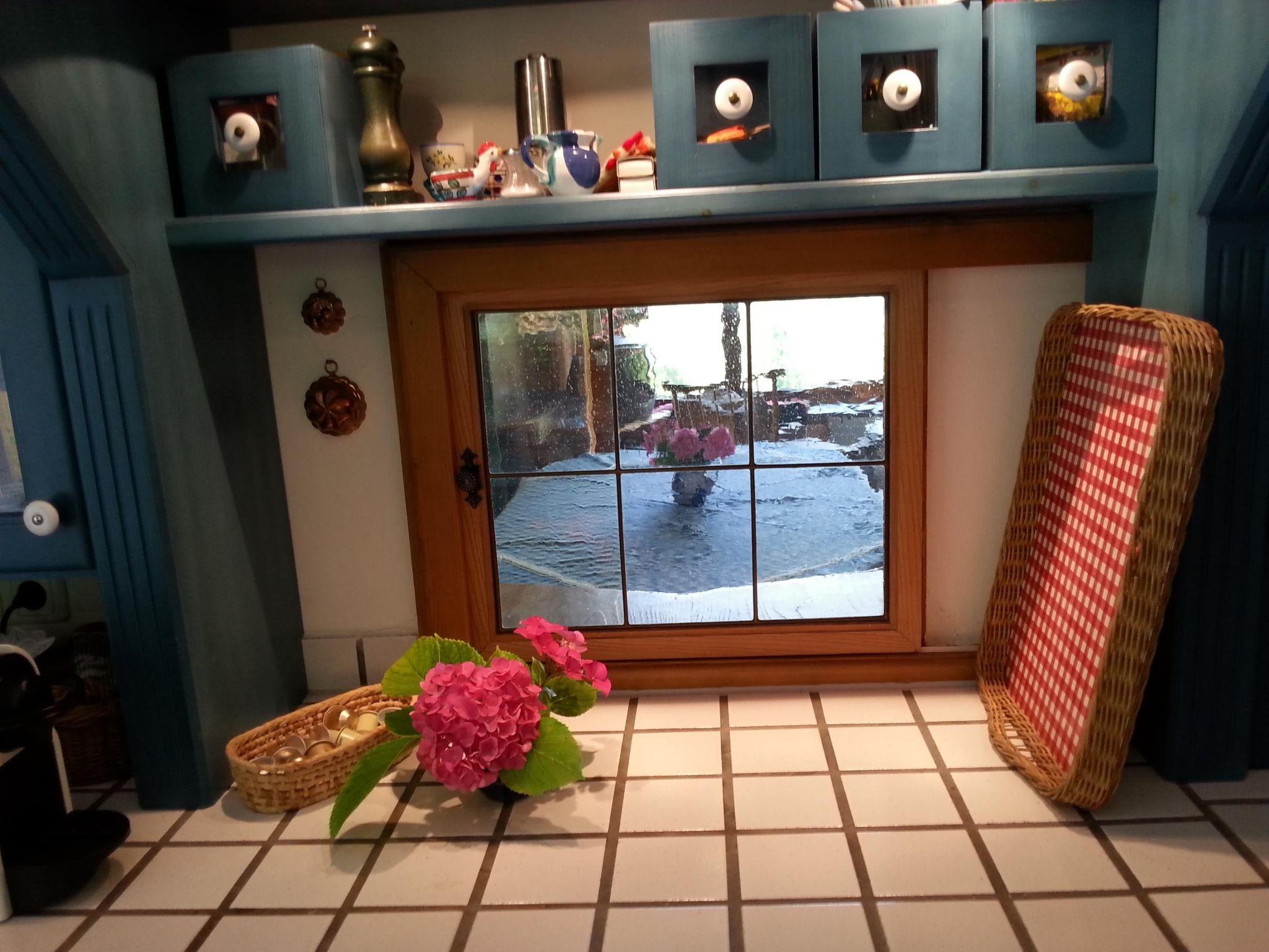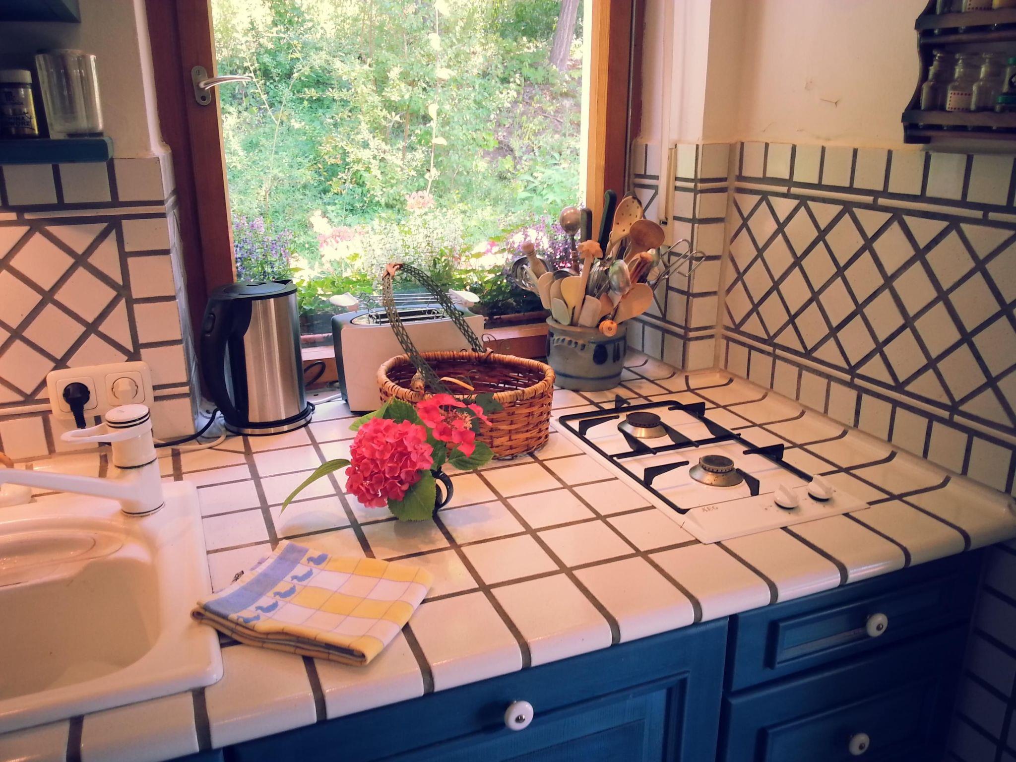 When you open the front door you step into a cosy hallway. A glass door leads into the living room, so already from here you can see the fabulous view through the big panoramic window as far as Bayreuth and Franconian Switzerland. The very homely living room has a cosy sitting corner, a rustic dining corner, a desk and a fireplace stove, a new LCD TV, a radio, two telephones, a CD player and Internet access. The latter are good for entertainment if it happens to be raining. The TV, CD player and seating are all brand new. A big sliding wooden door leads from the living room into the bedroom with a double bed 140cm wide. By opening this sliding door you can turn the two separate rooms into one big living and sleeping room. The romantic little bathroom with a toilet, washbasin and bath with a shower is very inviting. Next to the bedroom and bathroom there is a smaller room with a big cupboard wall and another bed (100 x 200cm). The pretty kitchen with blue-painted wooden cupboards is equipped with a dishwasher, gas stove, fridge (no freezer compartment), microwave and cookware, a Nespresso machine, coffee machine and toaster. There is not oven. The kitchen and the living room open onto the roofed terrace with very beautiful seating and electric lighting. There is a heater for cooler evenings.