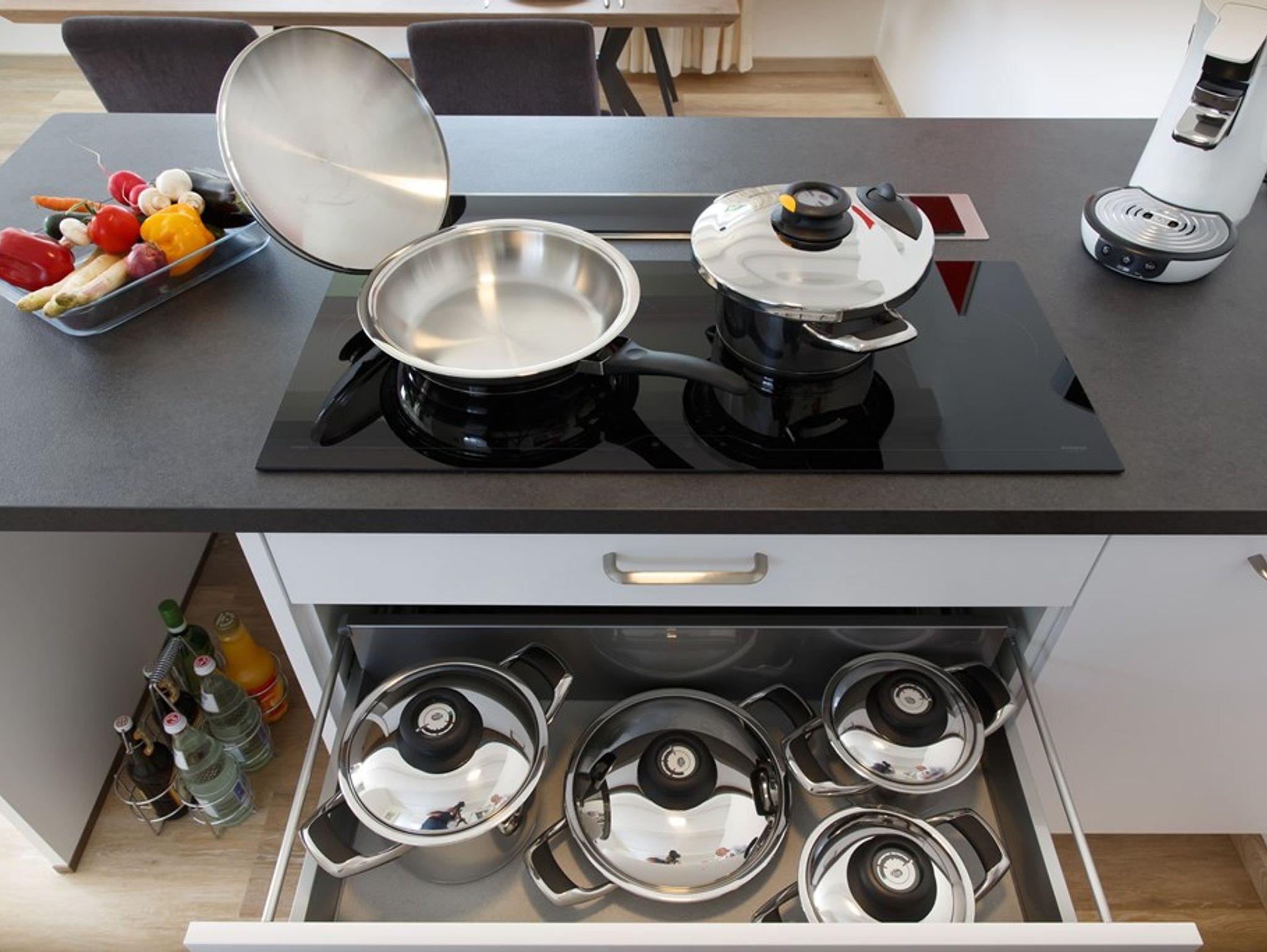 • Hochwertige AMC - Töpfe in der perfekt ausgestatteten Profiküche laden Sie zum Kochen ein.