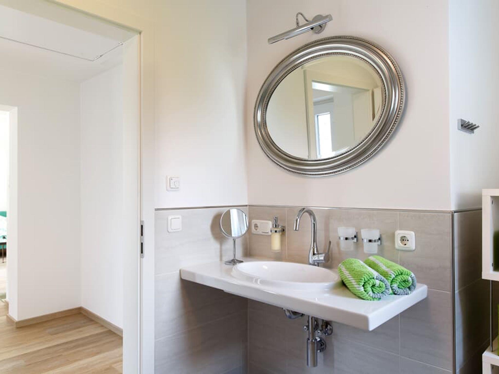 • Waschbecken, WC und Dusche (behindertengerecht nach DIN), Schrankregal, Wäschestnder, Föhn