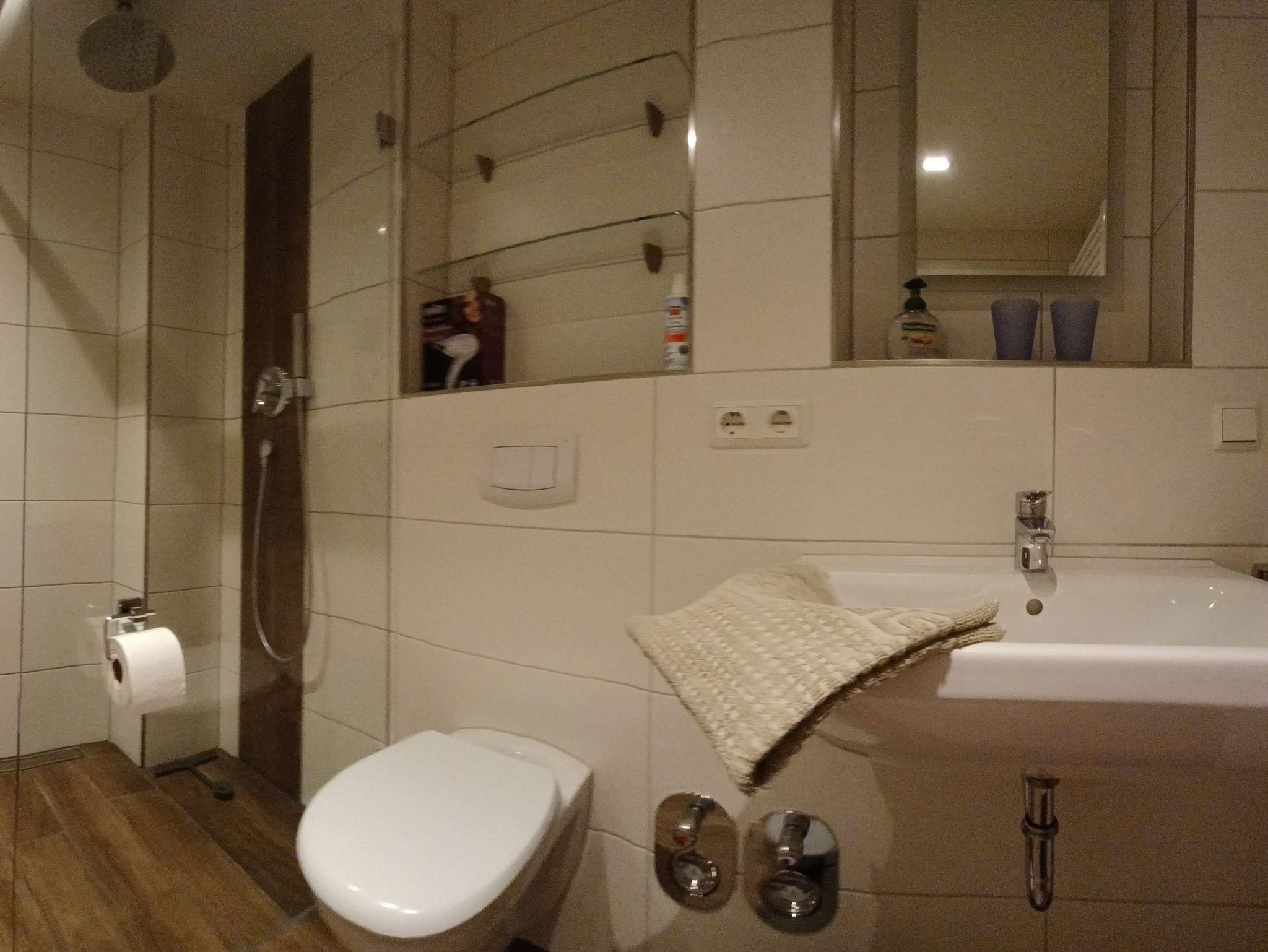 Das Badezimmer verfügt über eine barrierefreie Dusche, WC, Waschbecken und einen Handtuchheizkörper. Ein Föhn ist vorhanden. Das Badezimmer verfügt über eine Fußbodenheizung.