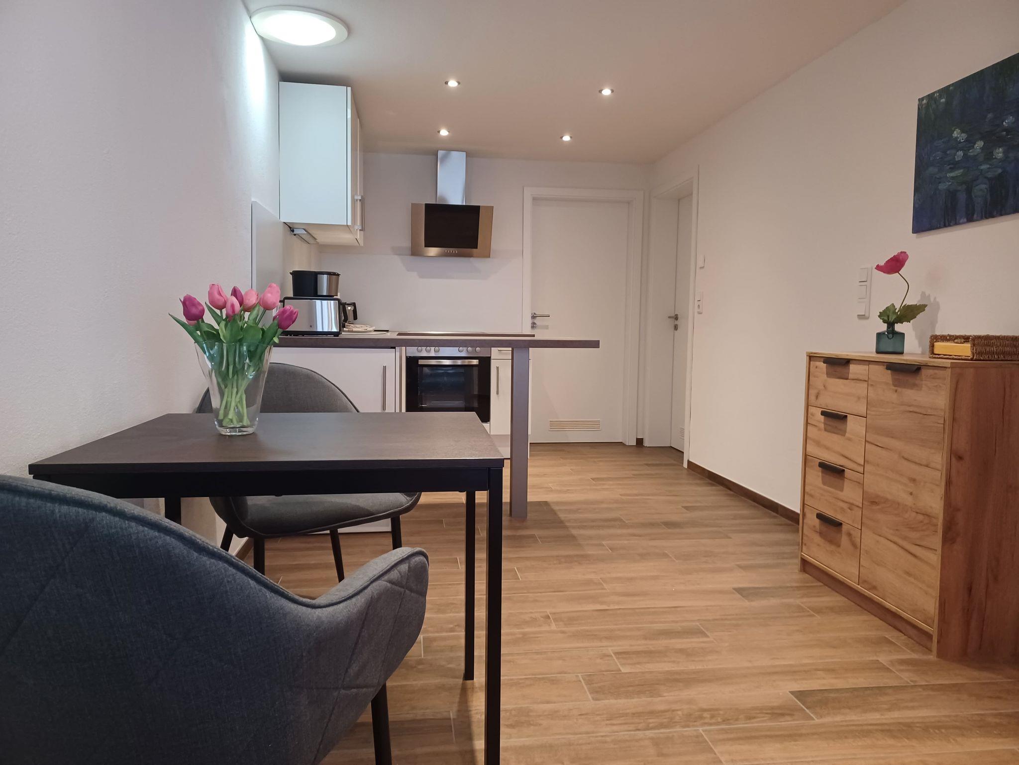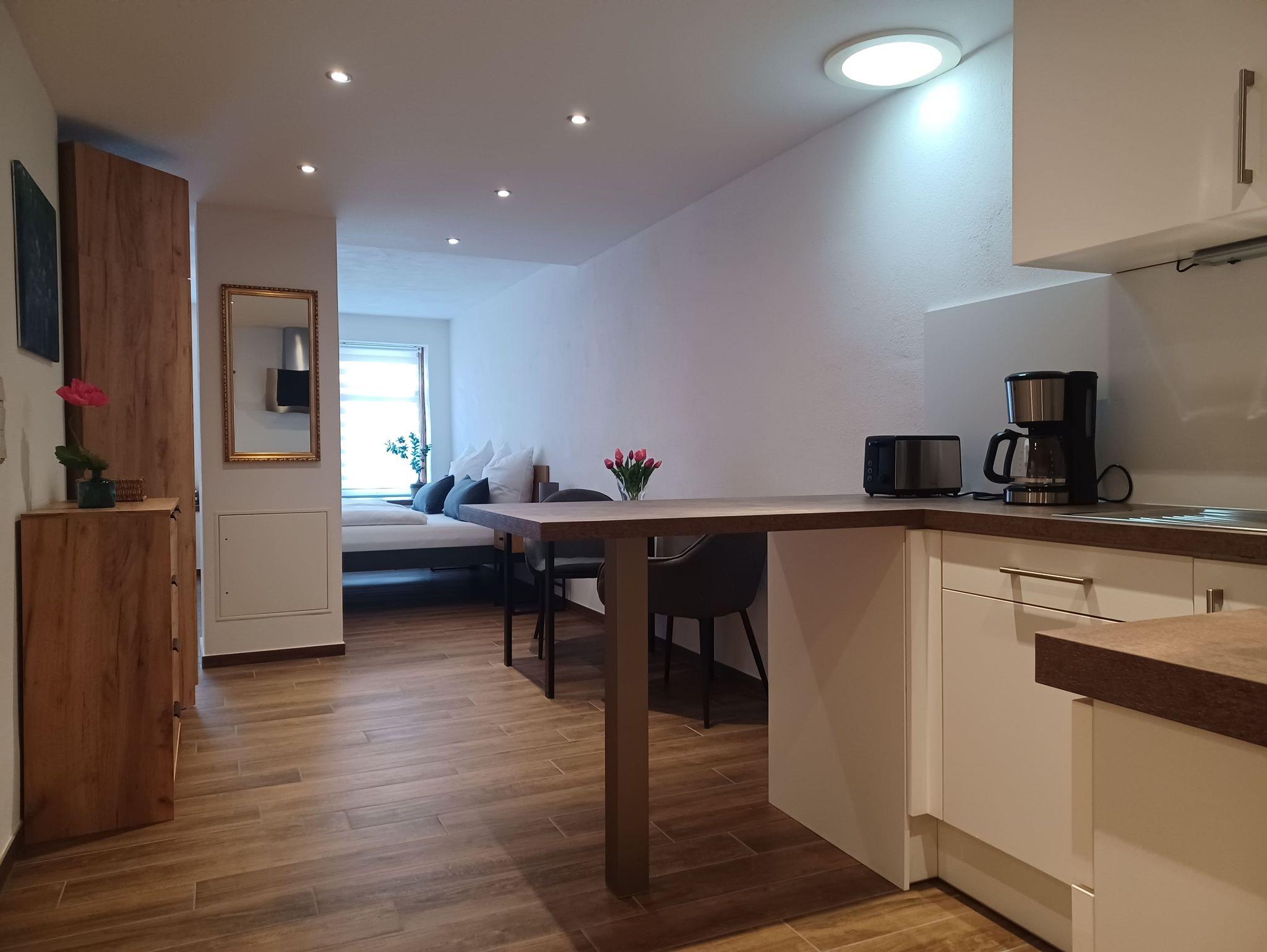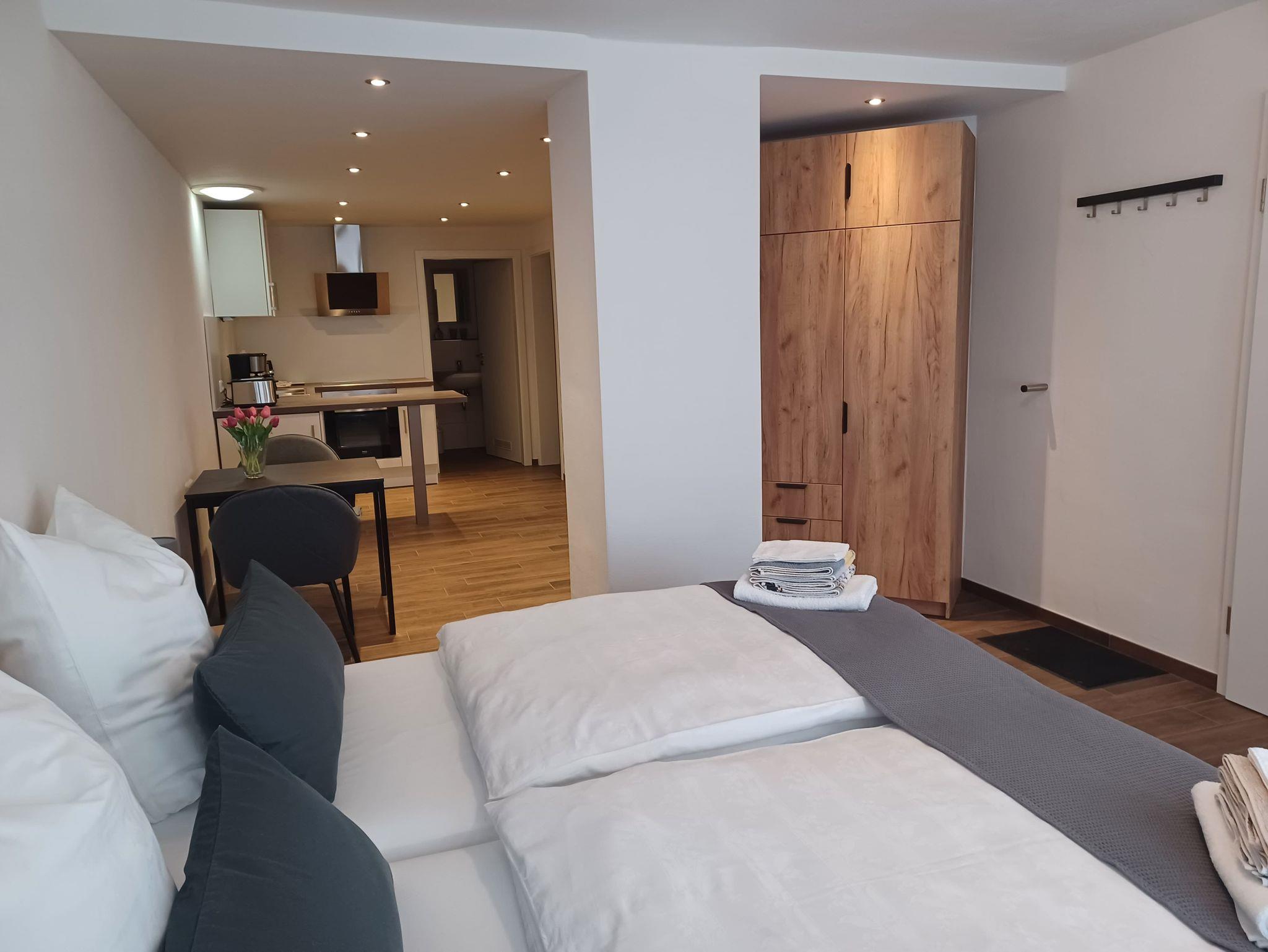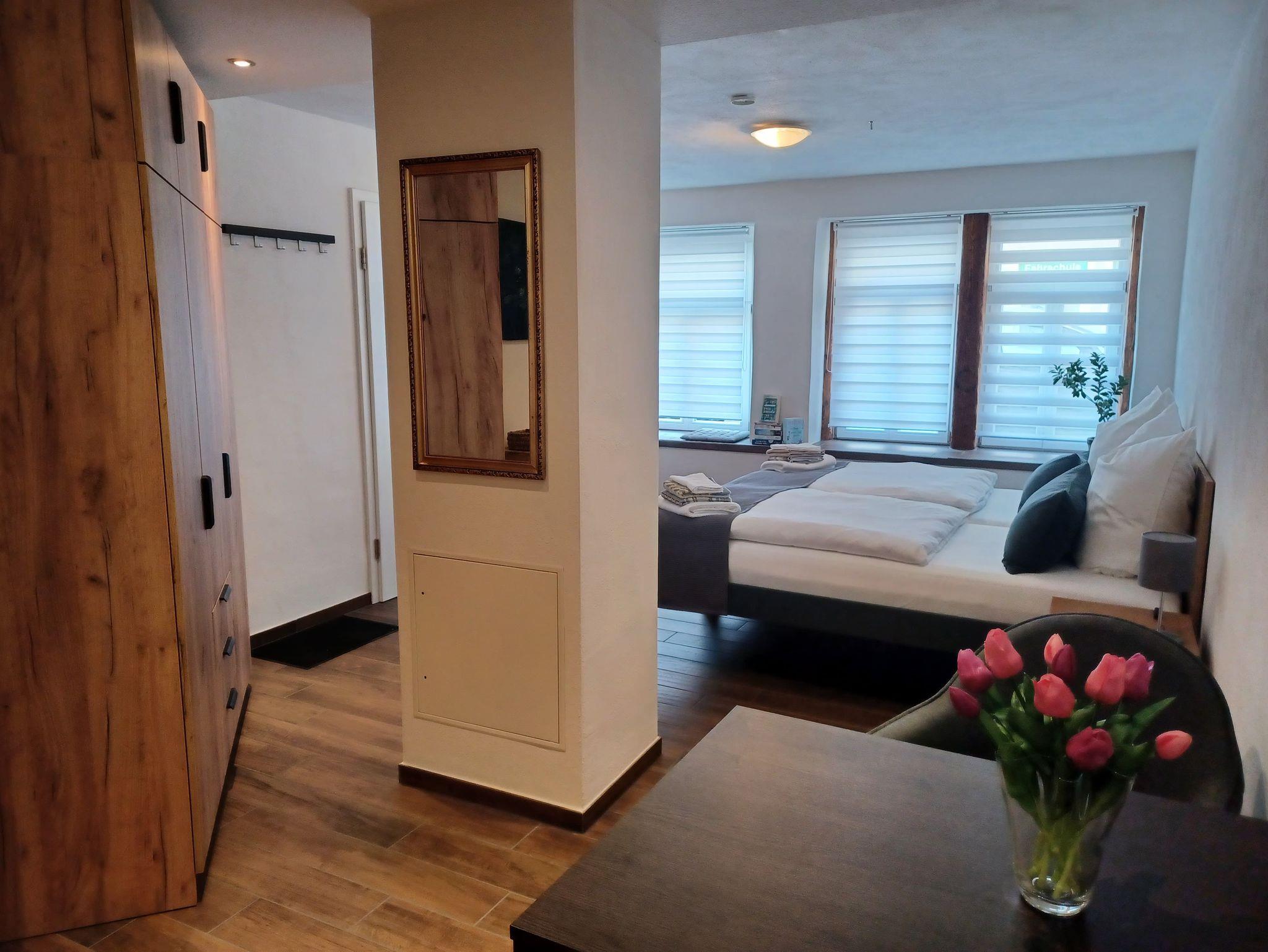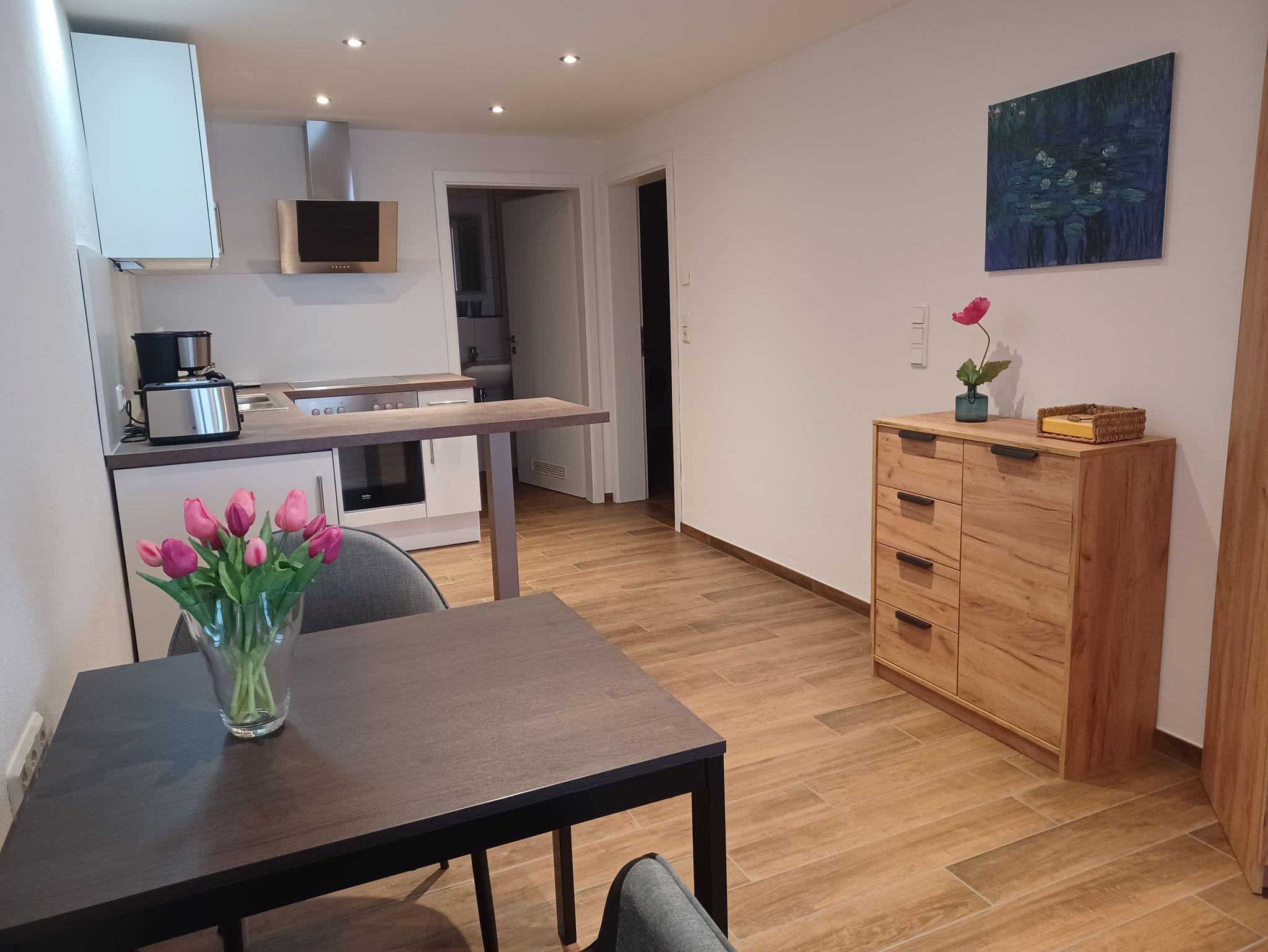 Das Apartment am Fischbrunnen besteht aus einem Wohn/-Schlafraum mit Küchenzeile, einem separatem Badezimmer mit Dusche und WC und einem Abstellraum. Das Apartment verfügt über eine Fußbodenheizung.