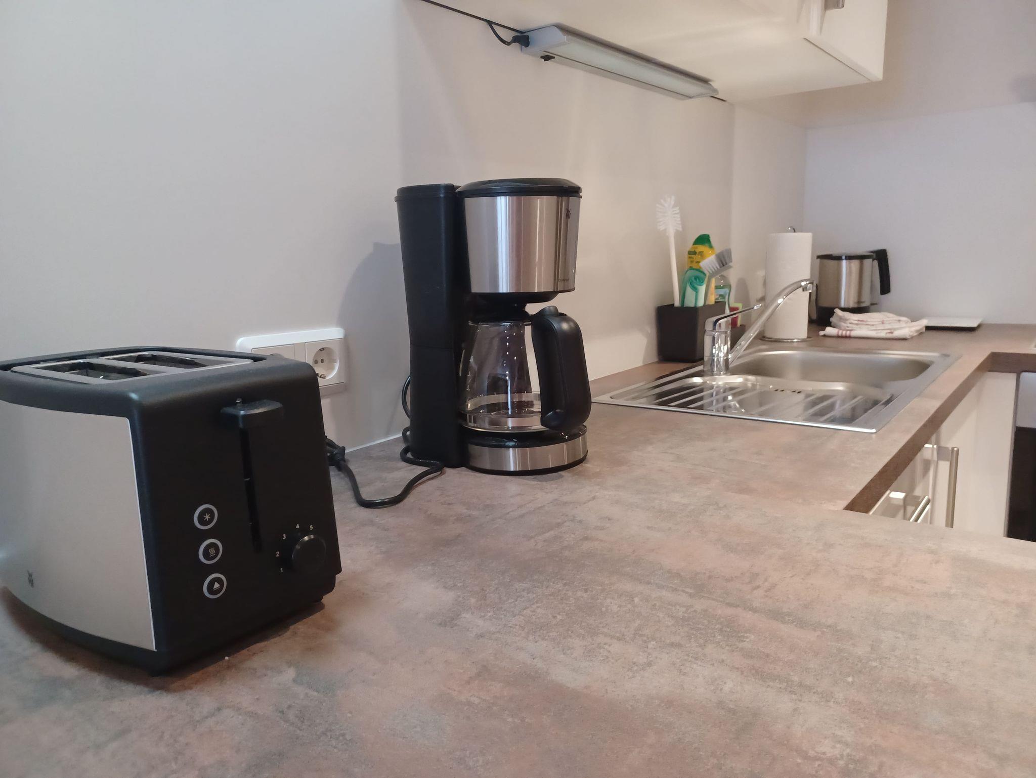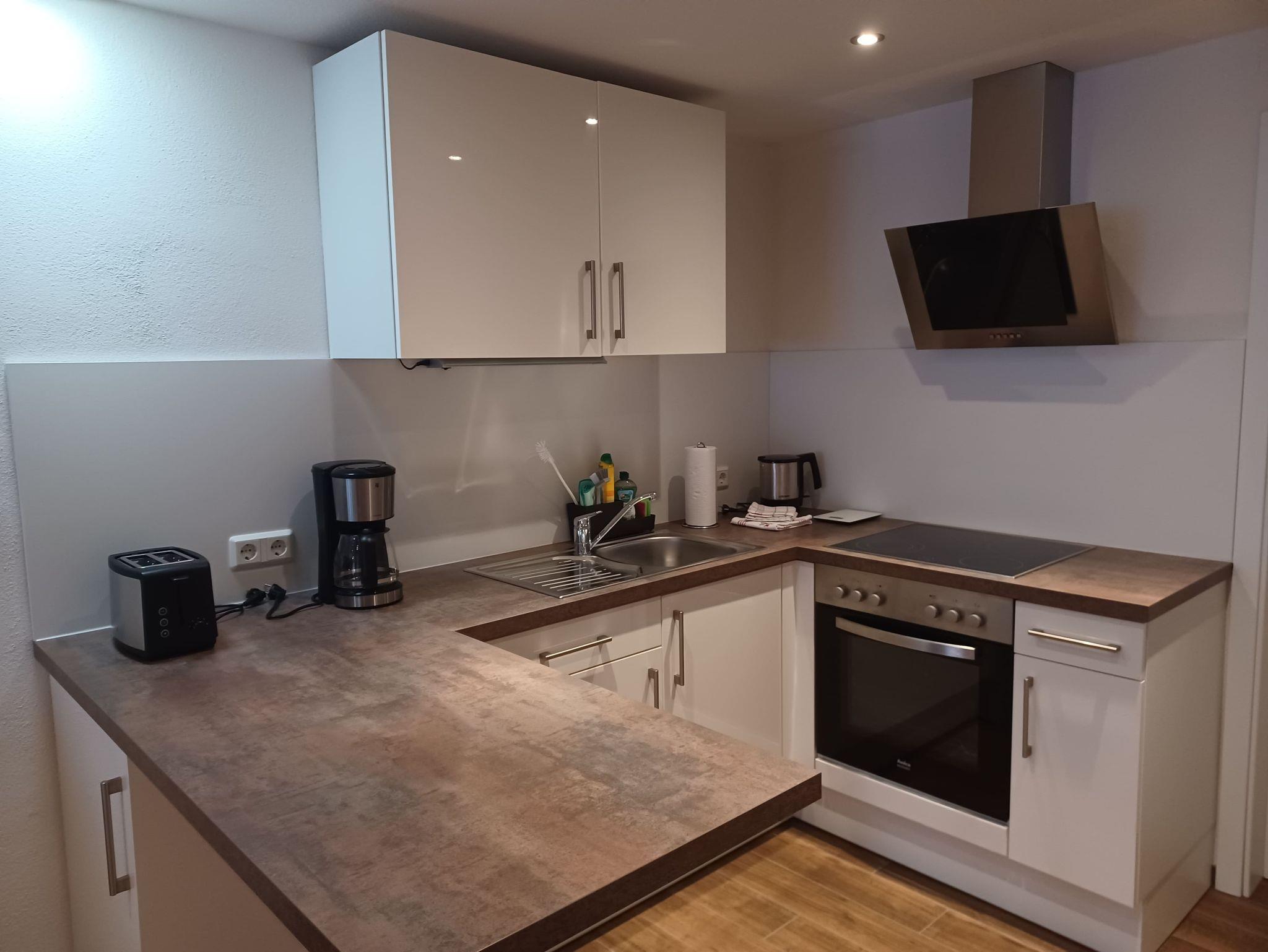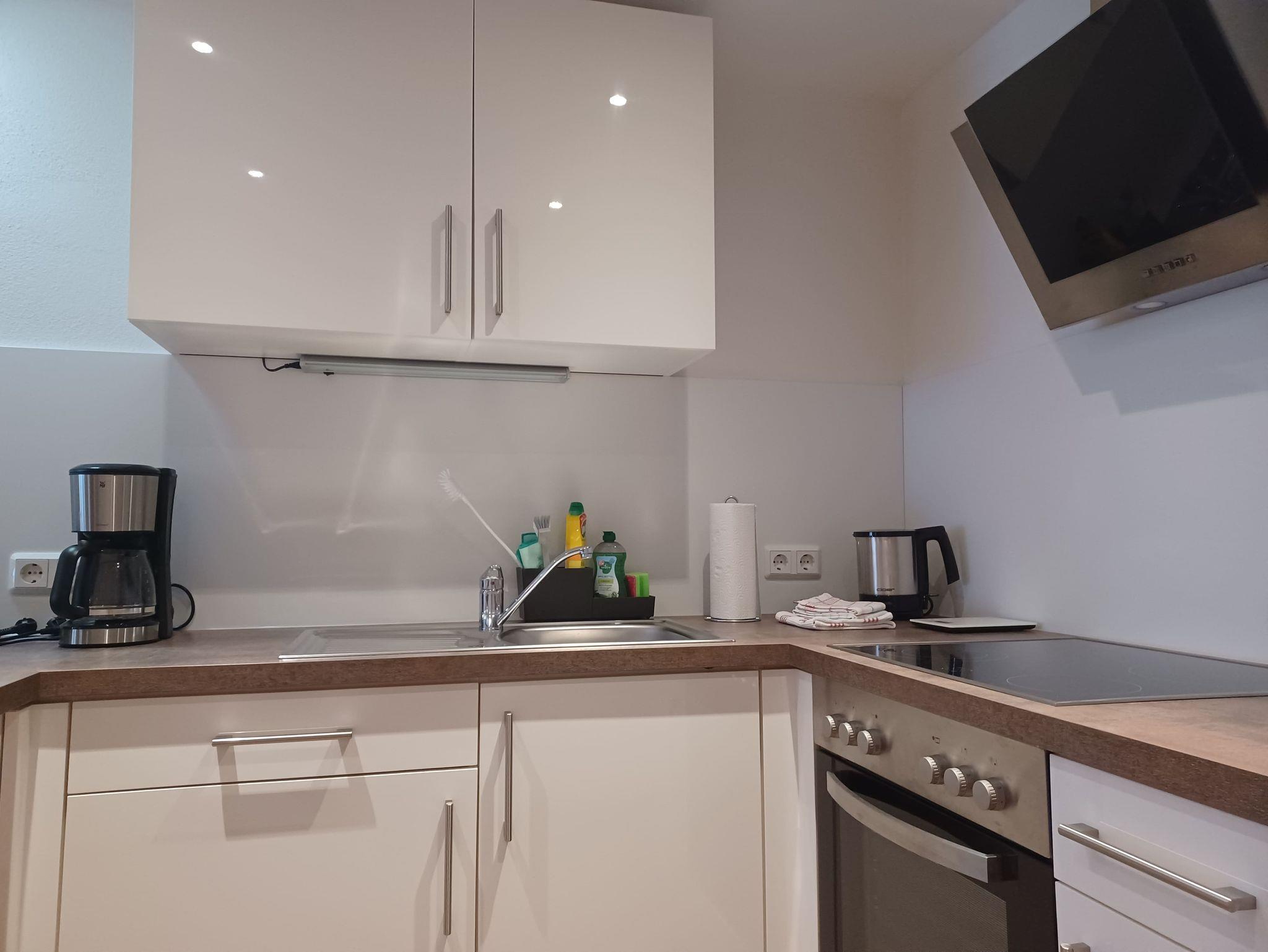 Die im Wohn-/ Schlafraum integrierte Küchenzeile verfügt über einen Kühlschrank mit kleinem Gefrierfach, einer Spüle und einem Herd mit Cerankochfeld und Backofen. Toaster, Wasserkocher und sowie Geschirr und Besteck gehören zur Ausstattung.