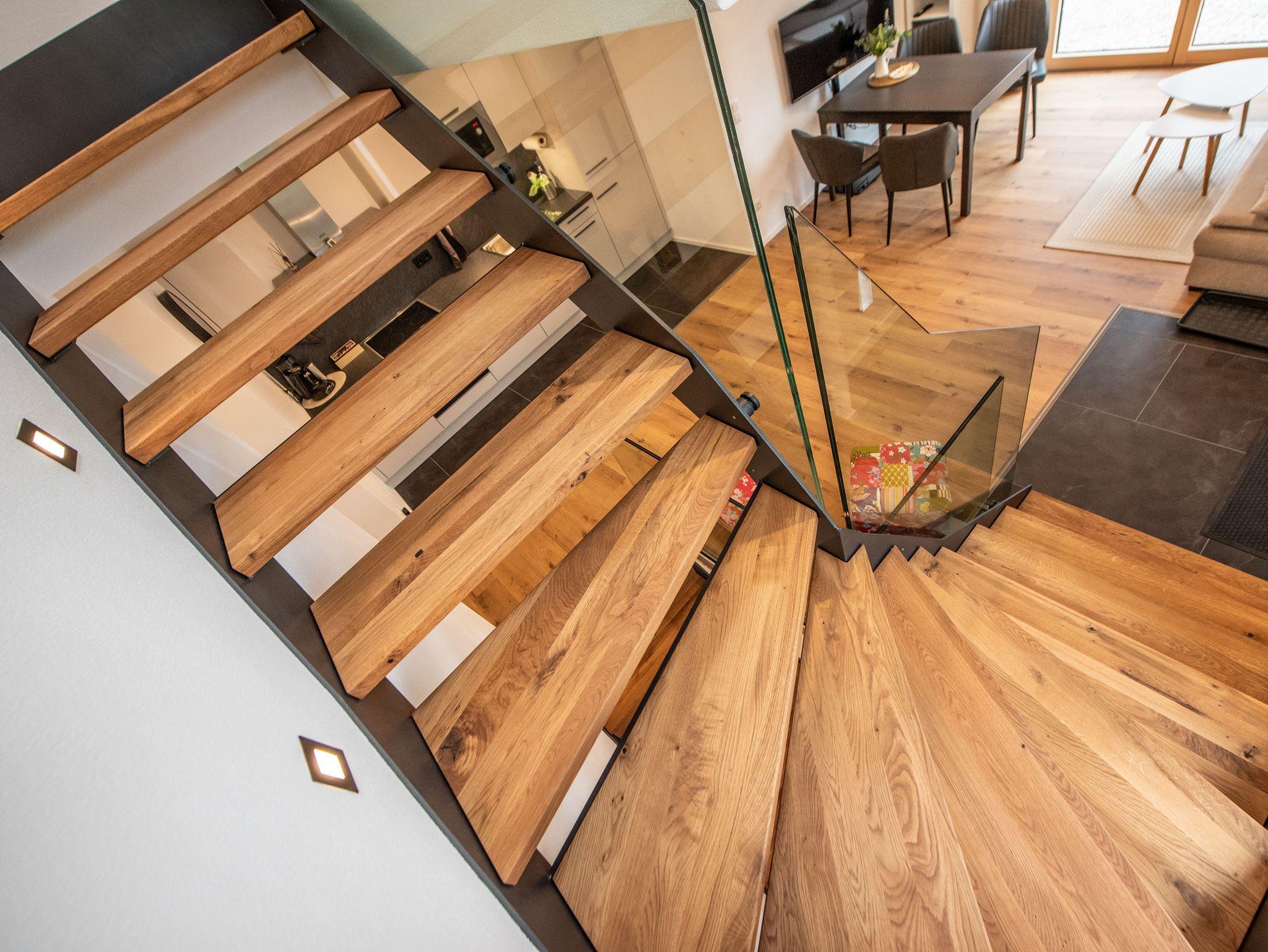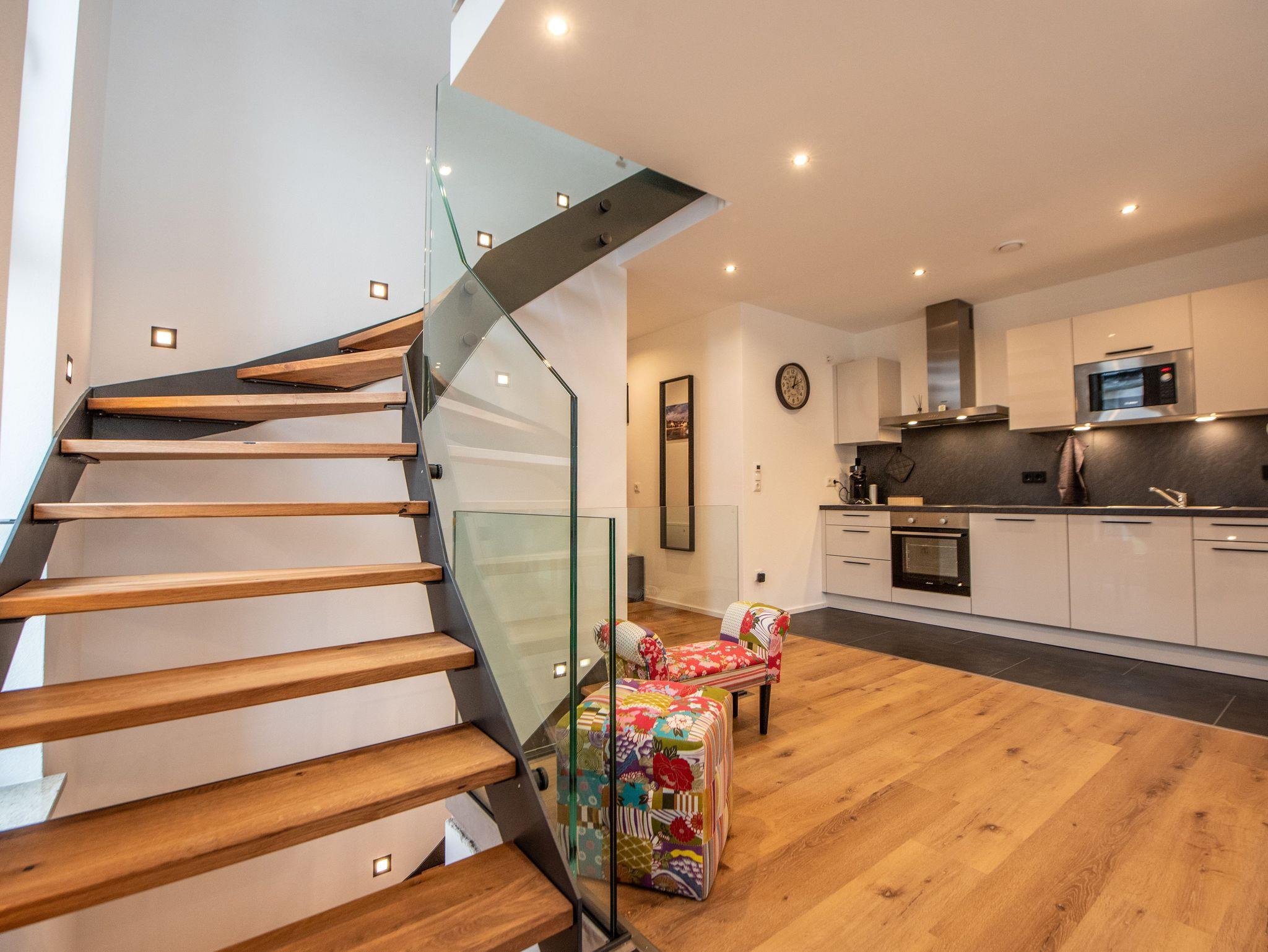 Das großzügige und modern eingerichtete Appartement erstreckt sich über 2 Etagen. Ebenerdig empfängt Sie die offene, voll ausgestattete Küche, die keine Wünsche offen lässt mit Wohn-/Essbereich, Zugang zur Terrasse mit kleinem Garten und einem Badezimmer mit ebenerdiger Dusche und WC.