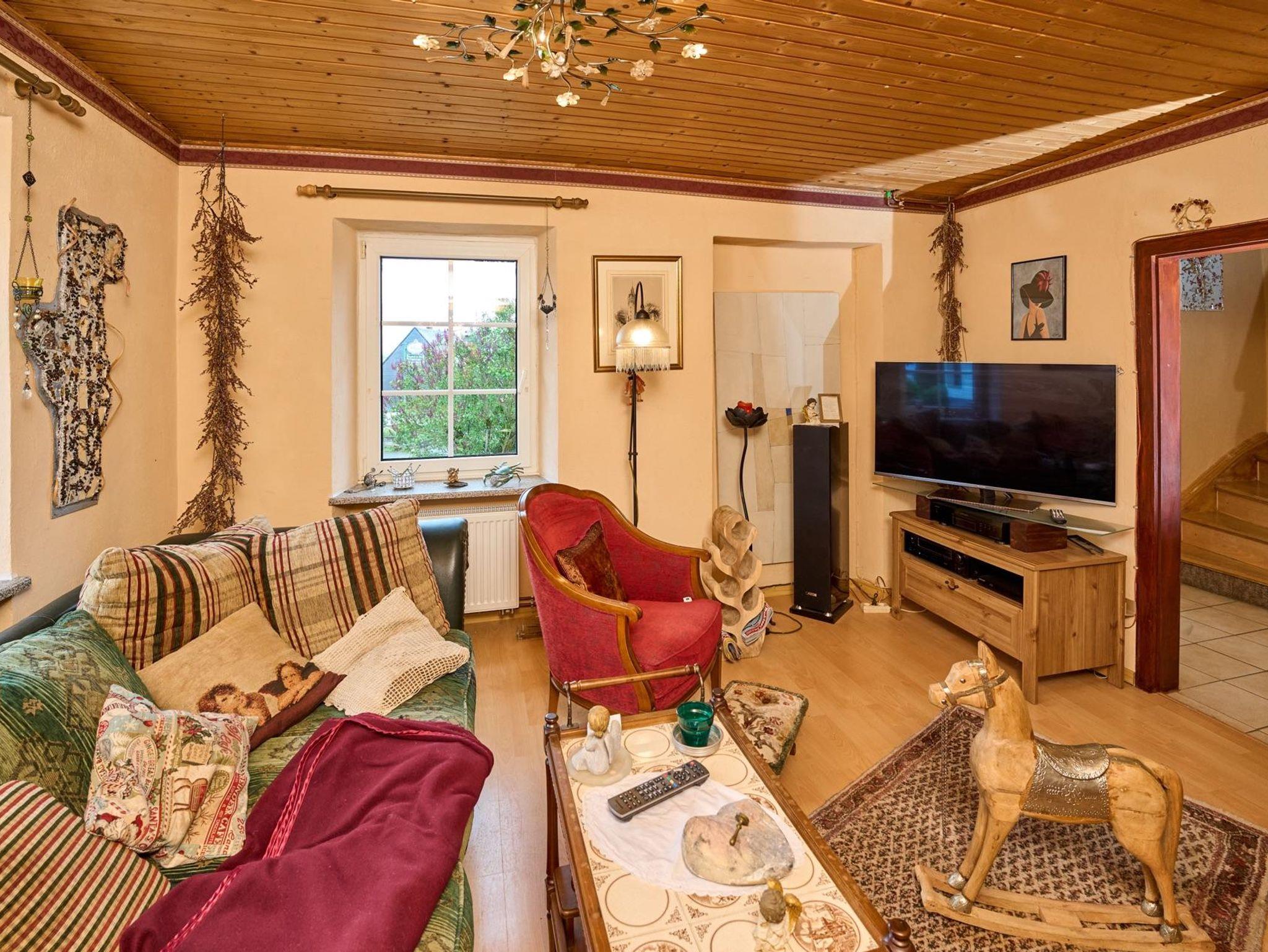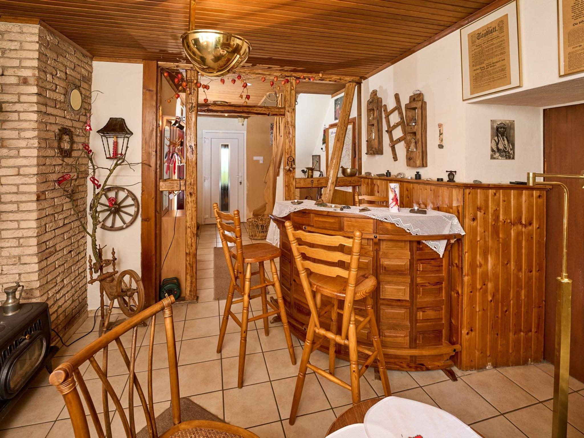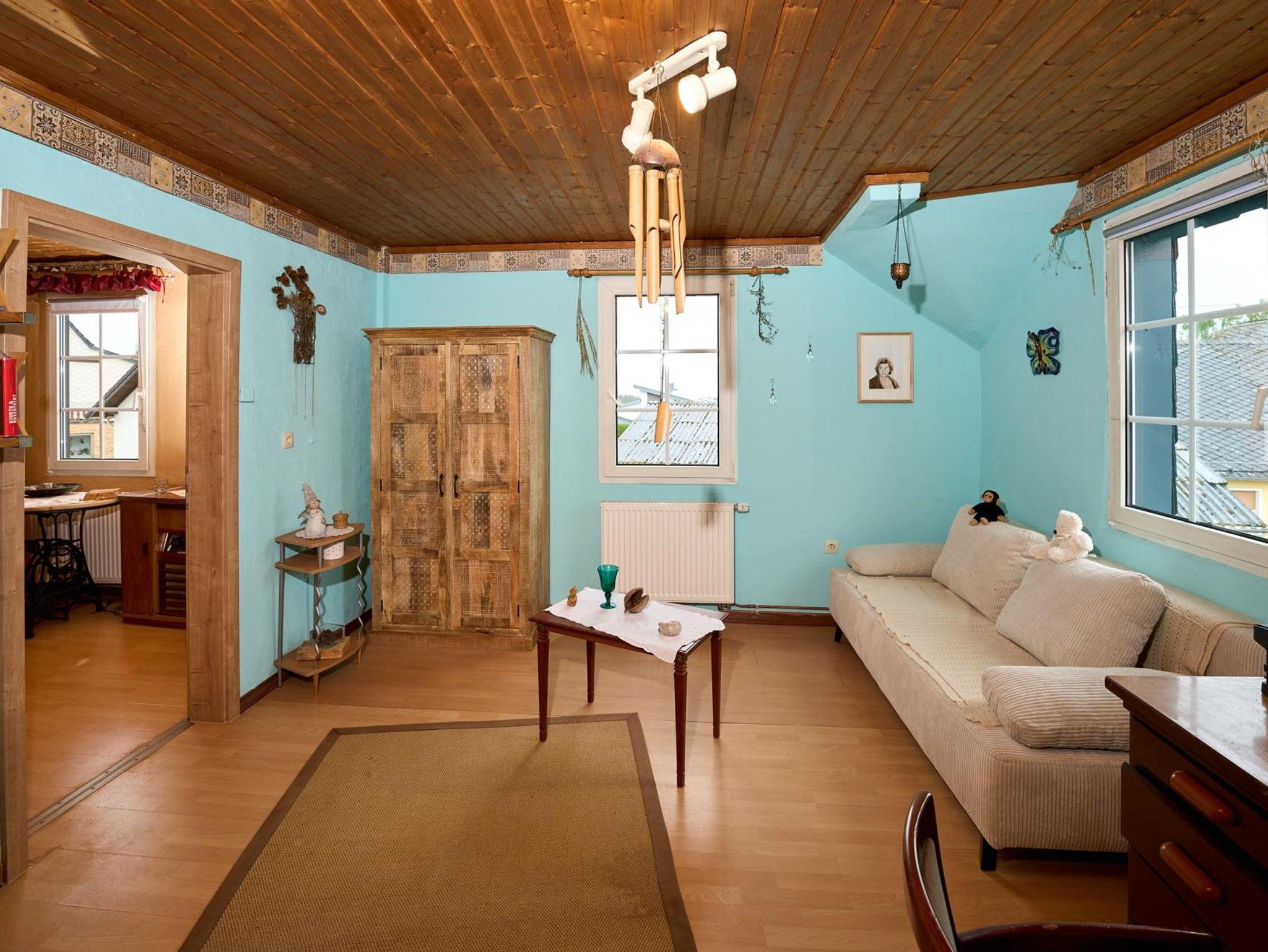 Das malerische Teilfachwerkhaus aus dem frühen 20. Jahrhundert mit moderner Ausstattung und einer Wohnfläche von insgesamt 92 qm bietet nicht nur durch seine Holzvertäfelungen eine ausgesprochen gemütliche Atmosphäre. Eine Bar sowie direkt daneben eine Sitzecke, umgeben von einer ansprechenden Dekoration, schaffen eine Verweilstimmung. Im Untergeschoss befinden sich neben dem Wohnzimmer auch die Küche und das Bad mit Toilette und Badewanne. Im Obergeschoss finden Sie drei Schlafzimmer mit Schlafgelegenheiten für insgesamt 6 Personen. Eine Gastwirtschaft - direkt gegenüber - bietet kulinarische Genüsse für jeden Gaumen mit nationaler sowie auch internationaler Küche (auf Bestellung). Eine weitläufige Terrasse im Obergeschoss (mit Sonne rund um die Uhr) sowie ein Garten hinter dem Haus lädt Sie ein, im Freien zu verweilen und die reine Luft der Eifel zu genießen. Gartenmöbel stehen zur Verfügung. Ein Parkplatz befindet sich hinter dem Haus.