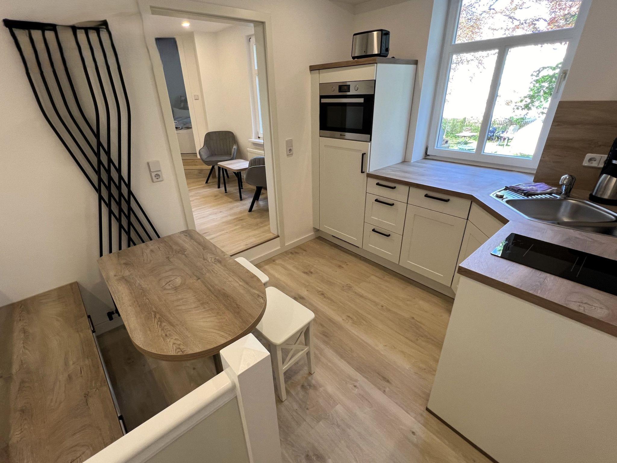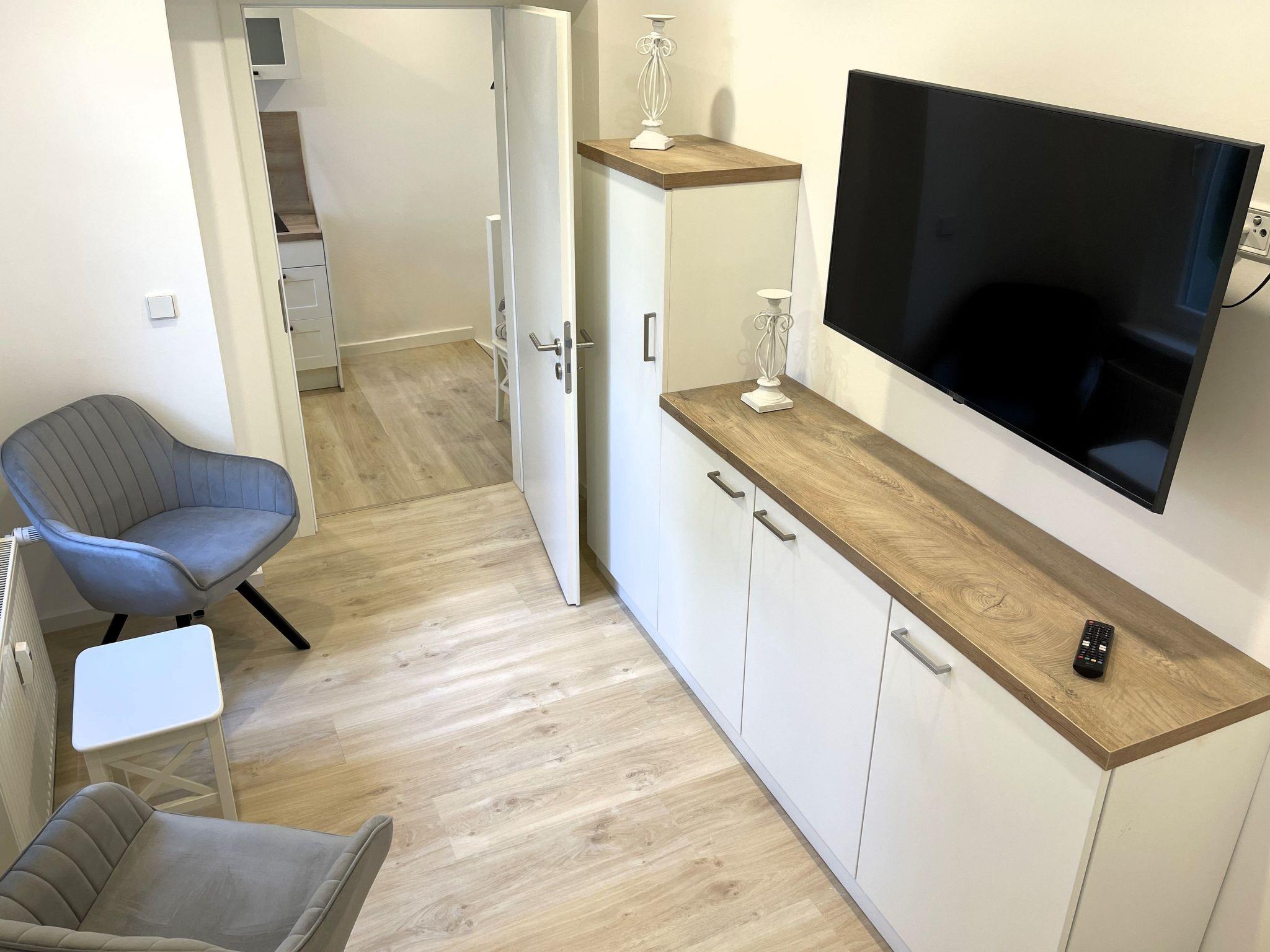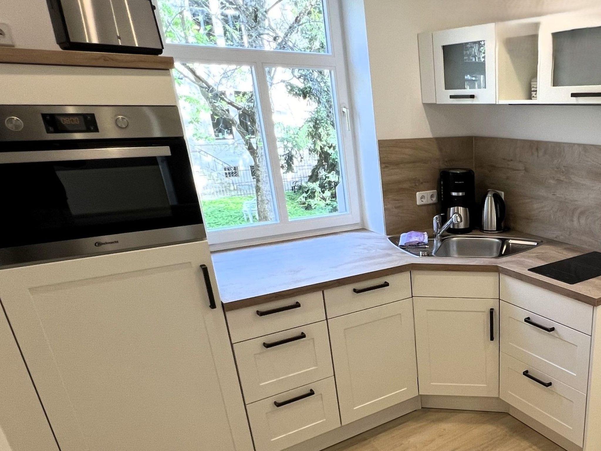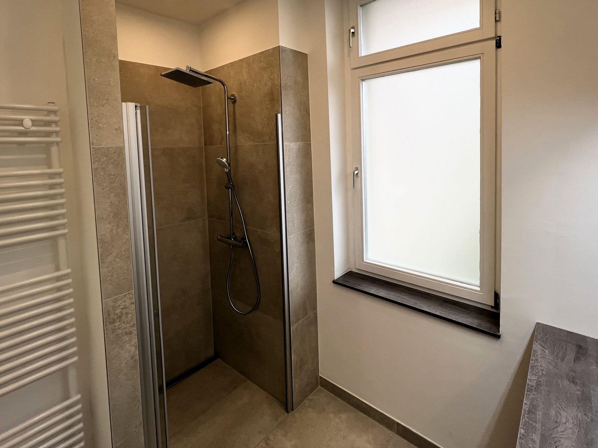 The completely renovated flat was refurbished in May 2024 and is located on the mezzanine floor of a historic art nouveau villa, surrounded by a large, lushly landscaped property. The 3-room flat has two separate bedrooms and offers bright, ground-floor rooms separated by doors. The flat is fully furnished and the kitchen is equipped with a dishwasher, cooker with oven, toaster, kettle, coffee machine, crockery, tea towels and cleaning products. There are two bathrooms, one of which has a WC and washbasin, while the other has a walk-in shower with a fixed partition, a washbasin and a washing machine that can be used alone. The bedroom has been furnished in a circular turret and offers a stylish ambience with a high-quality large double bed (160 cm x 190 cm), two small turret windows, a large LED starry sky light and bedside lamps. An adjoining small living room has a seating area and a modern flat-screen TV. The second bedroom is designed as a combined living room/bedroom and offers a comfortable double bed (180 cm x 200 cm), a seating area as well as a built-in wardrobe and a modern flat-screen TV. Free WLAN is available throughout the accommodation.