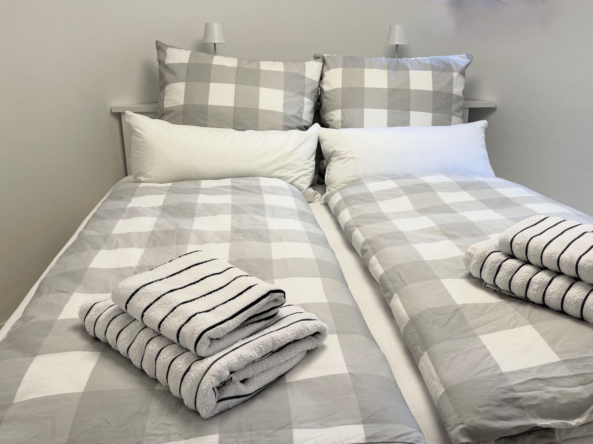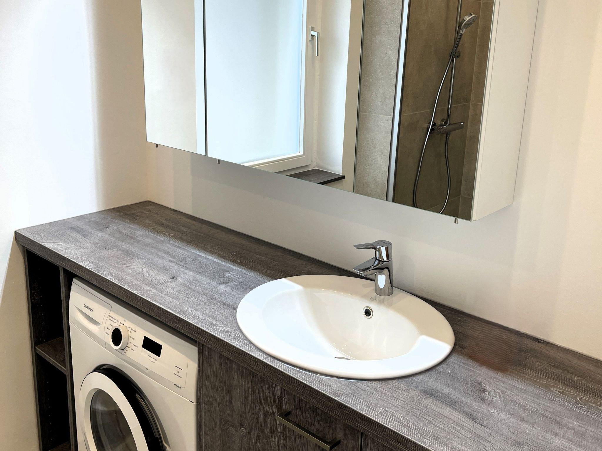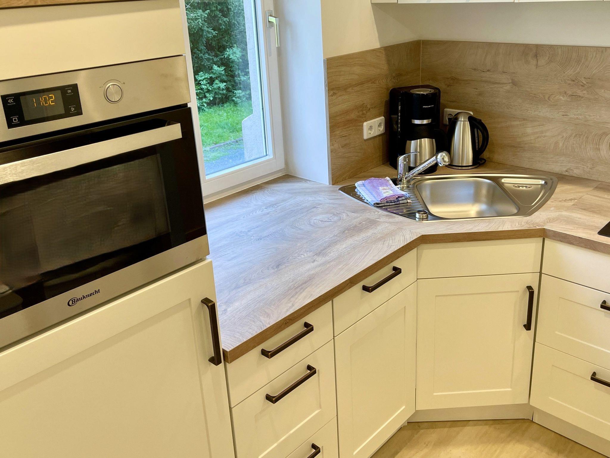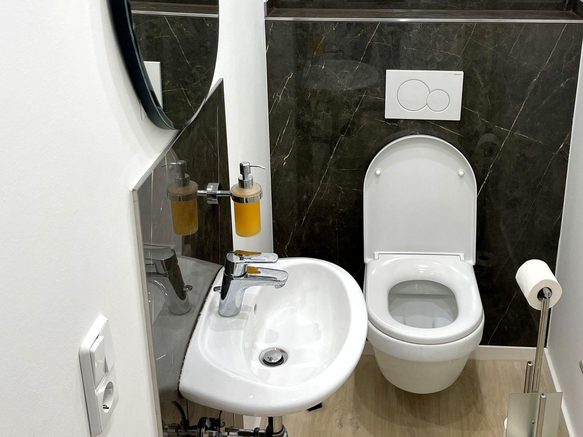 The completely renovated flat was refurbished in May 2024 and is located on the mezzanine floor of a historic art nouveau villa, surrounded by a large, lushly landscaped property. The 3-room flat has two separate bedrooms and offers bright, ground-floor rooms separated by doors. The flat is fully furnished and the kitchen is equipped with a dishwasher, cooker with oven, toaster, kettle, coffee machine, crockery, tea towels and cleaning products. There are two bathrooms, one of which has a WC and washbasin, while the other has a walk-in shower with a fixed partition, a washbasin and a washing machine that can be used alone. The bedroom has been furnished in a circular turret and offers a stylish ambience with a high-quality large double bed (160 cm x 190 cm), two small turret windows, a large LED starry sky light and bedside lamps. An adjoining small living room has a seating area and a modern flat-screen TV. The second bedroom is designed as a combined living room/bedroom and offers a comfortable double bed (180 cm x 200 cm), a seating area as well as a built-in wardrobe and a modern flat-screen TV. Free WLAN is available throughout the accommodation.