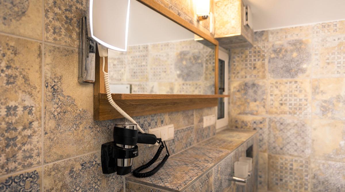 Komfortfaciliteter på badeværelset (hårtørrer, shampoo, hårbalsam, håndsæbe og brusegel)