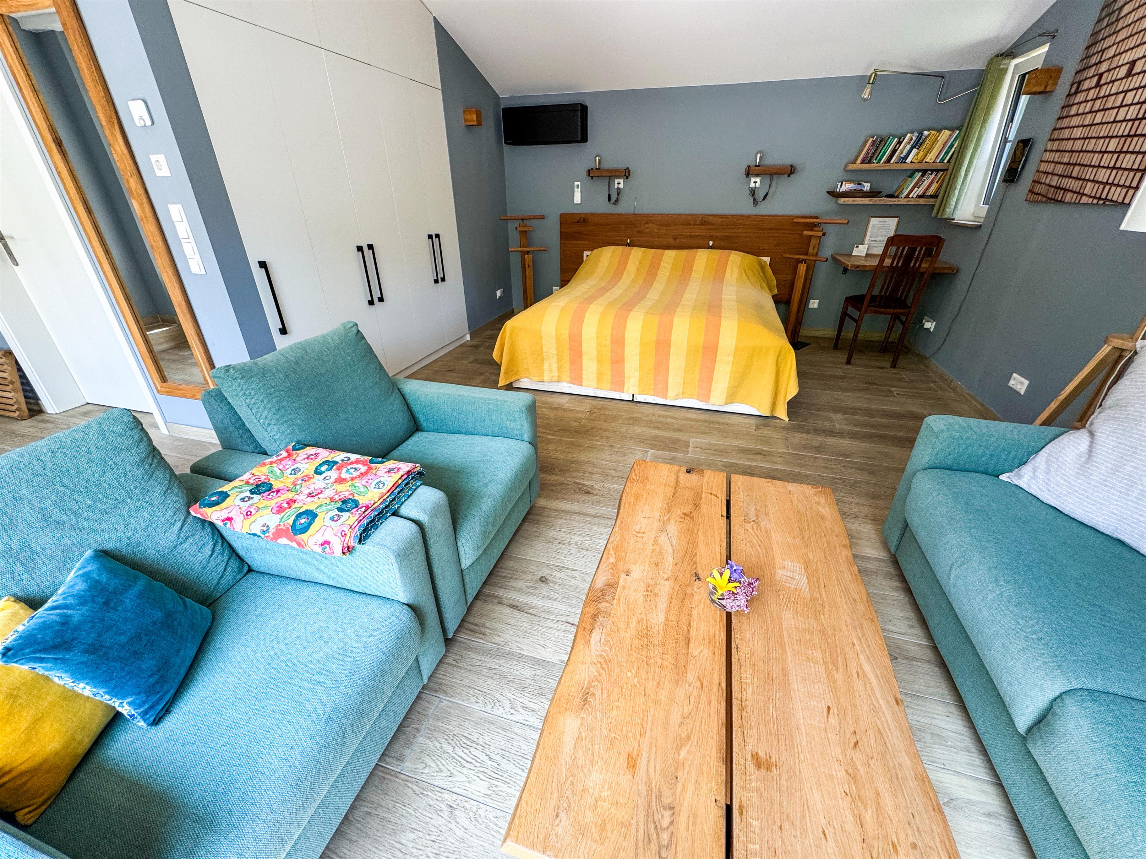 Natürlich haben wir an die kleineren Besucher gedacht und auch einen Kinderstuhl bereitgestellt. Im Wohn- / Schlafzimmer sind auf 28 qm zwei Betten (die zusammen oder getrennt gestellt werden können) und ein Schlafsofa mit zwei Sesseln untergebracht.