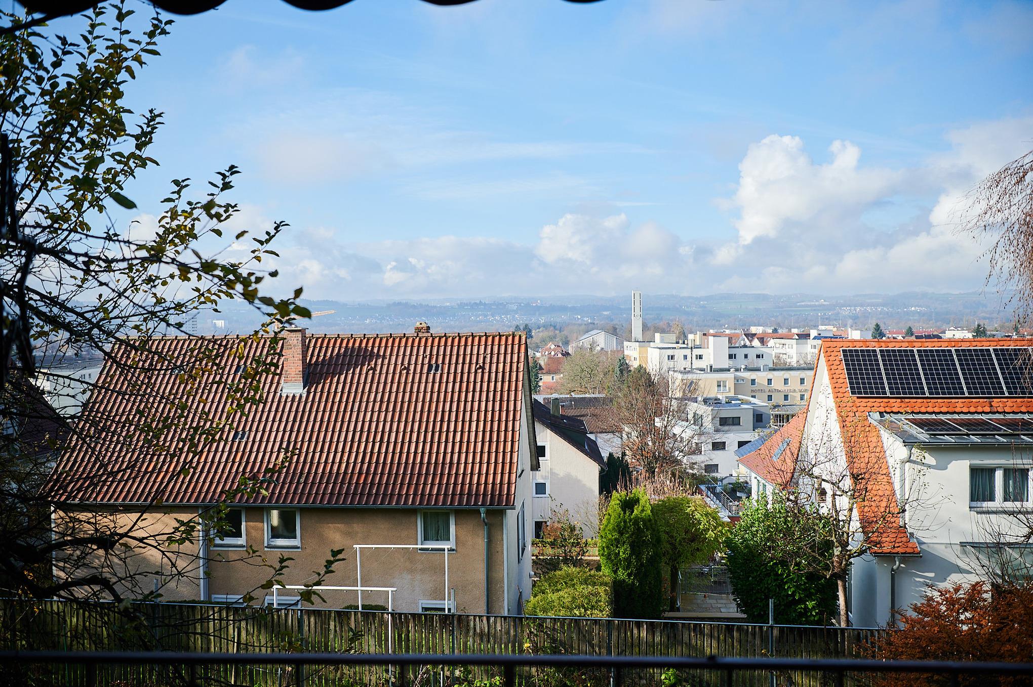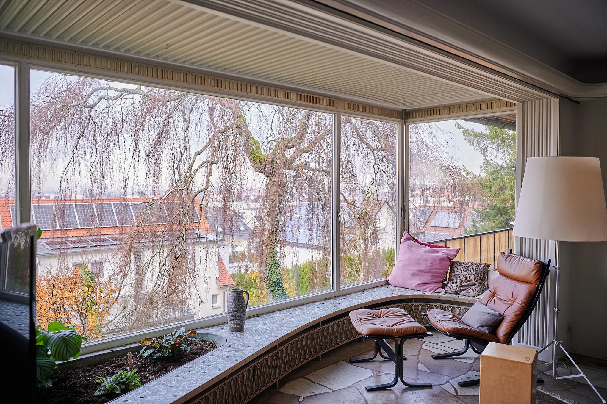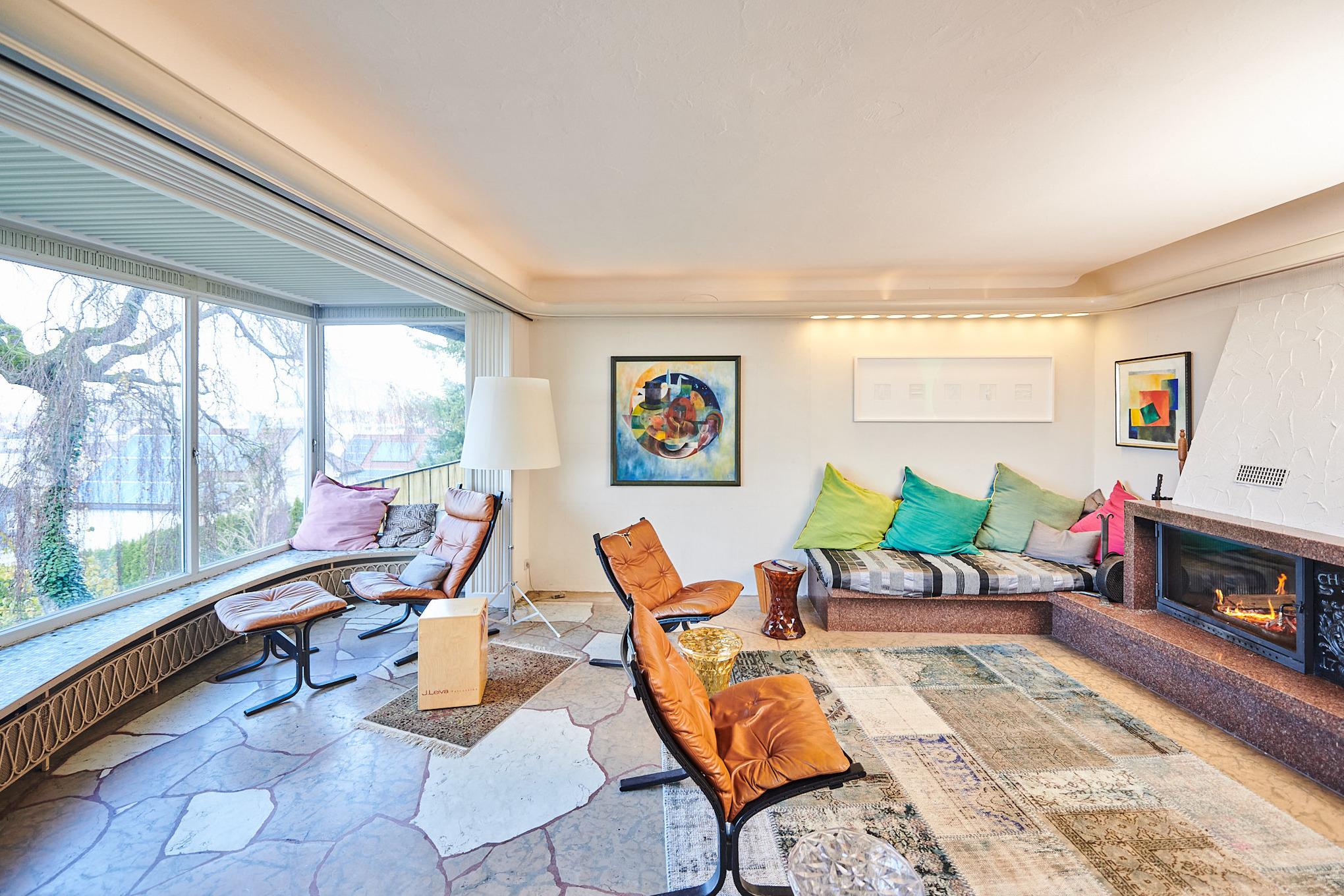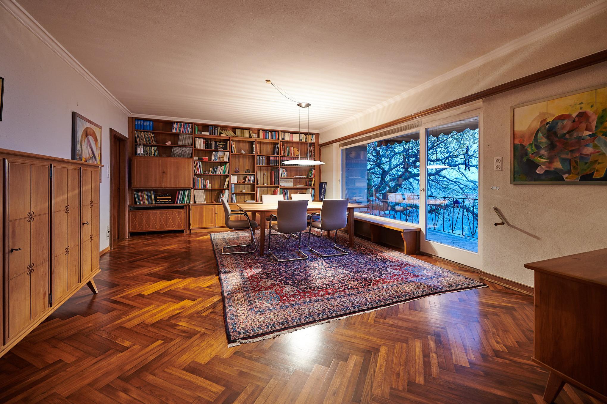 Kamin- und Wohnzimmer zeigen den 50er-Unternehmer-Life-Style: Platz in Hülle und Fülle, edler Marmor, Indoor- Blumenbeet und Fischgräten-Walnussparkett. Die Panorama-Fenster in den Westen mit Blick über das ganze Schussenbecken laden zum sitzen und Ausblick genießen ein. In beiden Räumen kann man mit 10 bis 15 Personen gut arbeiten.