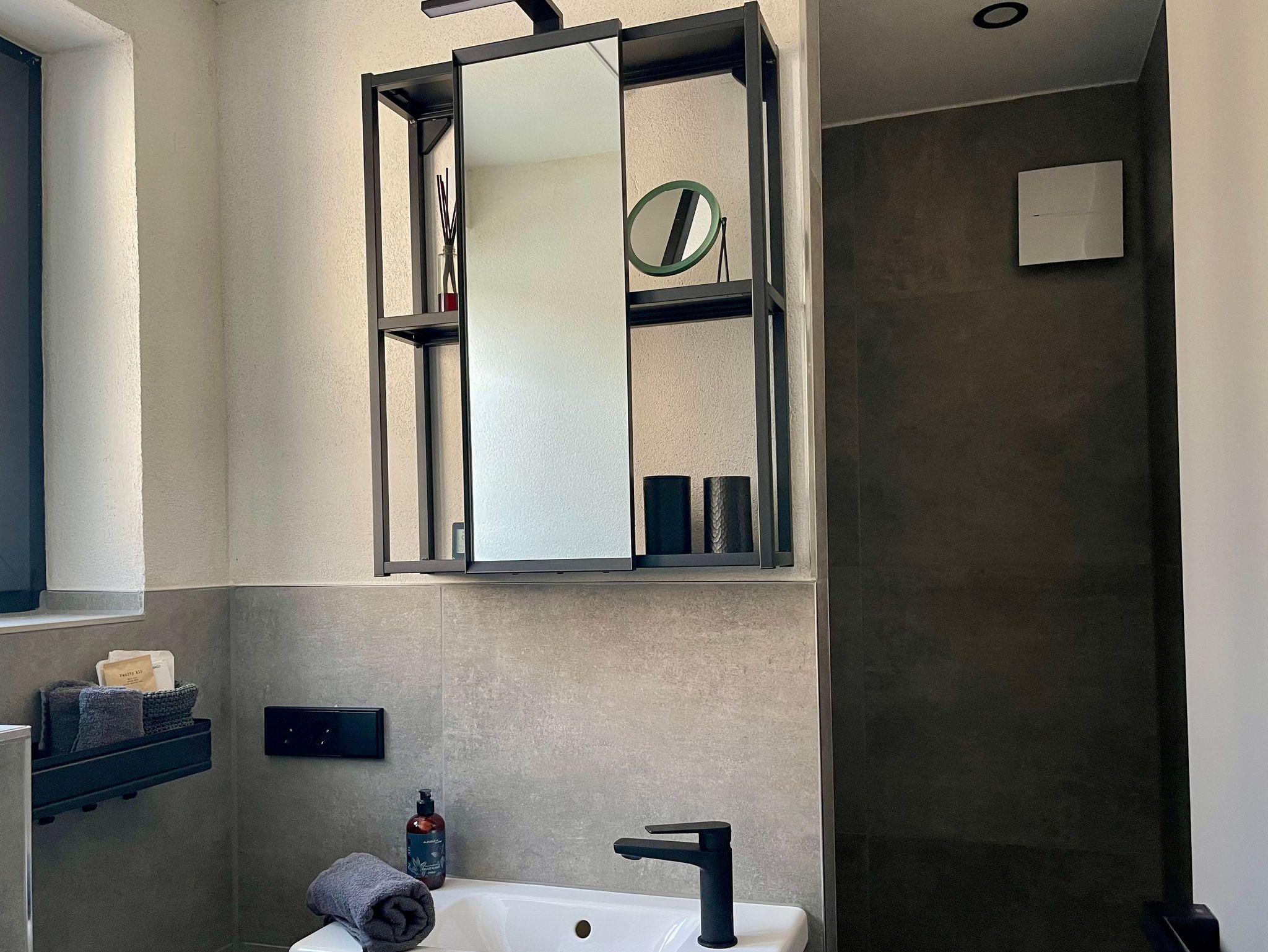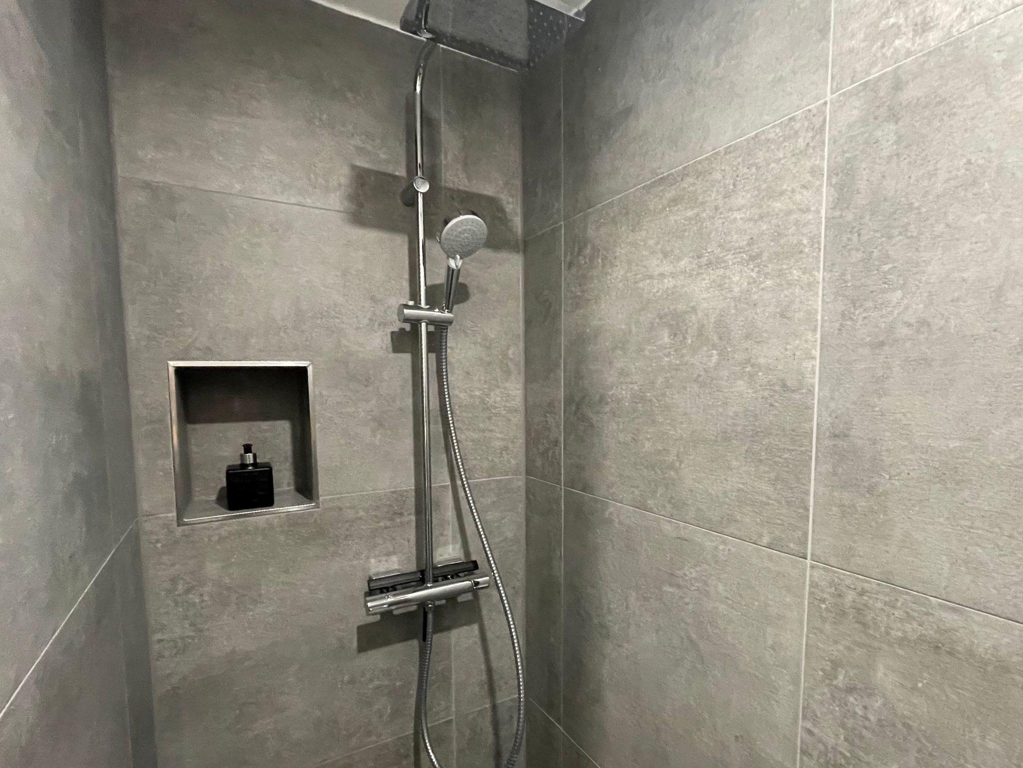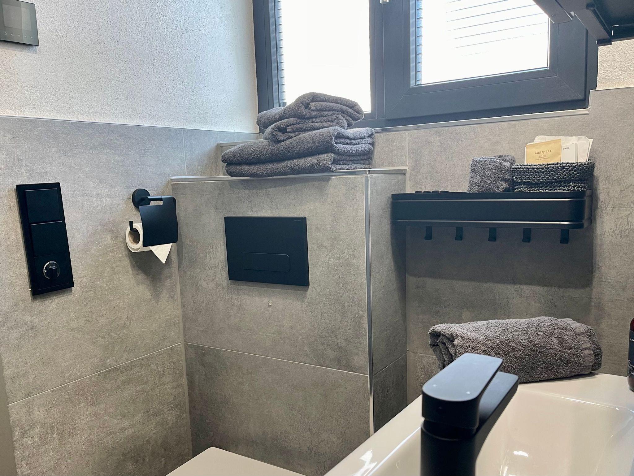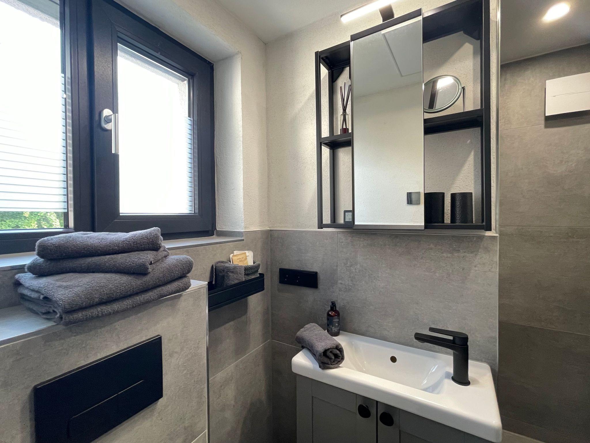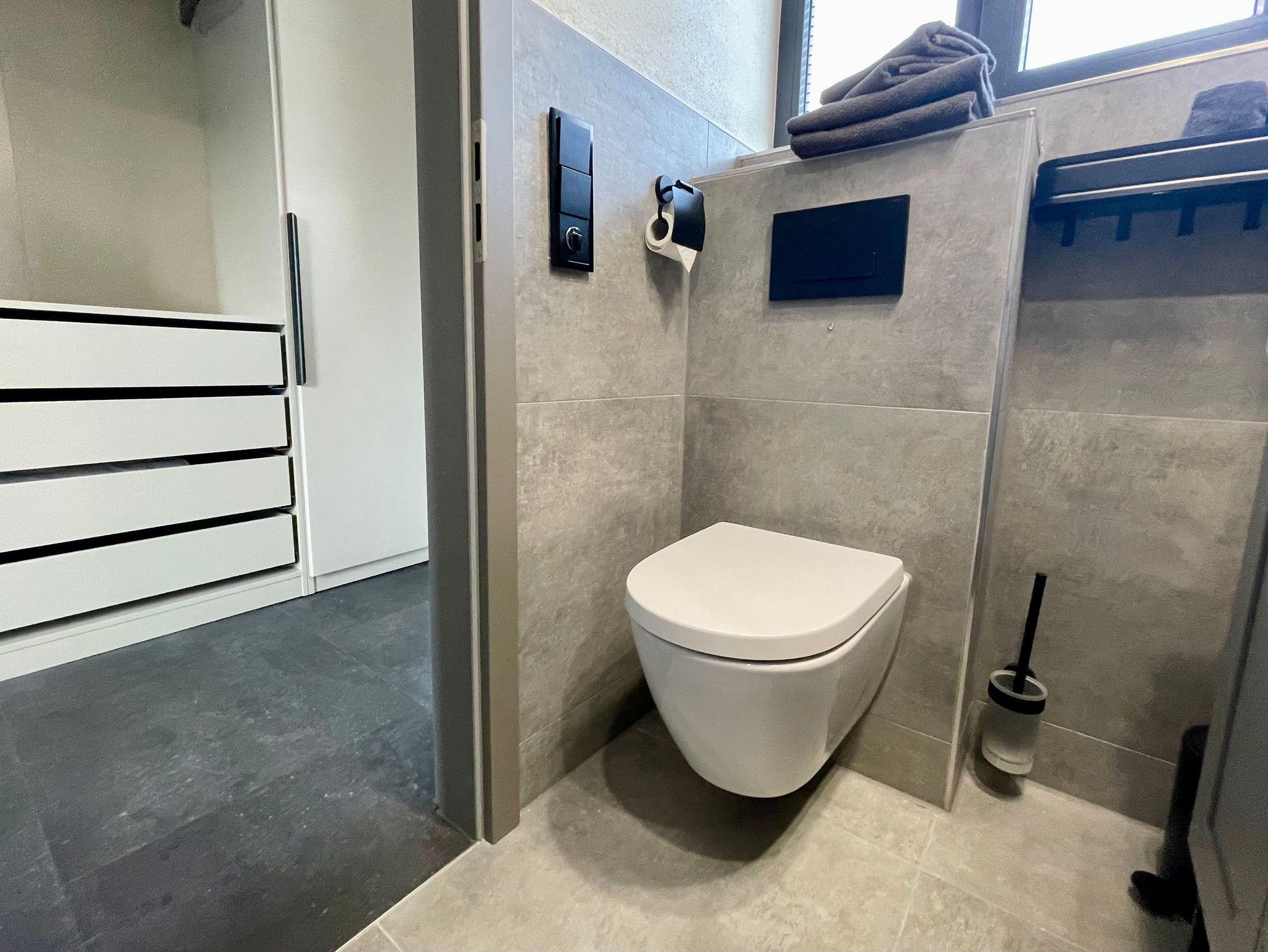 Im 1. Obergeschoss erwartet Gäste ein modernes Bad mit begehbarer Rain-Shower-Dusche, Fußboden- und Infrarotdeckenheizung sowie ein kleiner Arbeitsplatz mit LAN-Anschluss und Digitalradio. Ein großer Kleiderschrank sorgt für zusätzlichen Stauraum.