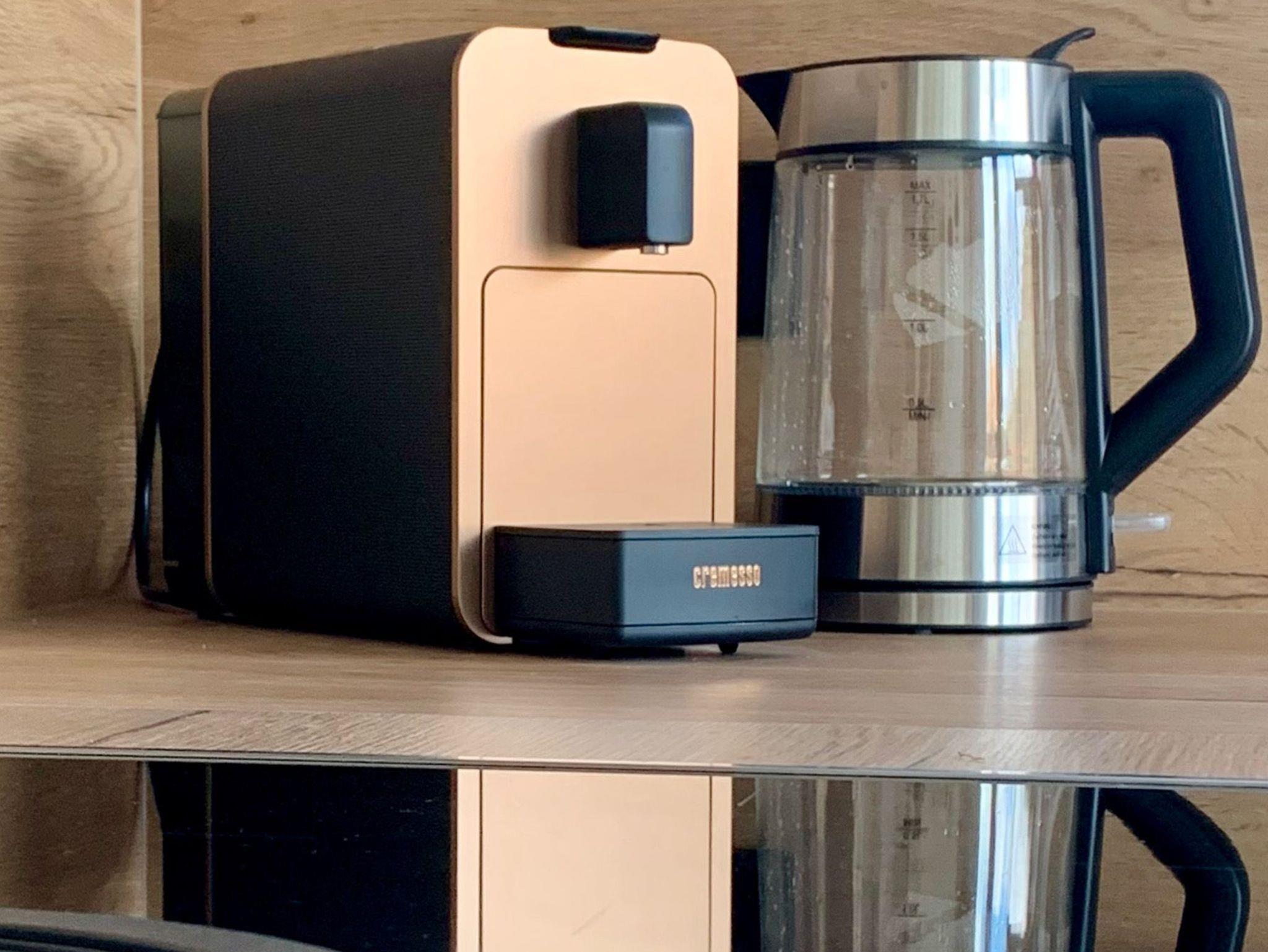 Im 3. Obergeschoss liegt das Herzstück des Turms: eine voll ausgestattete Designerküche mit Bora-Kochfeld, Backofen, Mikrowelle, Spülmaschine, Kühlschrank, Kapsel- & Filterkaffeemaschine, Toaster, Wasserkocher, Eierkocher und Heißluftfritteuse. Der Essplatz mit LAN-Anschluss und das Liegefenster mit Aussicht machen diesen Raum zum Wohlfühlort. Ein großer Smart-TV ergänzt den Wohnkomfort.