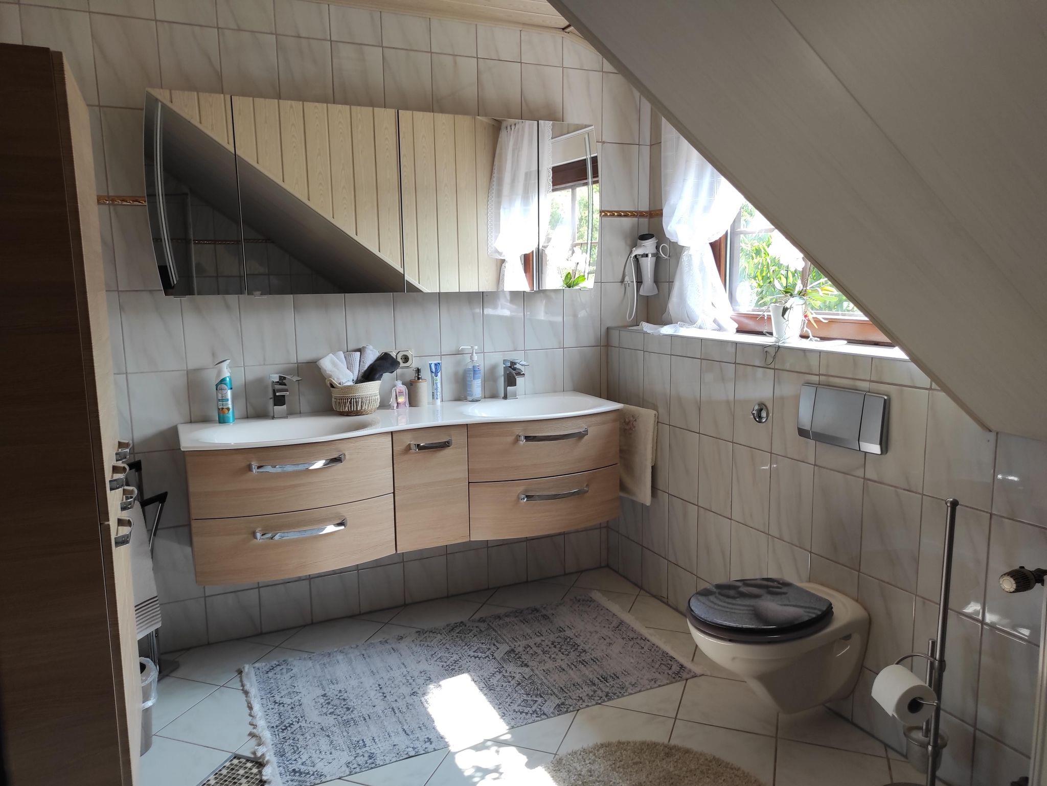 Das Bad verfügt über eine Badewanne, Dusche, WC und Waschtisch.
