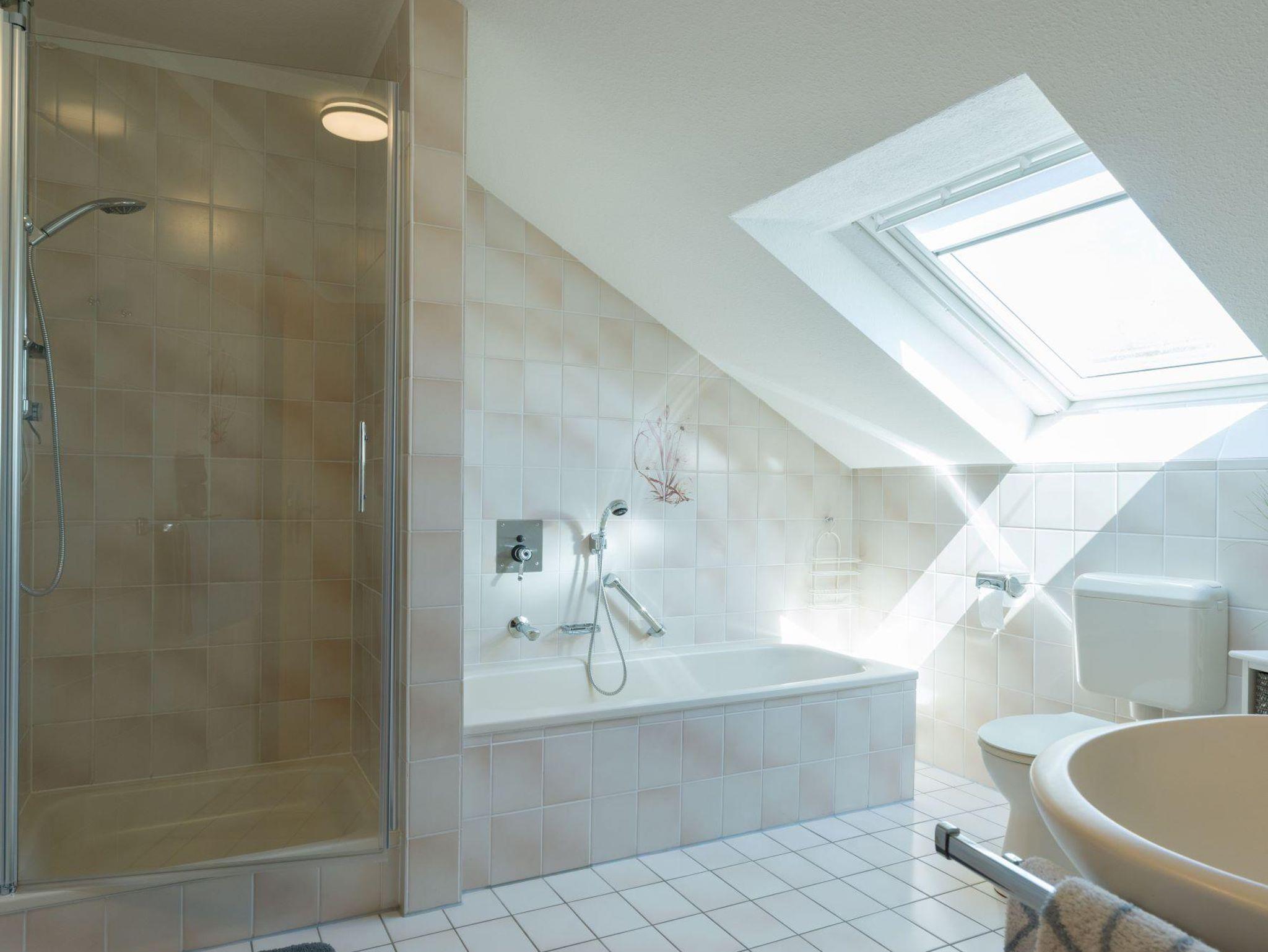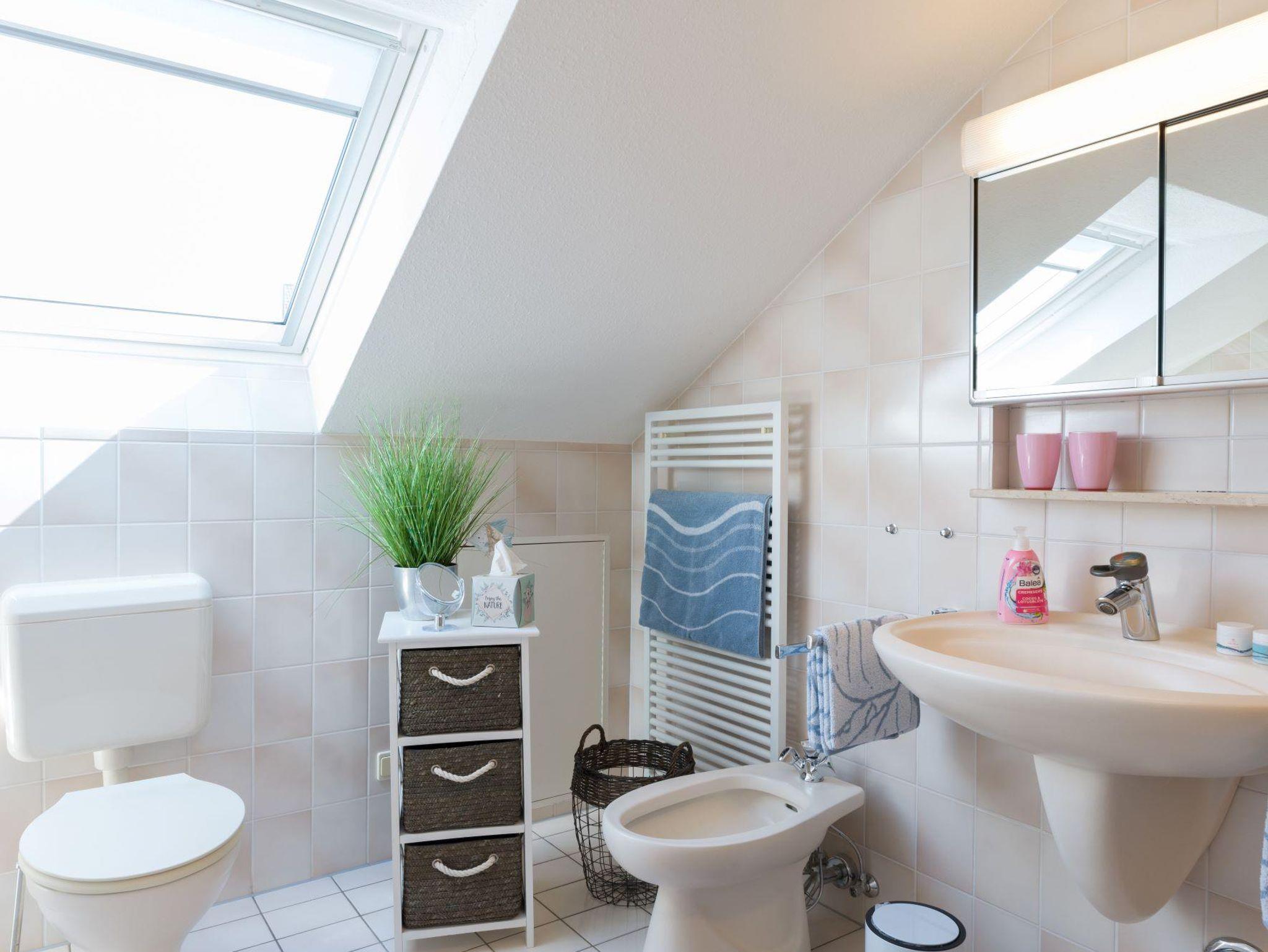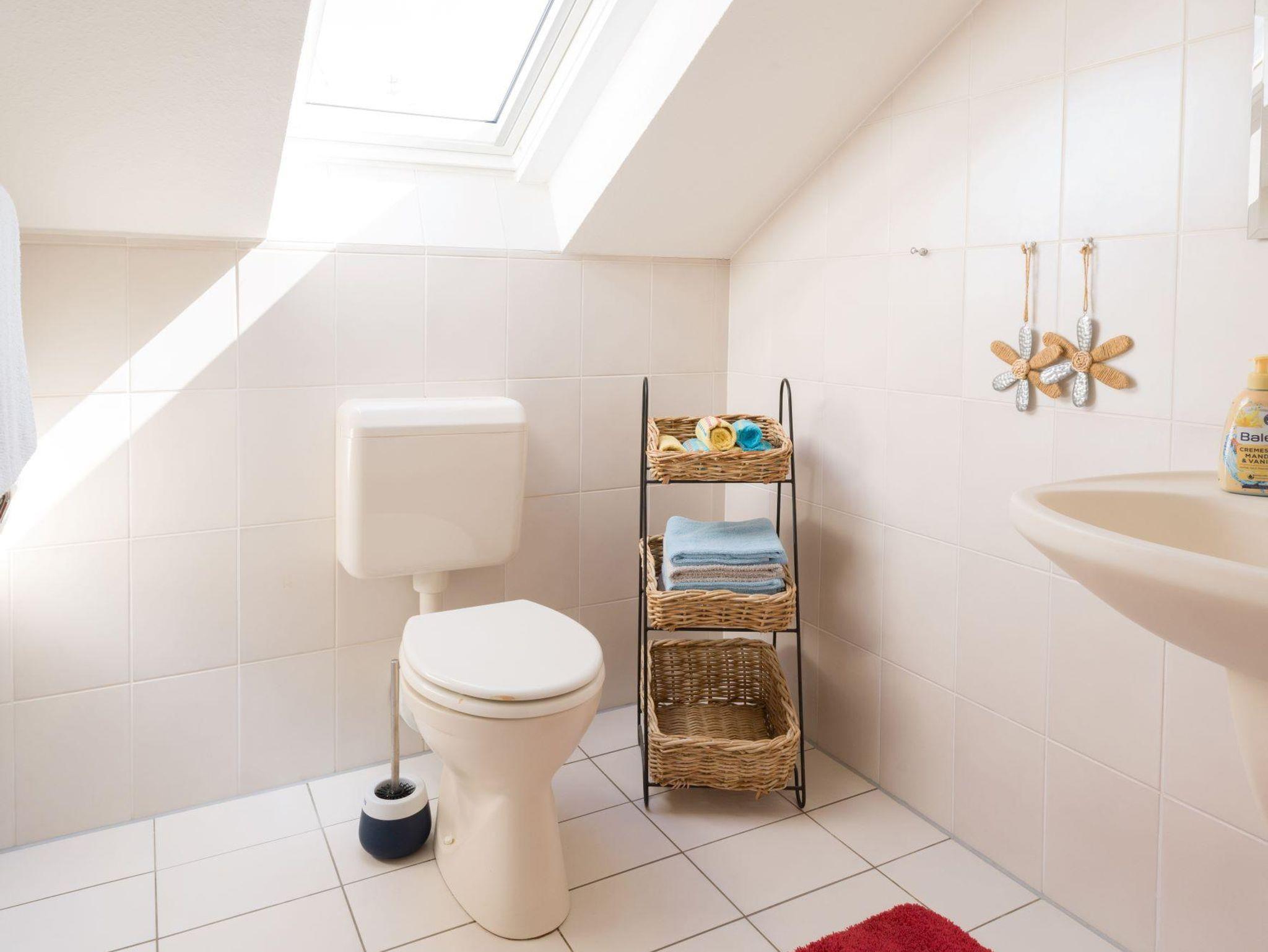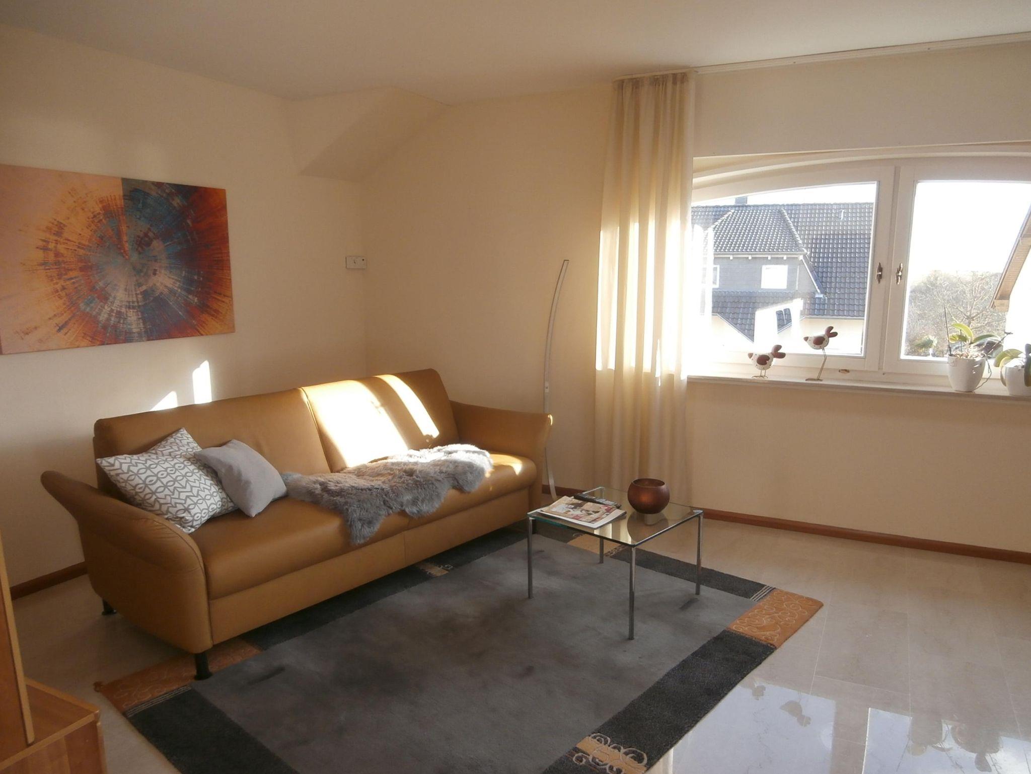 Großzügige, sonnendurchflutete DTV klassifizierte 4 Sterne Ferienwohnung auf 80 qm mit offener Küche-Ess-/Wohnbereich (TV, WLAN) und Dachterrasse bietet Ihnen das perfekte Urlaubsambiente. Ein neu möbliertes Schlafzimmer mit Doppelbett 2,00 x 2,00 m und eine Schlafcouch 1,40 m x 2,00 m (auf der eine dritte Person für 20€ pro Person/Nacht übernachten kann) garantieren erholsamen Schlaf. Neben einem Bad mit Dusche, Badewanne, Bidet und WC bietet die Ferienwohnung ein zusätzliches Gäste-WC. In der Wohnung befindet sich ein Abstellraum sowie eine großzügige Dachterrasse mit Gartenmöbeln. Die Dachterrasse ist zugänglich vom Schlaf- und Esszimmer.