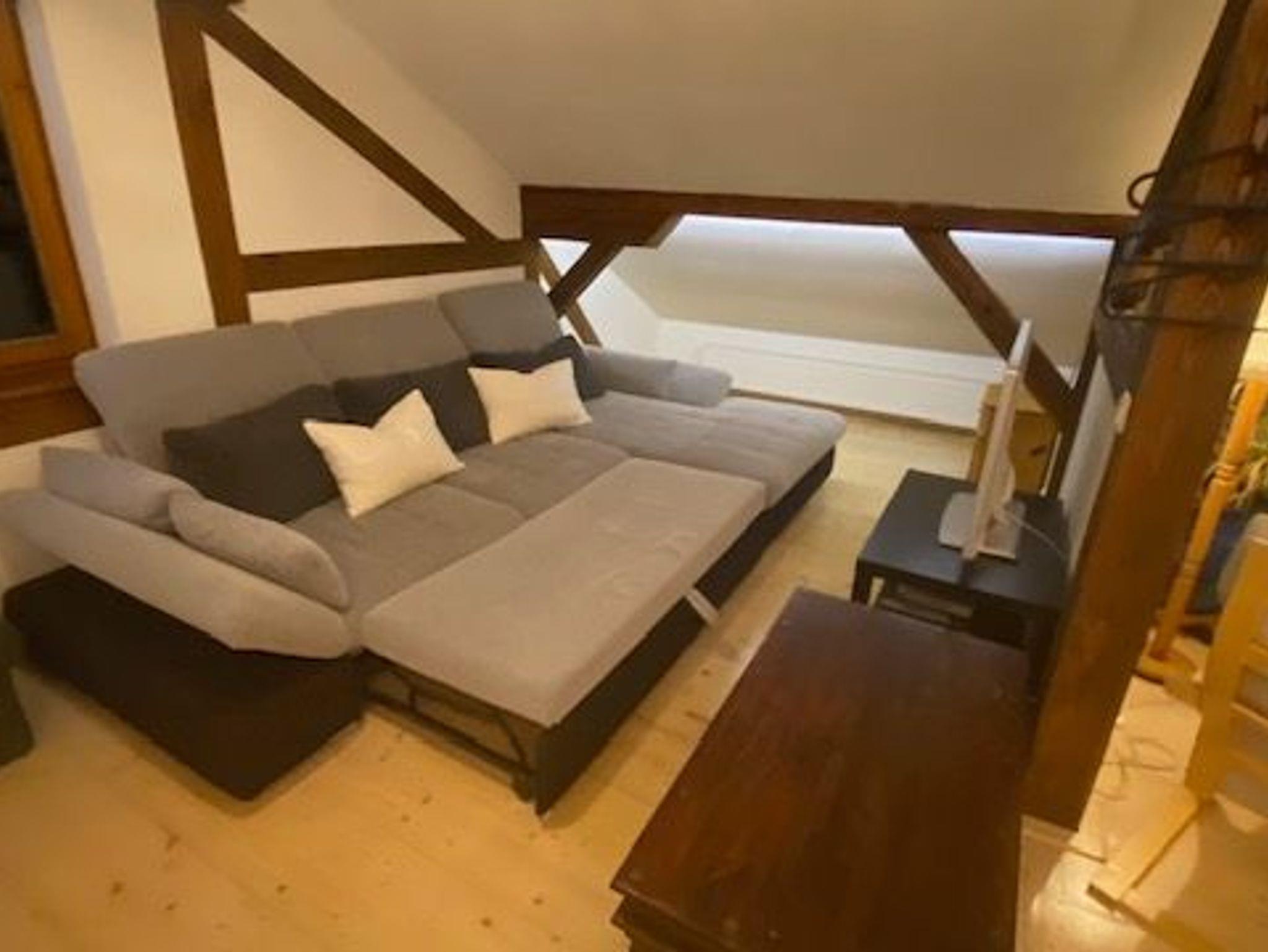 Dachgeschoss FeWo, 2017 Fertigstellung, ein großer Raum mit freiliegenden Balken, großen Dachfenstern und einem romantischen Kaminofen. Durch elektronische Rollos und guter Isolation auch im Hochsommer nicht zu heiß.