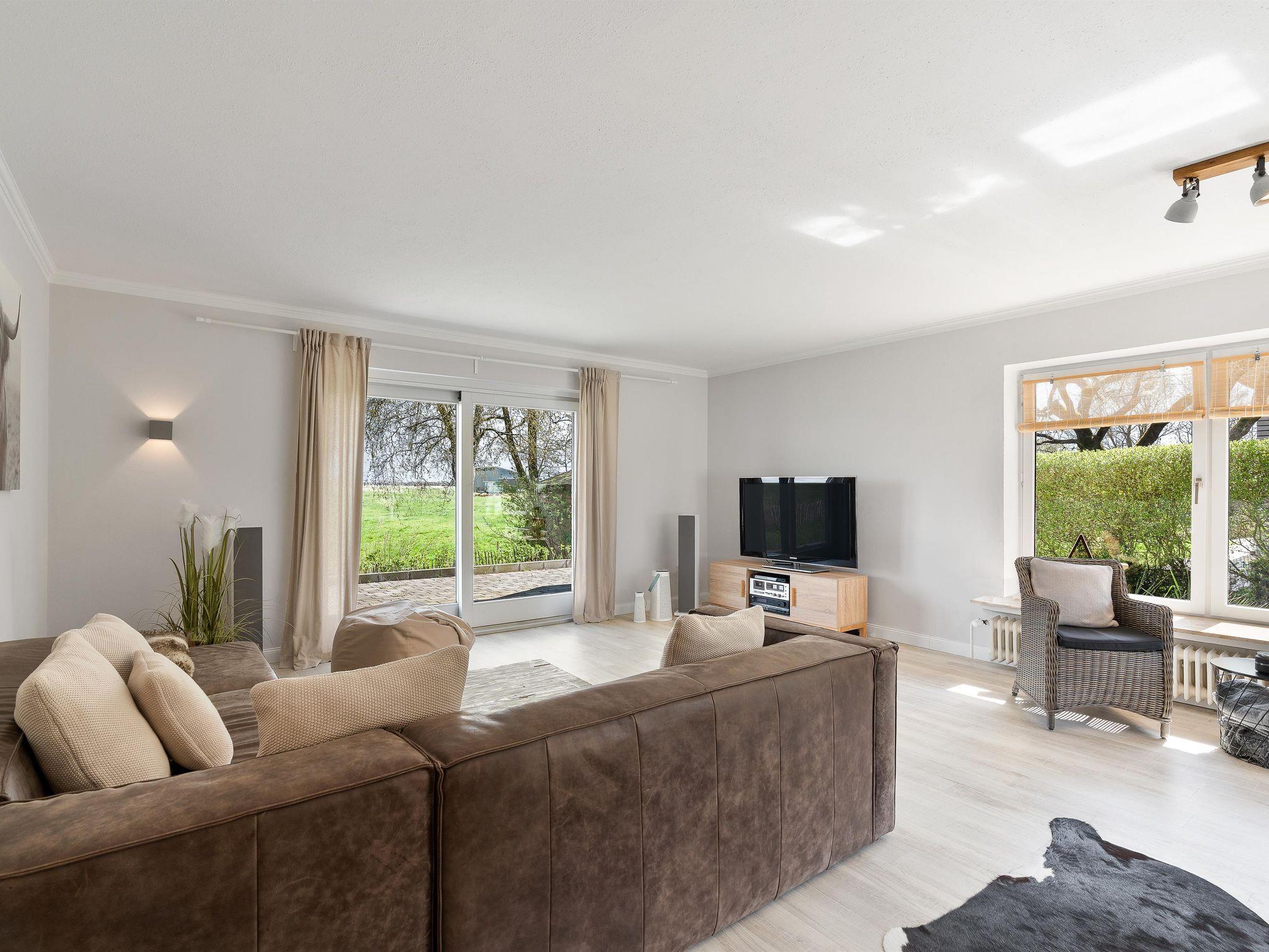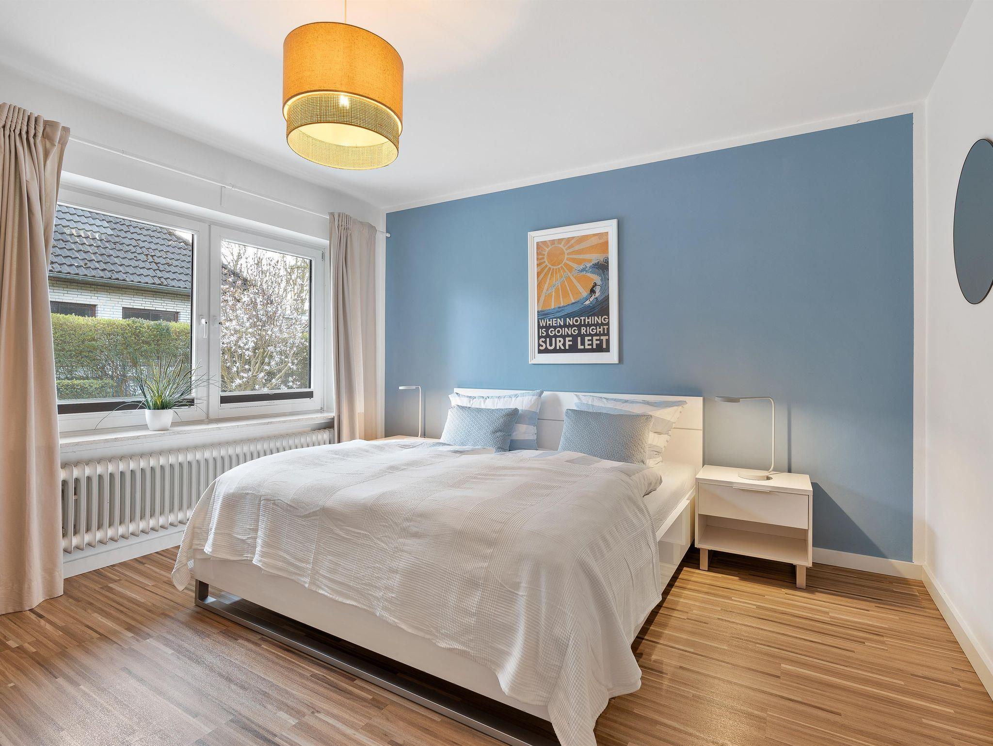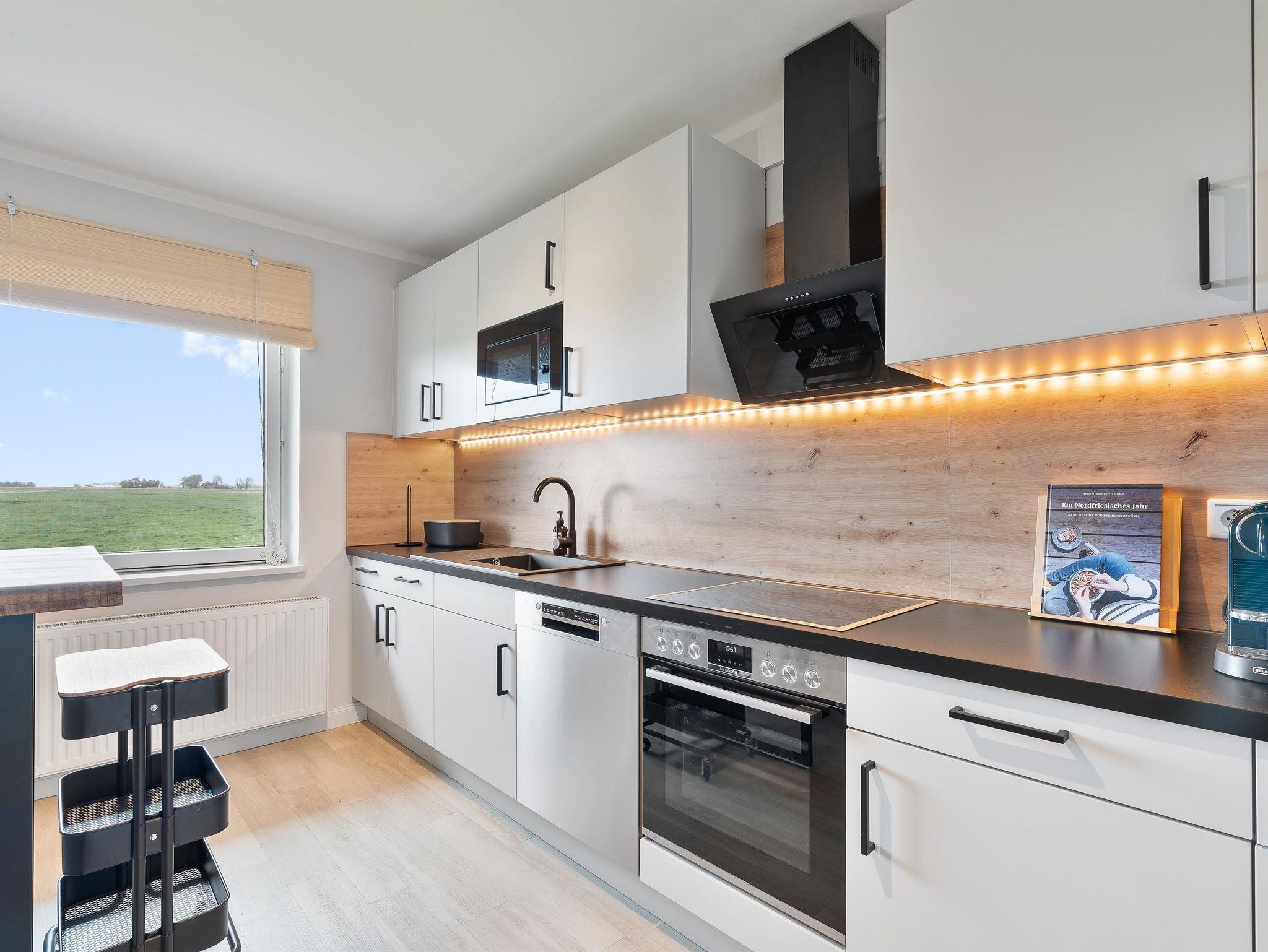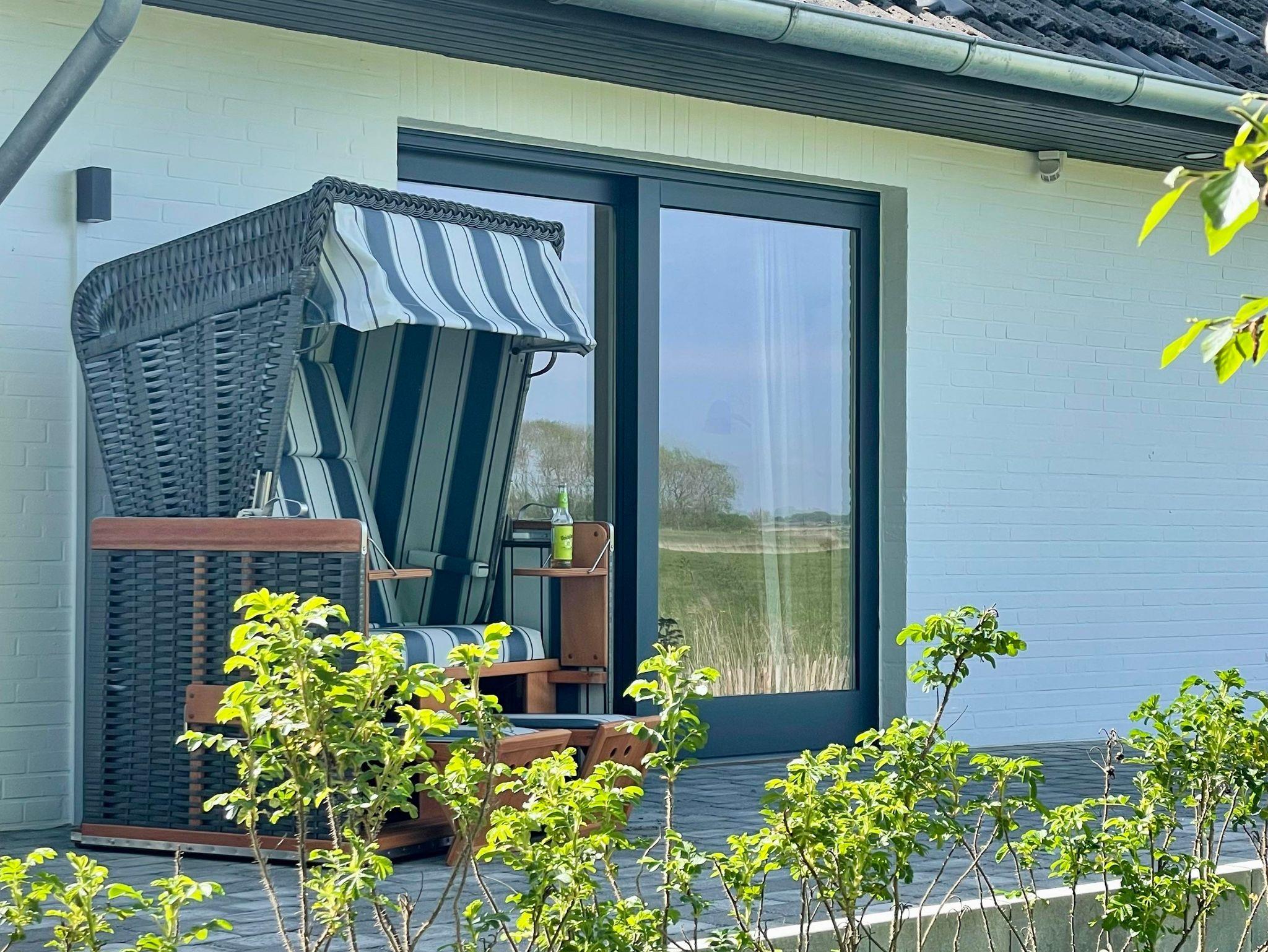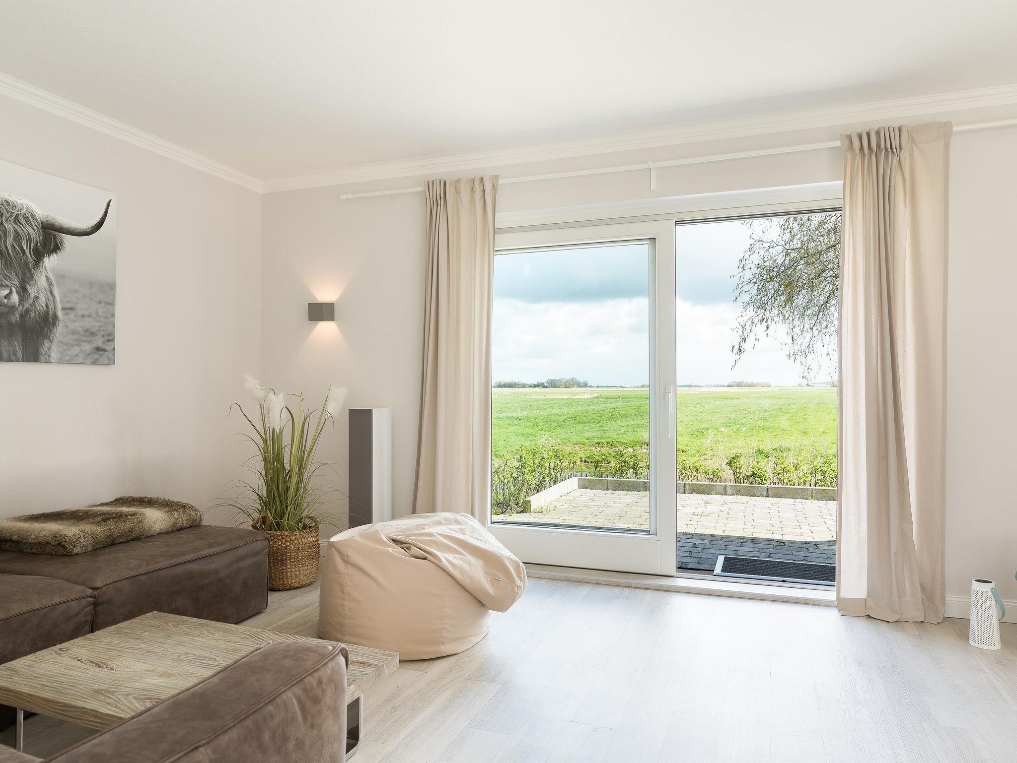 Davon zwei Schlafzimmer mit Doppelbett und ein Schlafzimmer mit zwei Einzelbetten. Die großen Panaoramafenster im Wohnzimmer bieten eine unvergleichliche Aussicht über die Eiderstedter Marsch.