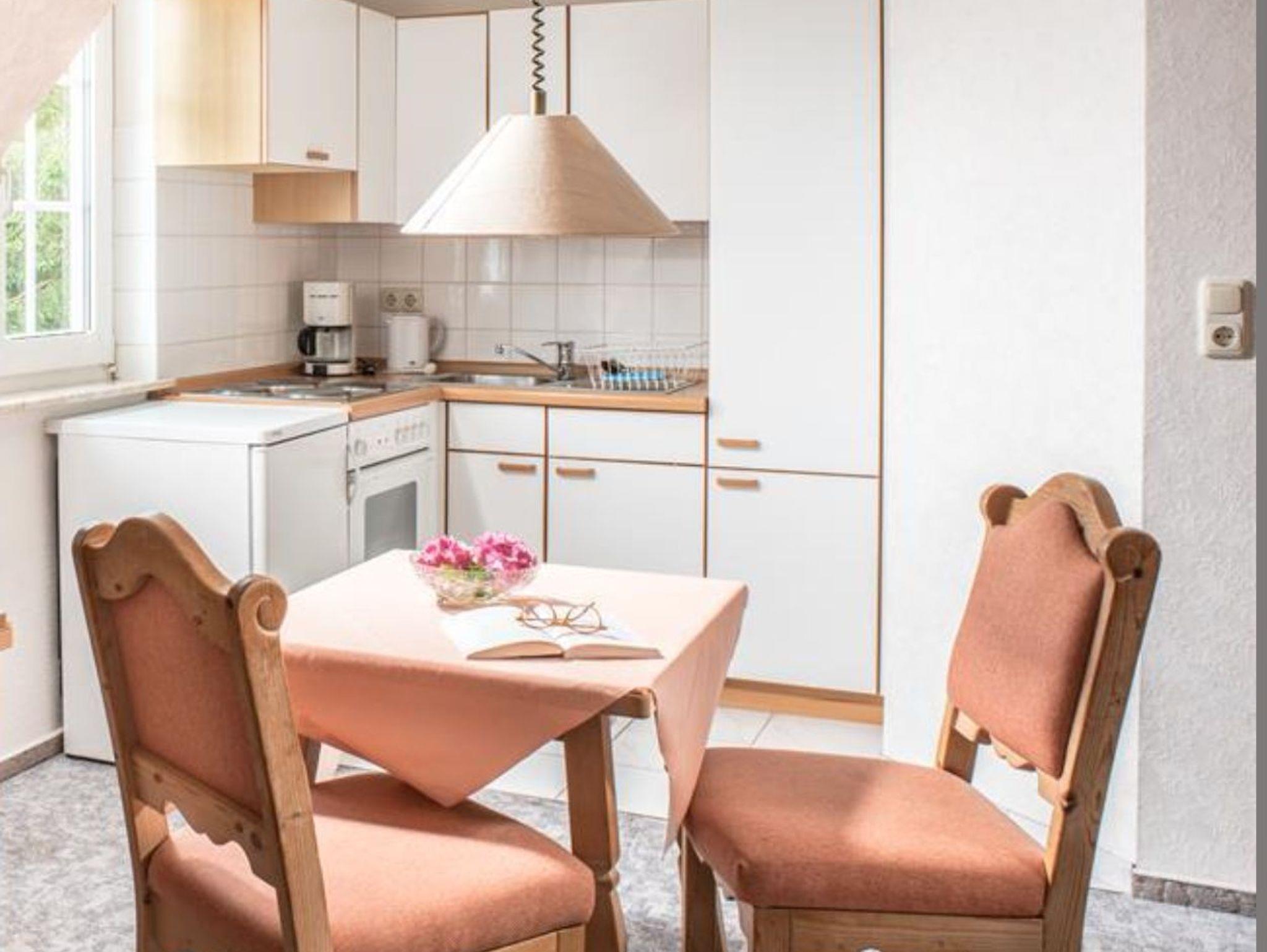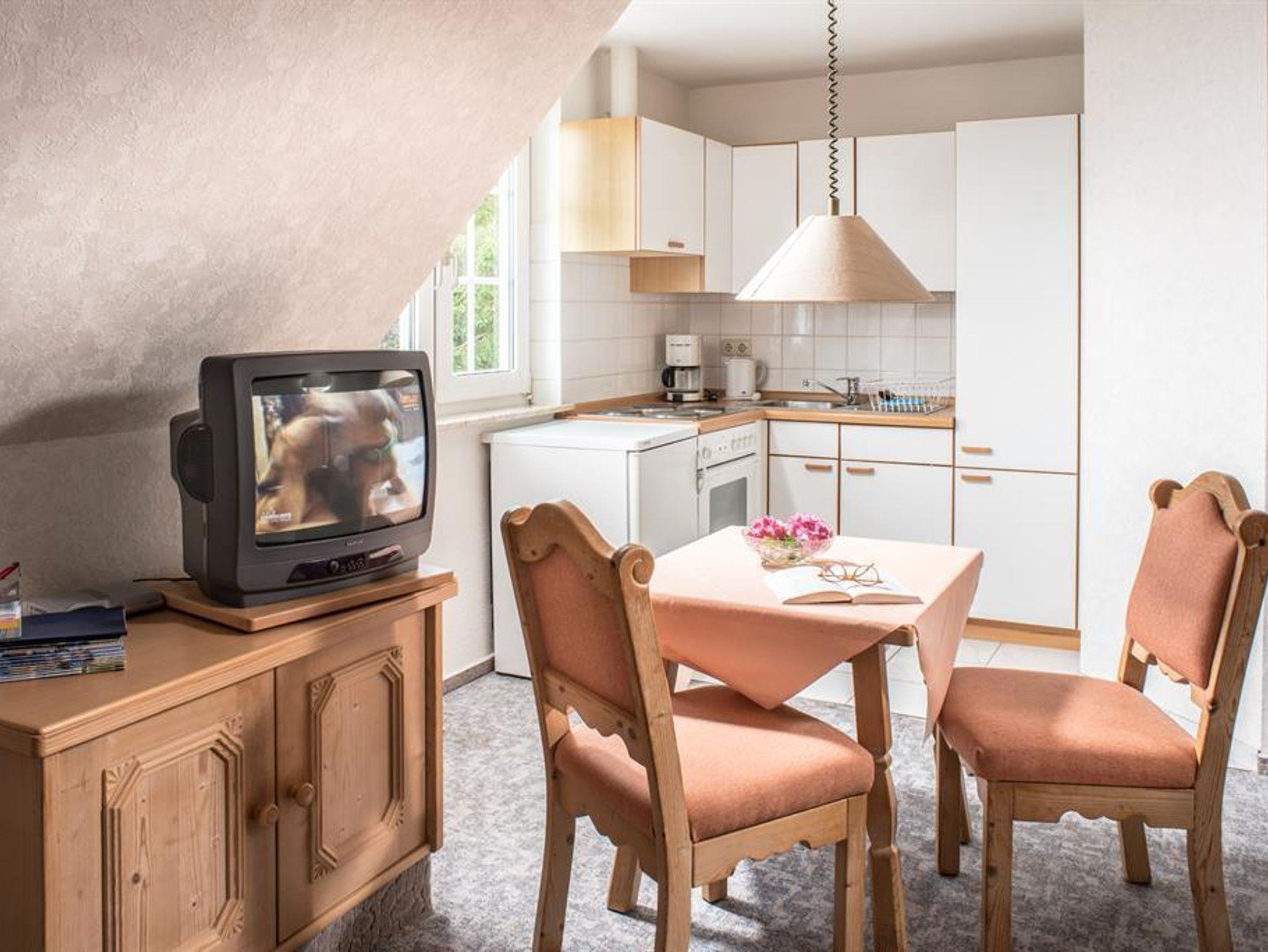 In unserem Zimmer 2 für 1-3 Personen erwartet Sie ein Doppelbett mit TV, viel Stauraum, eine kleine Sitzgruppe, eine Küchenzeile mit Elektroherd, Kaffeemaschine, Toaster, Kühlschrank und Backofen, sowie ein Duschbad mit WC.