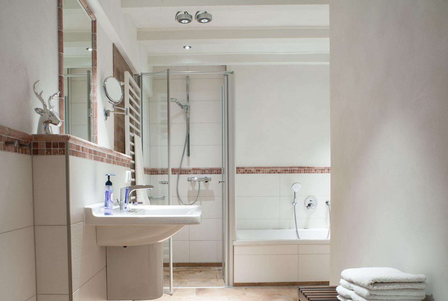 angrenzendem Bad mit Dusche, 1 Schlafzimmer mit Doppelbett, 1 Schlafzimmer mit
